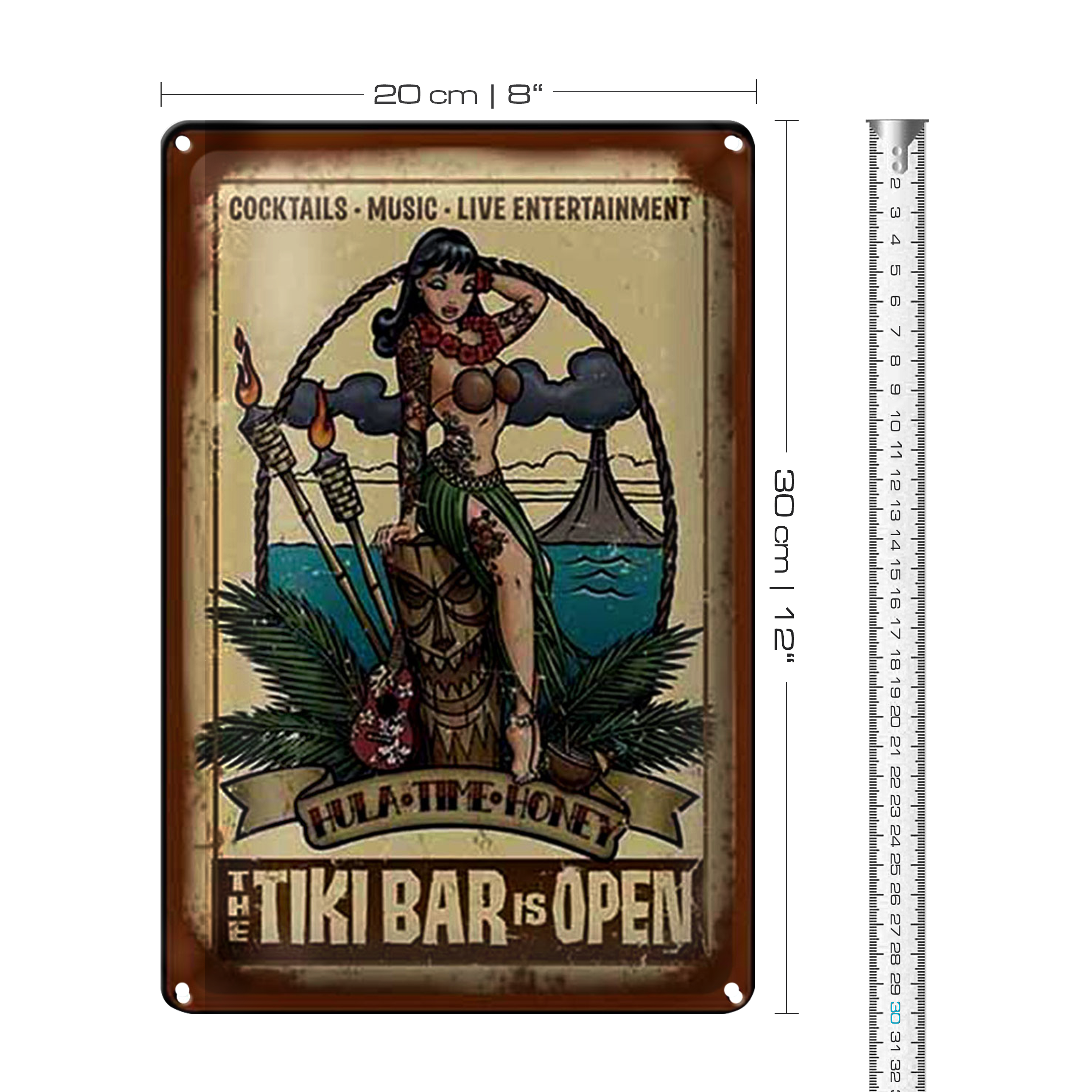 Blechschild Pin Up 20x30cm TIKI Bar is Open Cocktail Music