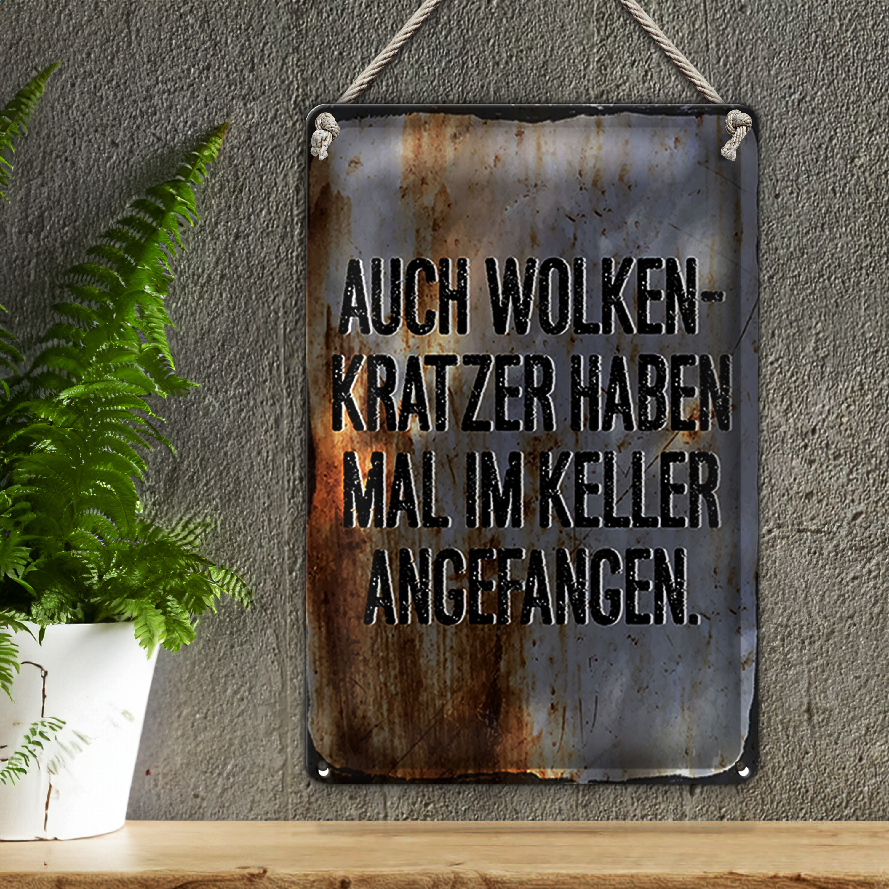 Blechschild Spruch 30x20cm Auch Wolkenkratzer haben im Keller angefangen