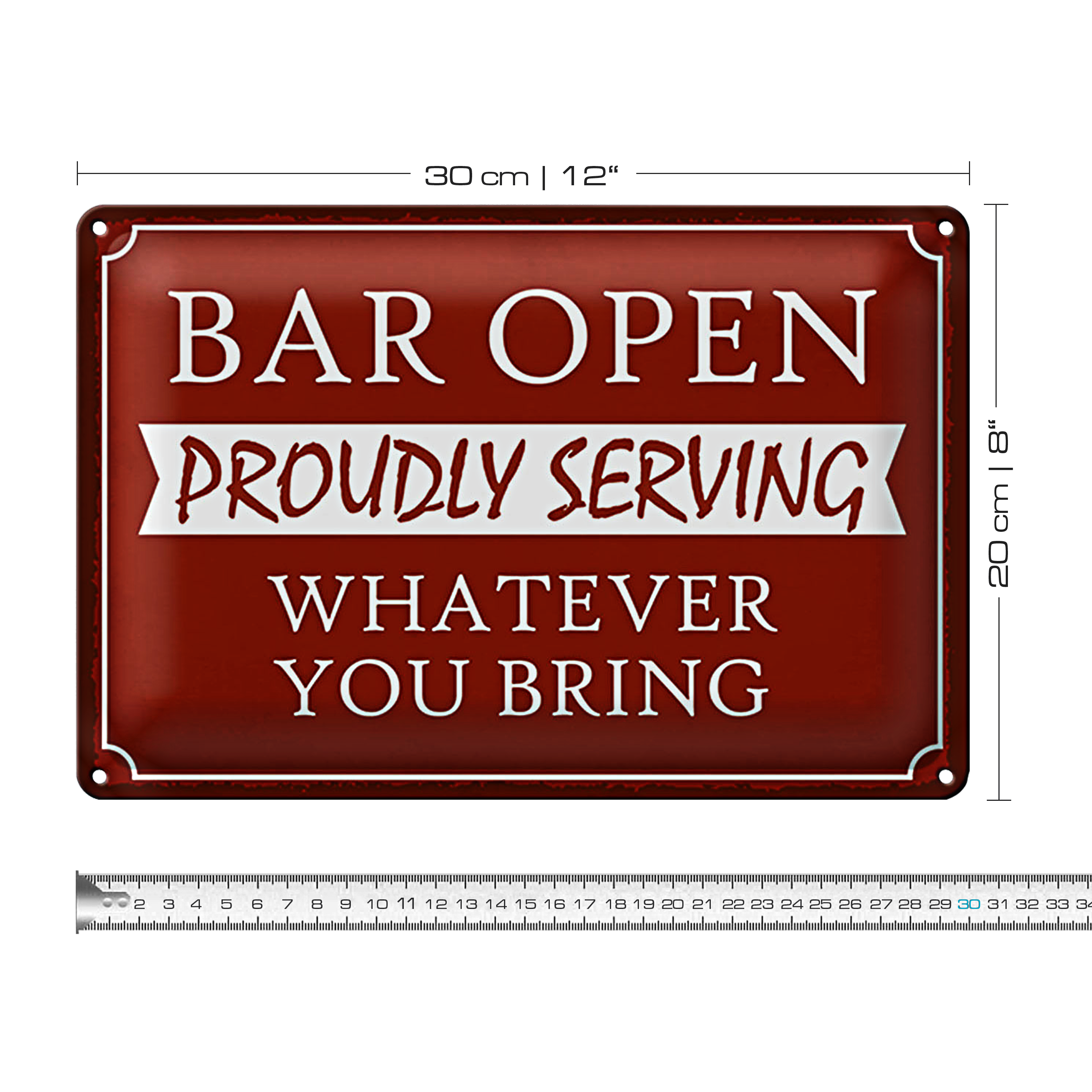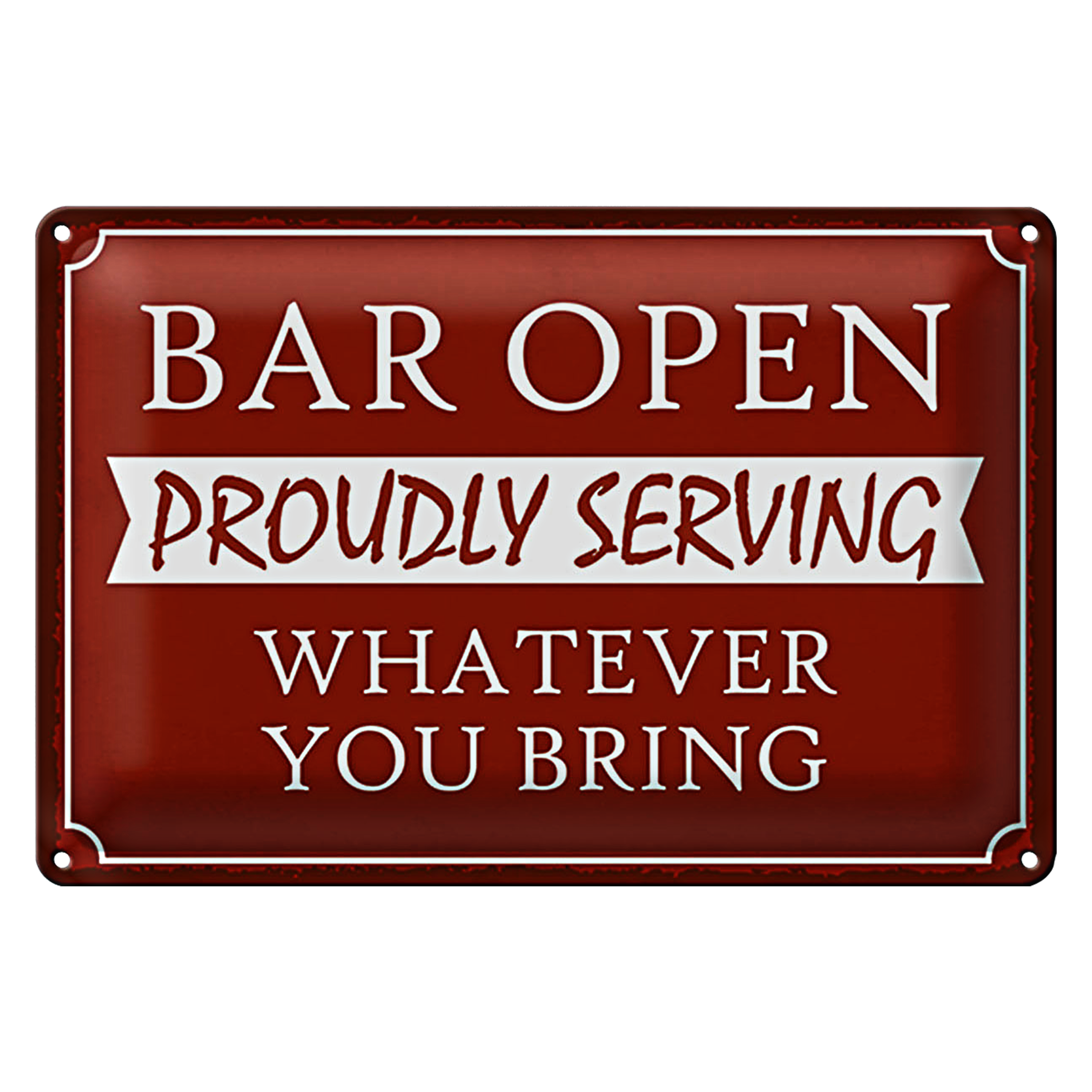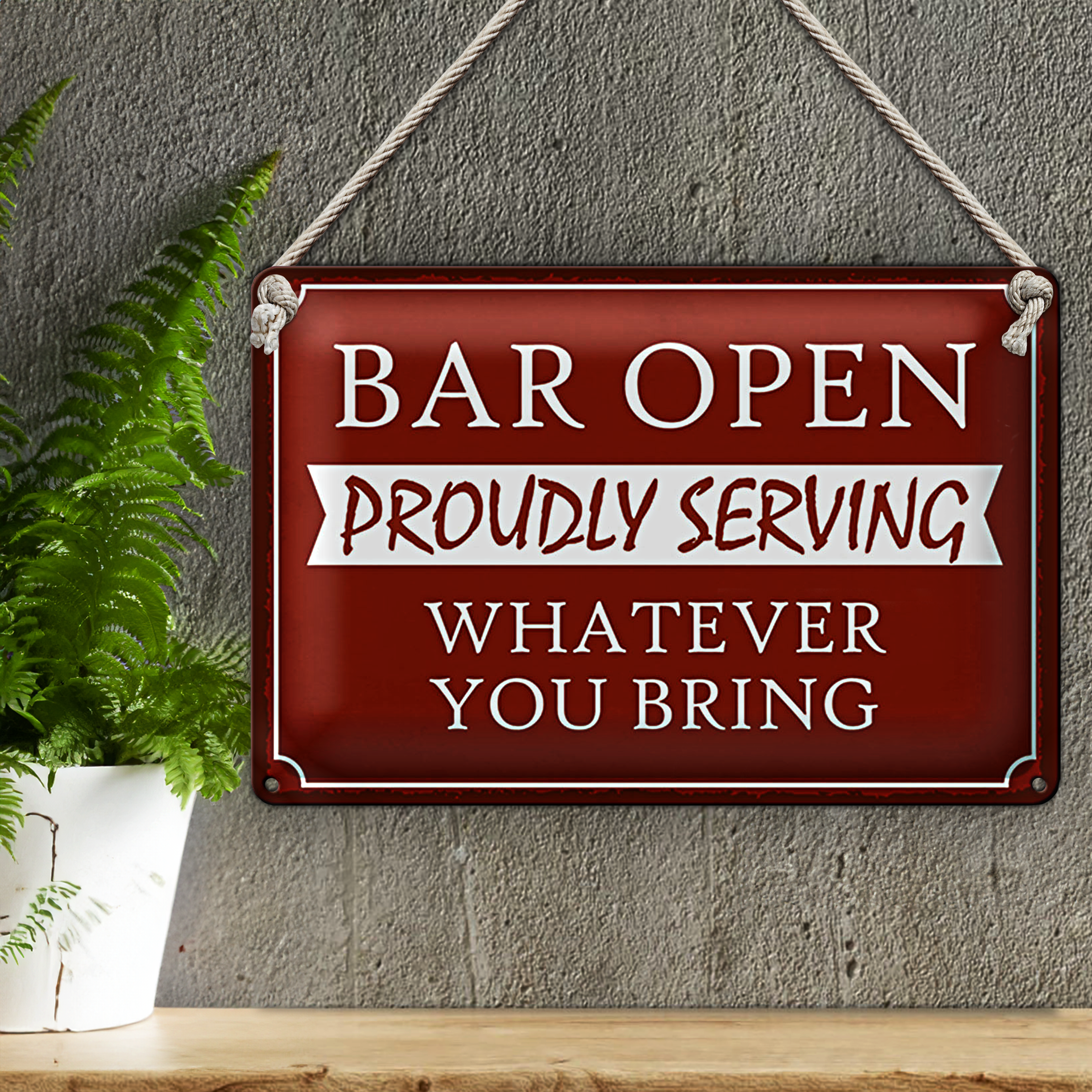 Blechschild Spruch 30x20cm Bar open proudly serving