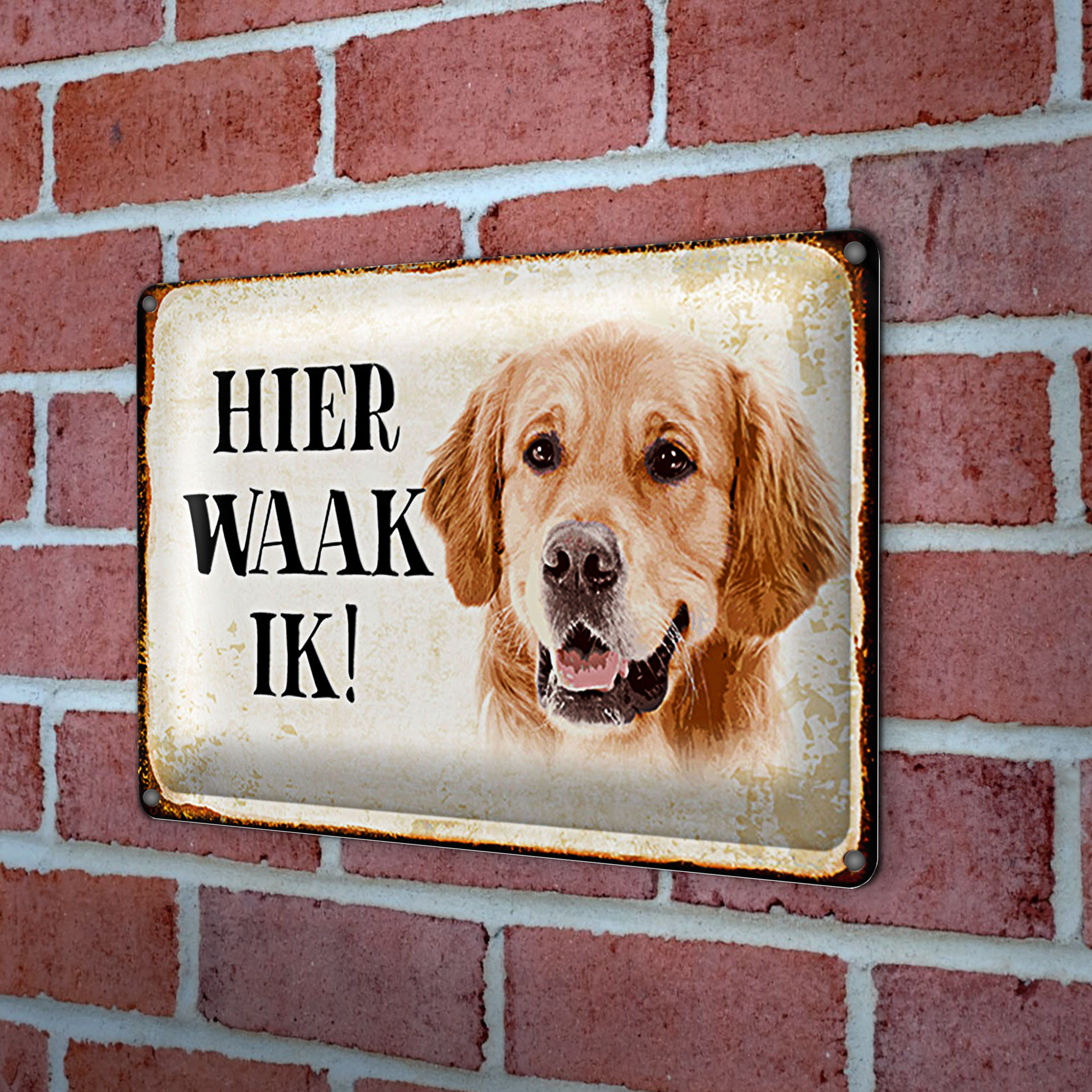 Blechschild Spruch 30x20cm holländisch Hier Waak ik Golden Retriever