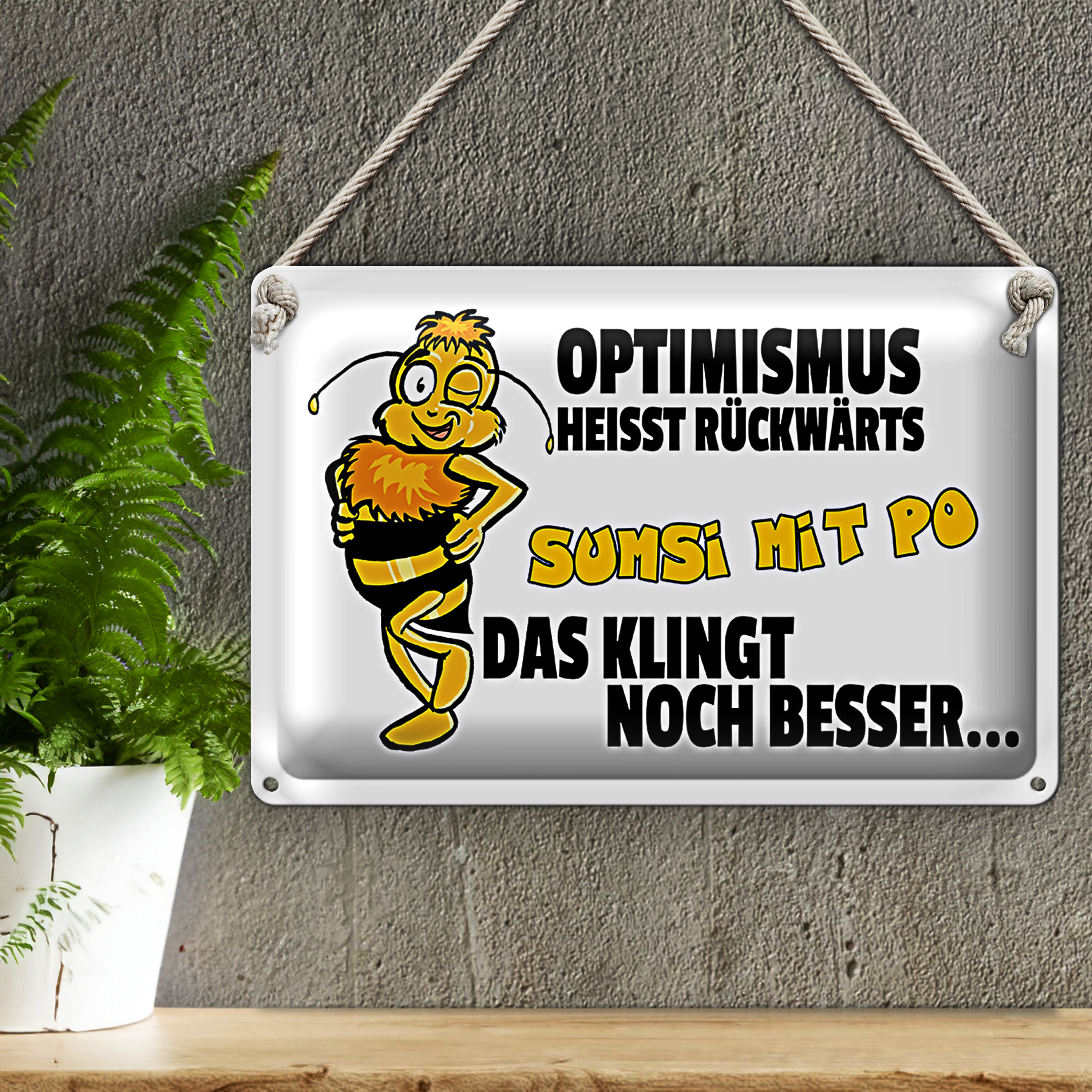 Blechschild Spruch 30x20cm Optimismus rückwärts Sumsi Po