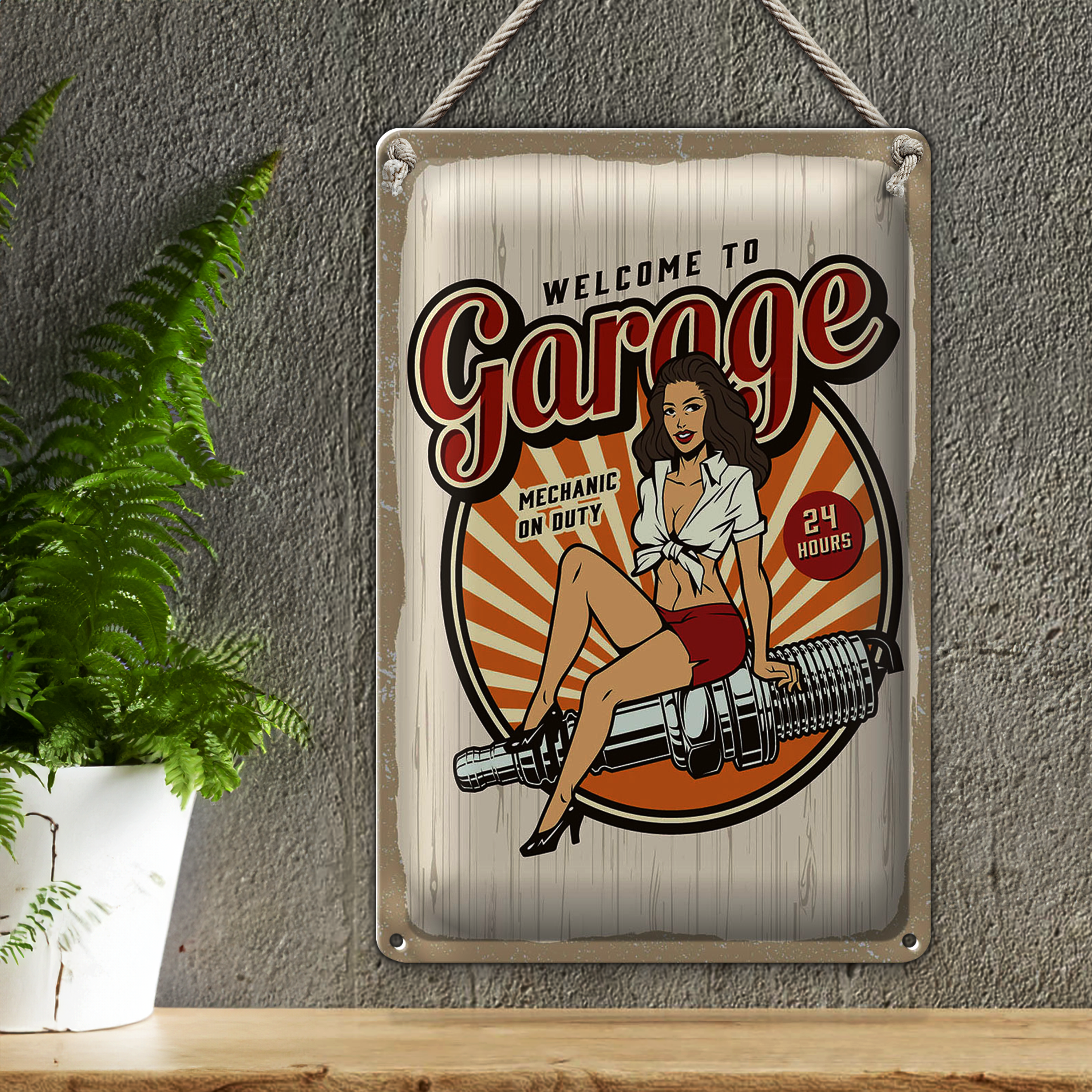 Blechschild Spruch Pinup Welcome to Garage Mechanic on 20x30cm