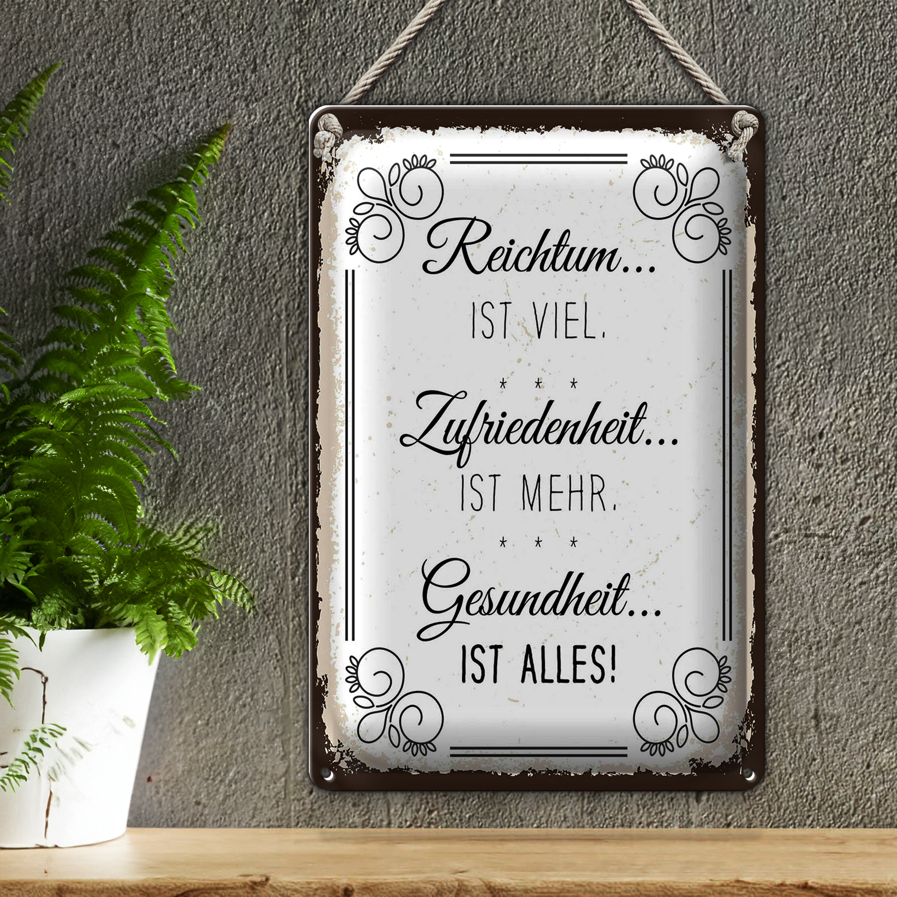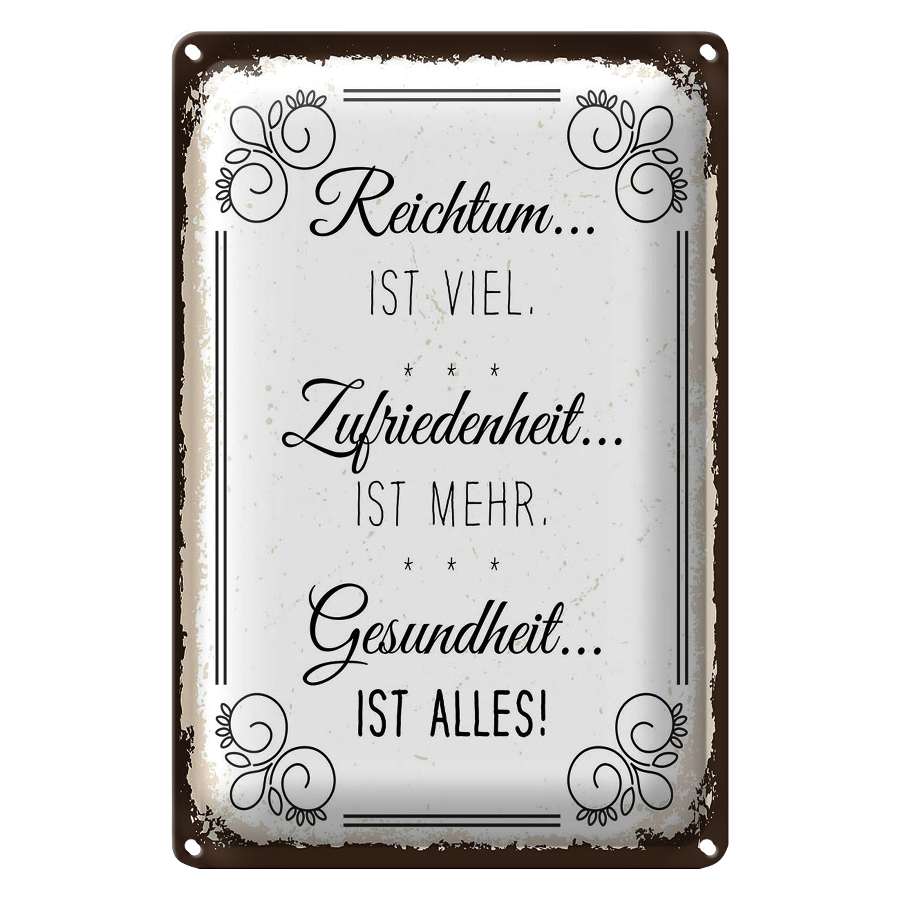 Blechschild Spruch Reichtum viel Zufriedenheit mehr 20x30cm