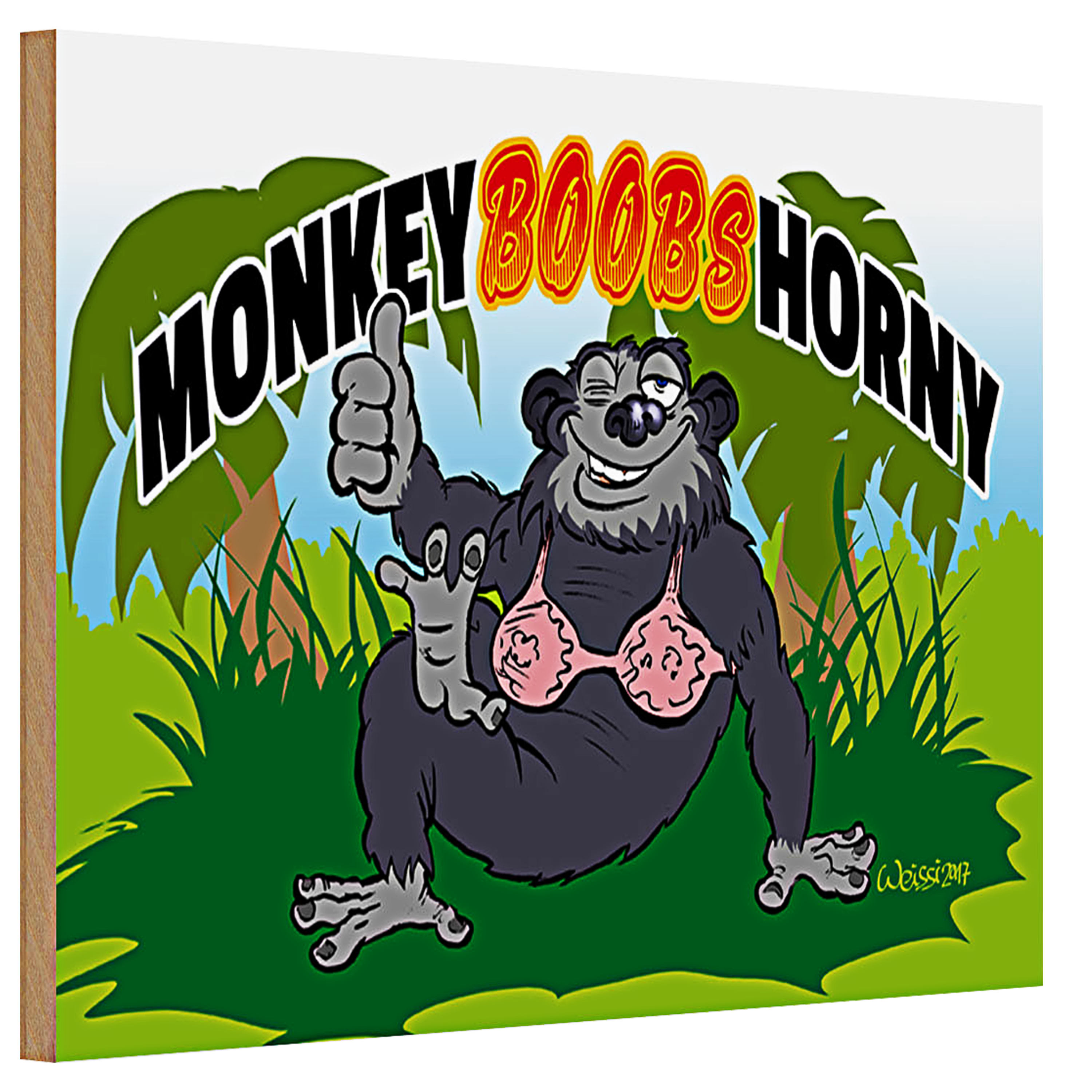 Holzschild Spruch 30x20cm Monkey Boobs Horny Affe im BH