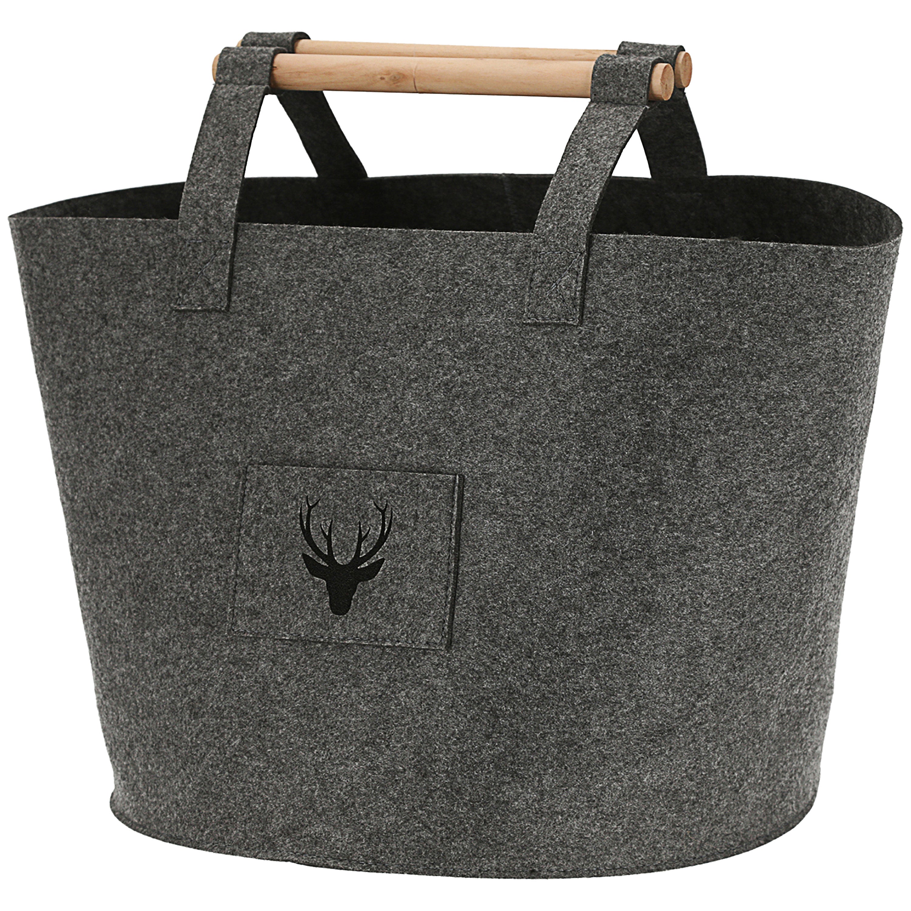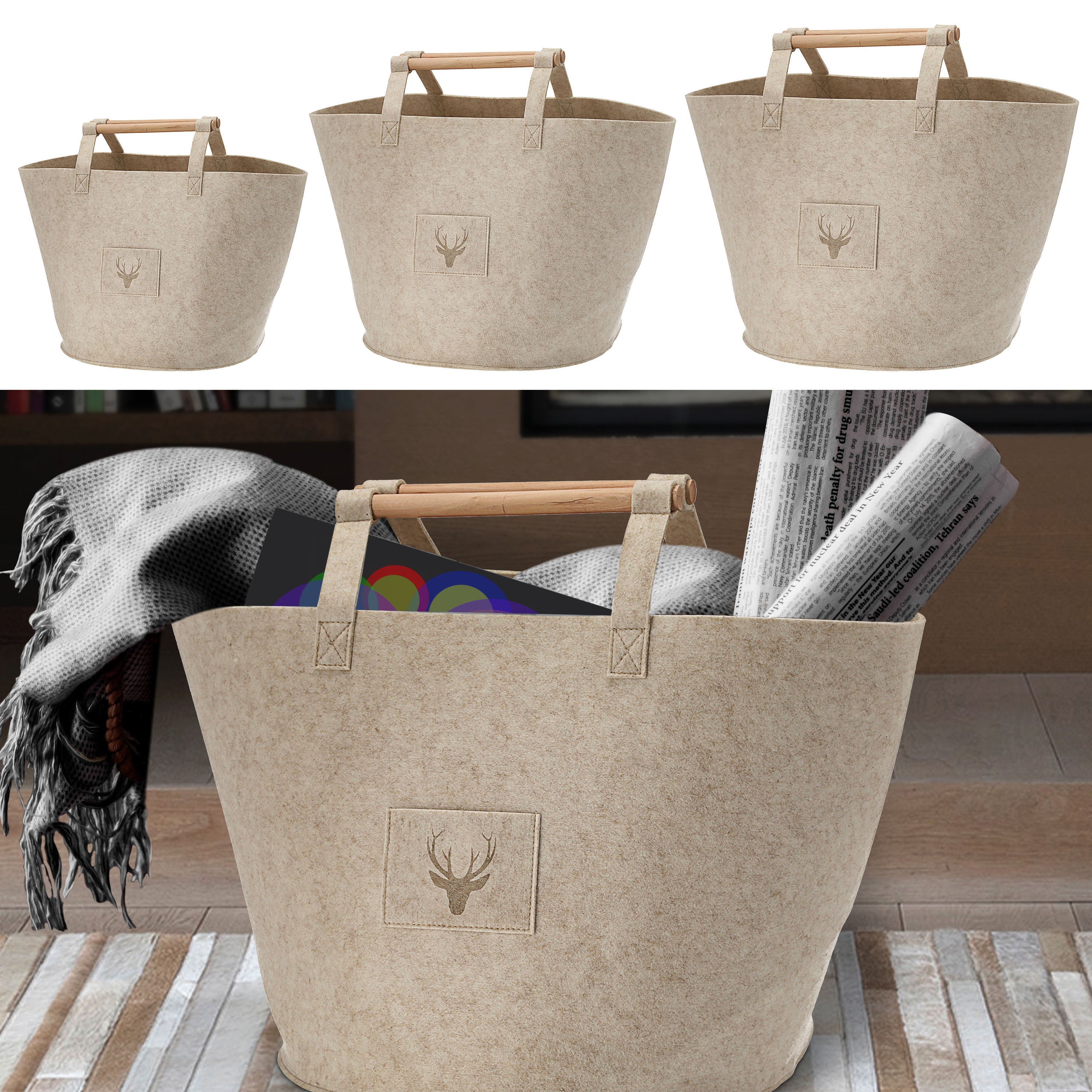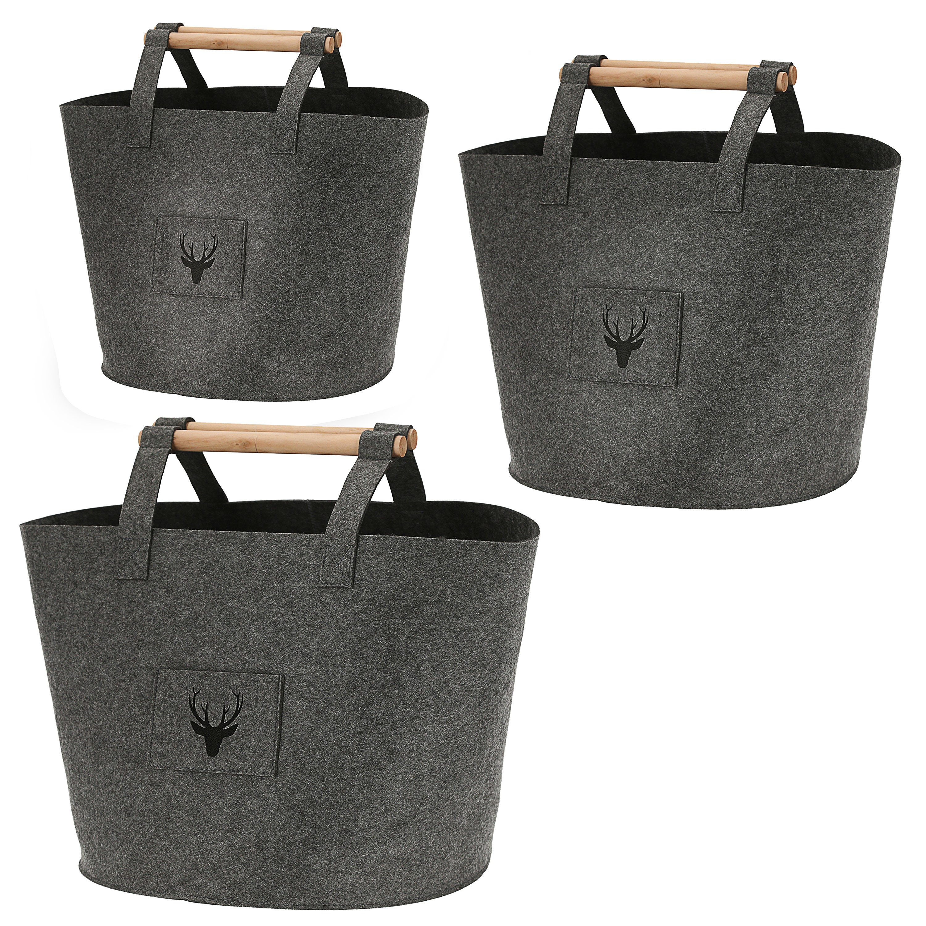 Filztaschen 3er Set Hirschkopf S/M/L beige/dunkelgrau Hirschmotiv Holzgriff Filzkorb Tasche Aufbewahrungstasche Korb