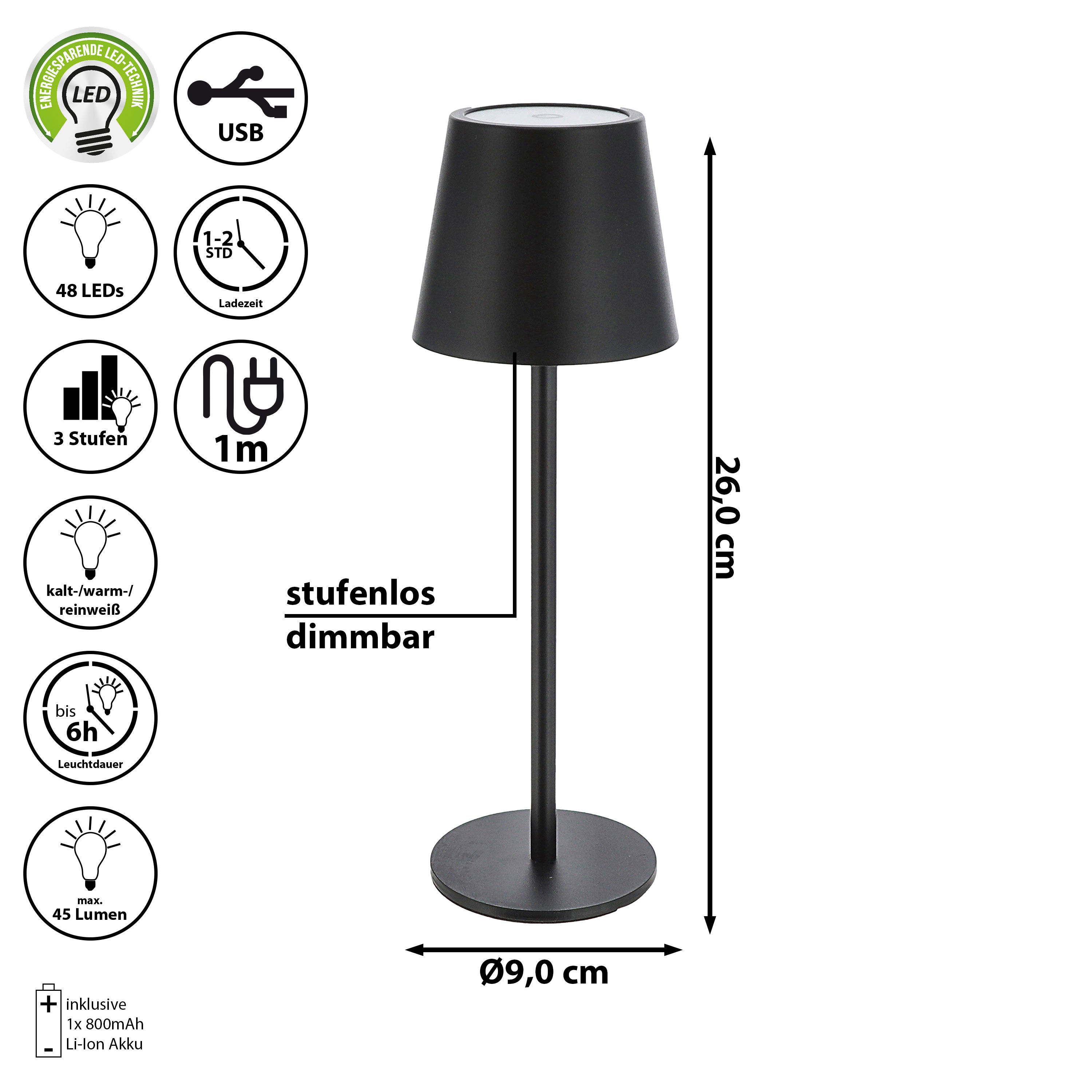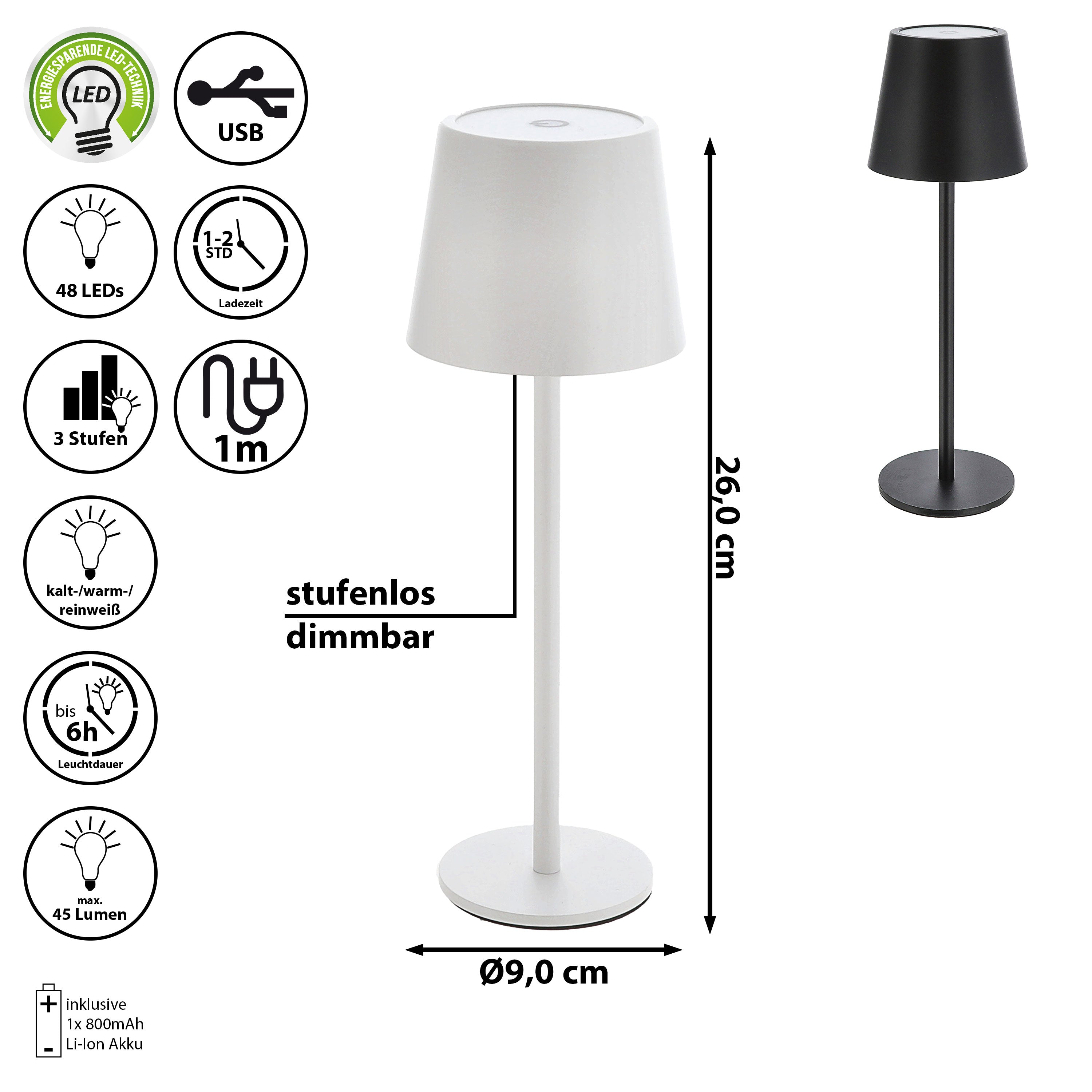LED Tischleuchte weiß/schwarz 48 LEDs 9x26cm USB Ladefunktion Touchfunktion stufenlos dimmbar 3 Weißtöne 45 Lumen Tischbeleuchtung