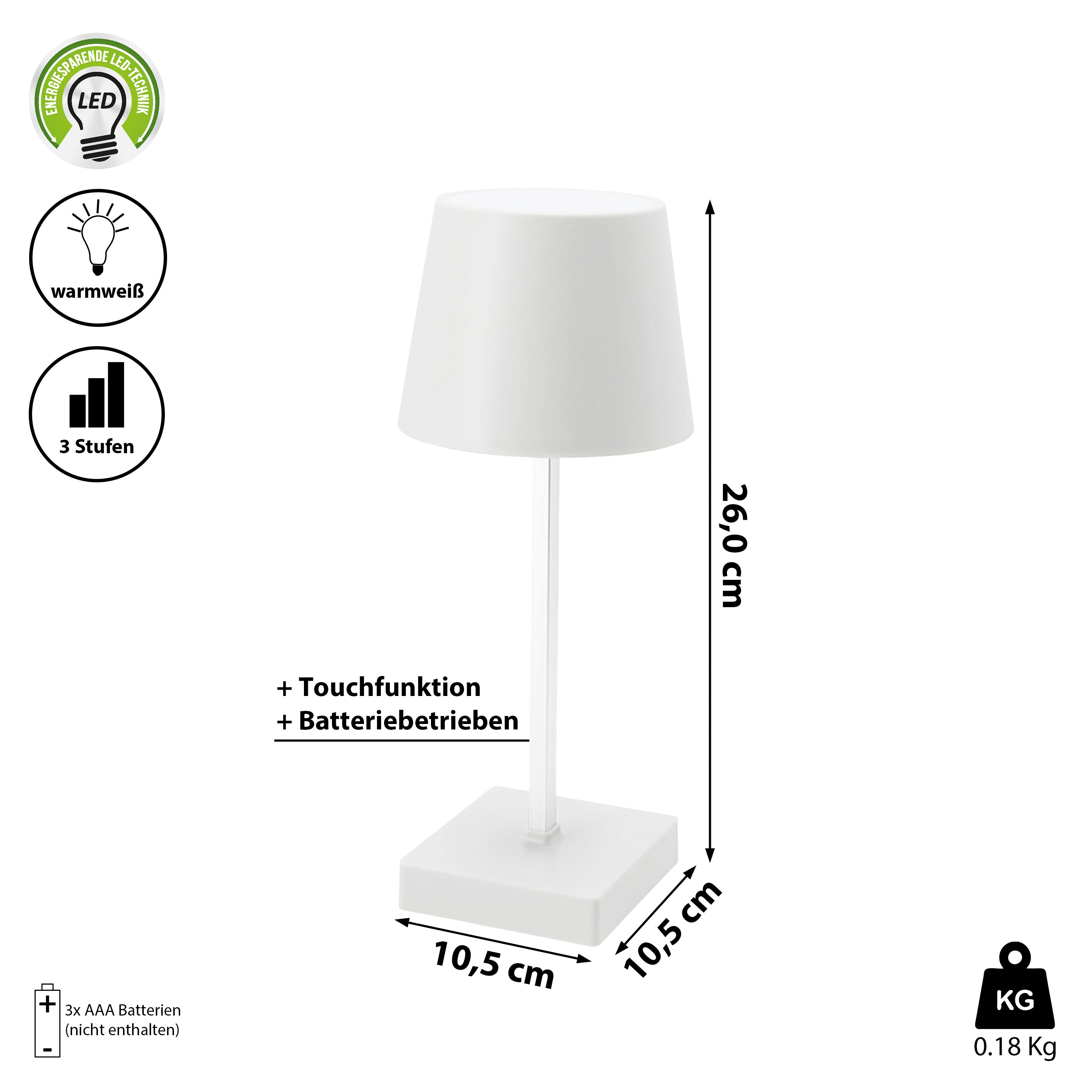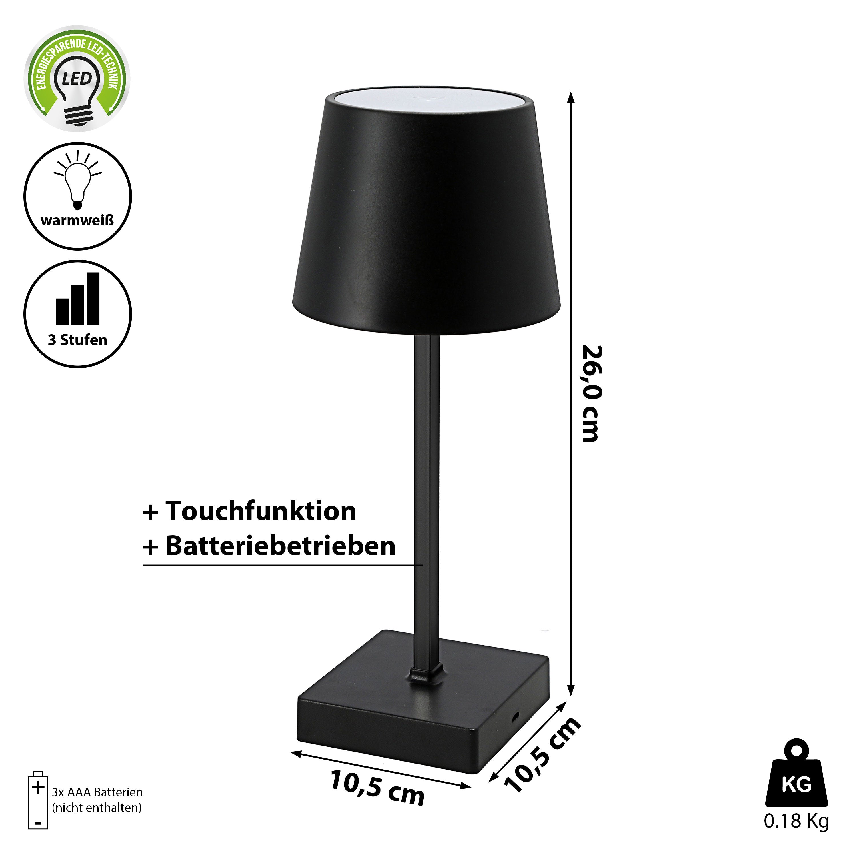 LED Tischleuchte weiß/schwarz batteriebetrieben 11x26cm Touchfunktion 3 Helligkeitsstufen Dekolampe Tischbeleuchtung