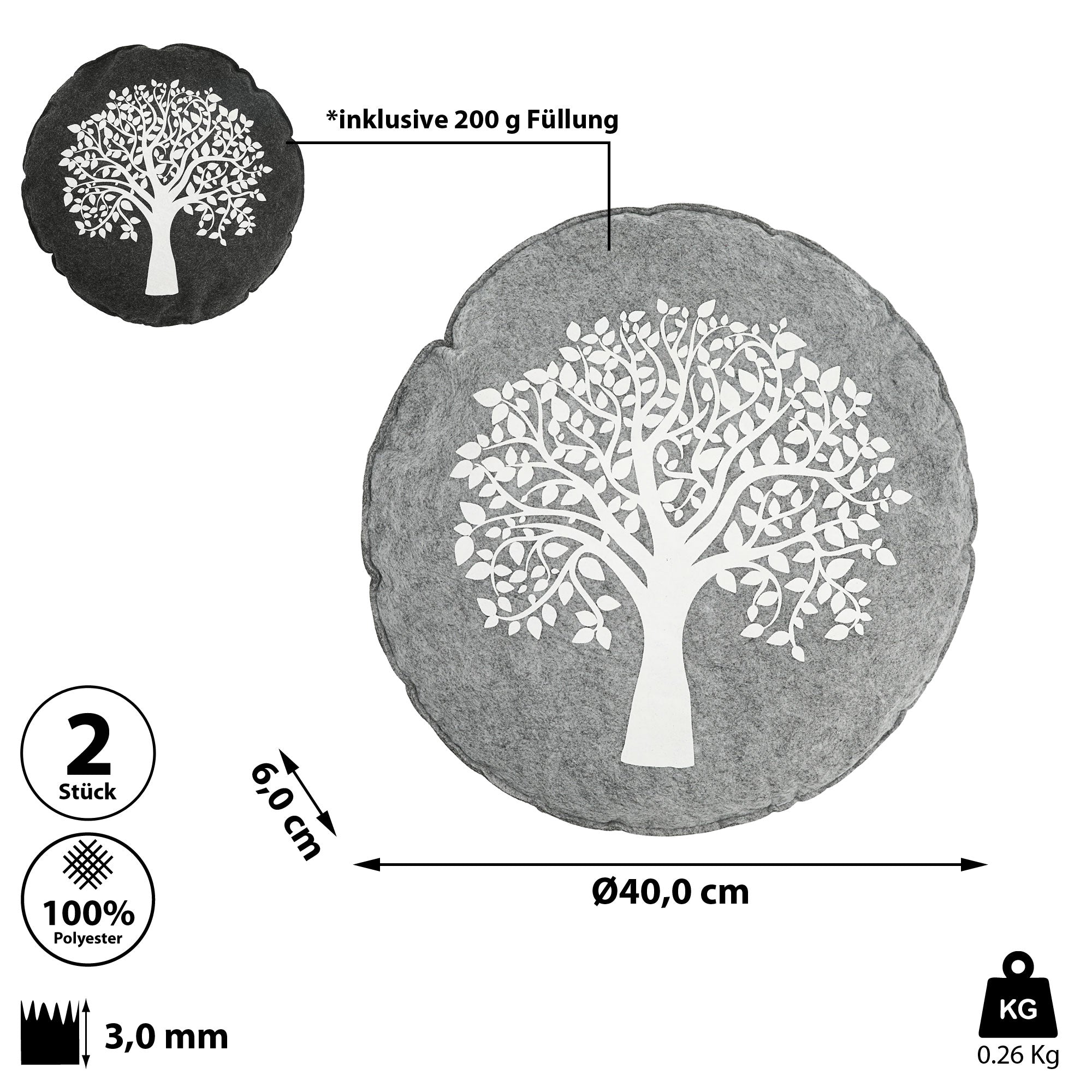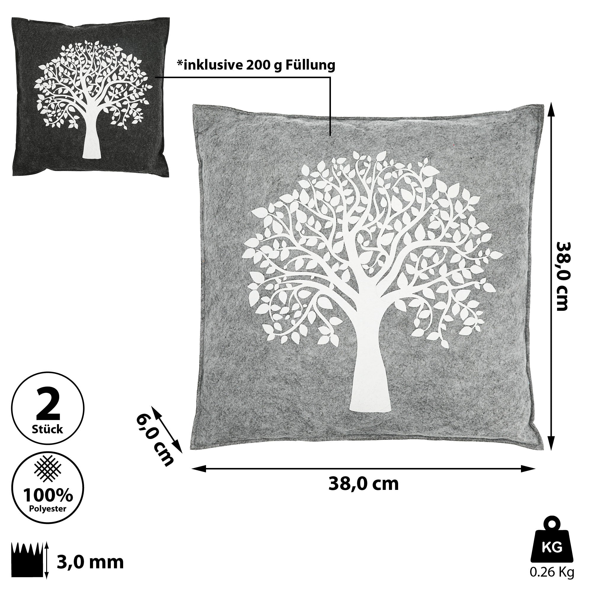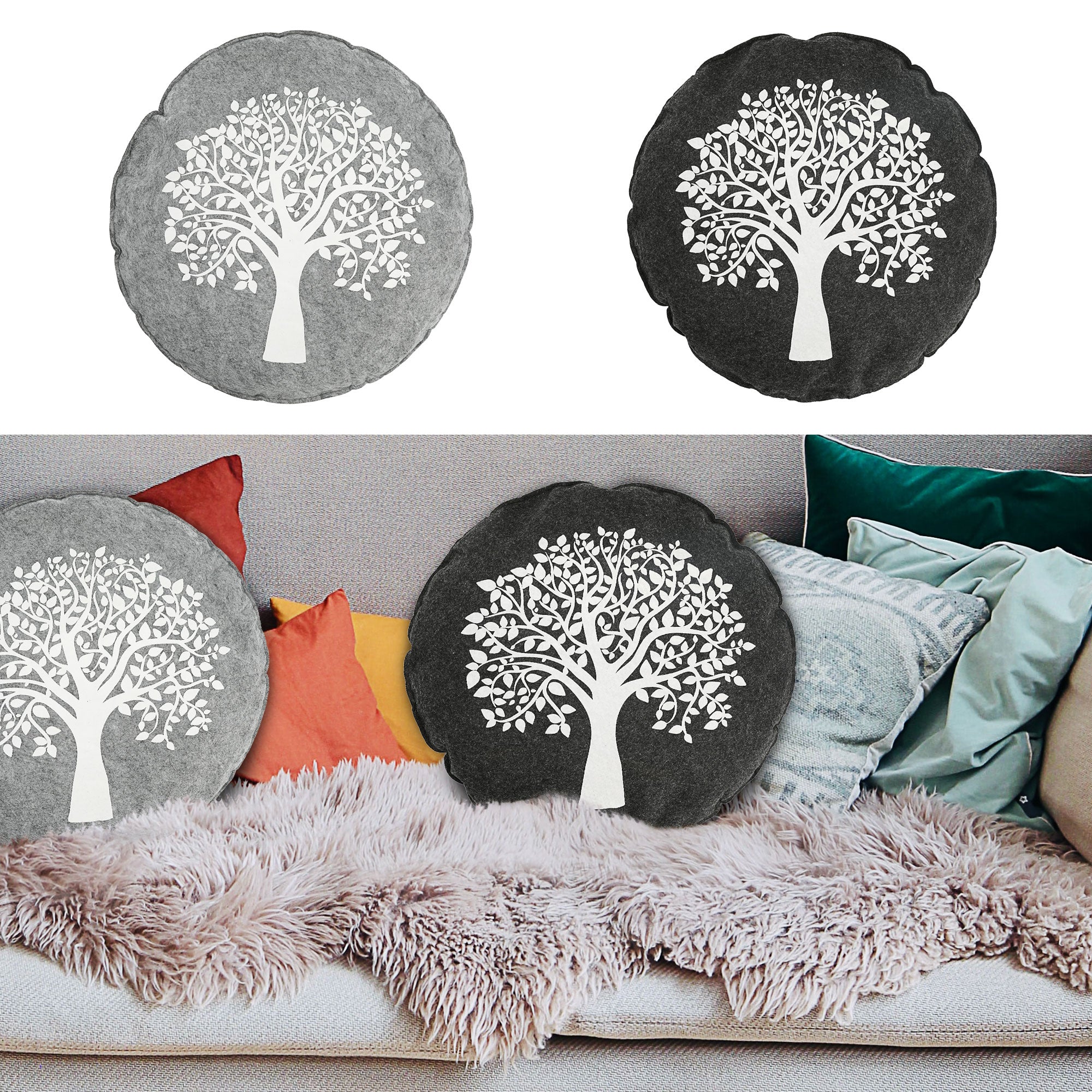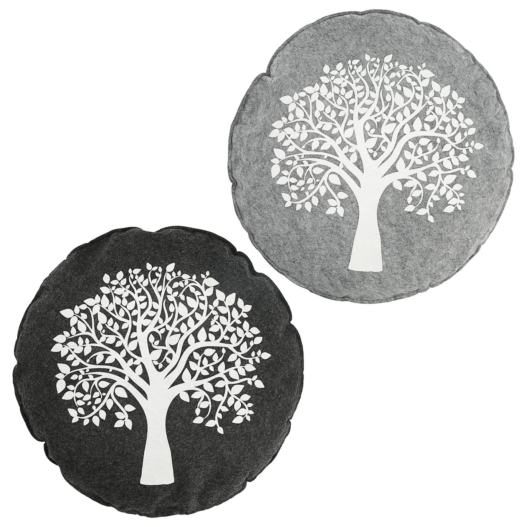 2x Kissen Aufdruck "Lebensbaum" hell dunkelgrau Filz quadratisch/rund 38x38cm Sofakissen Dekokissen