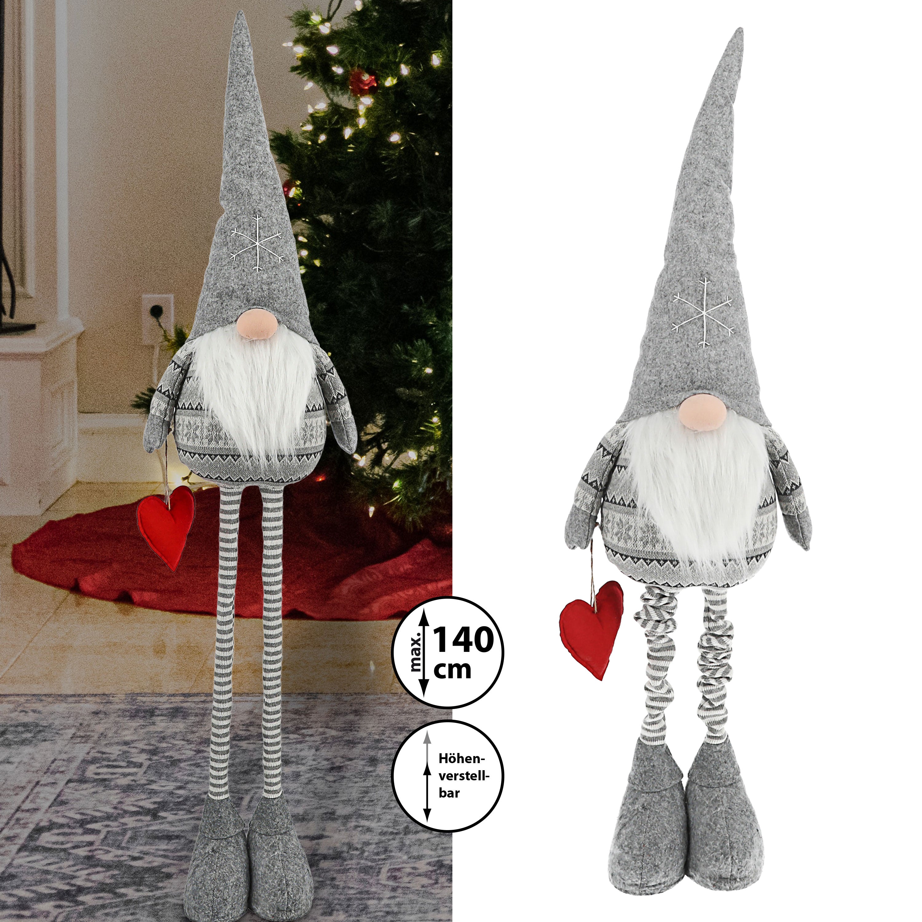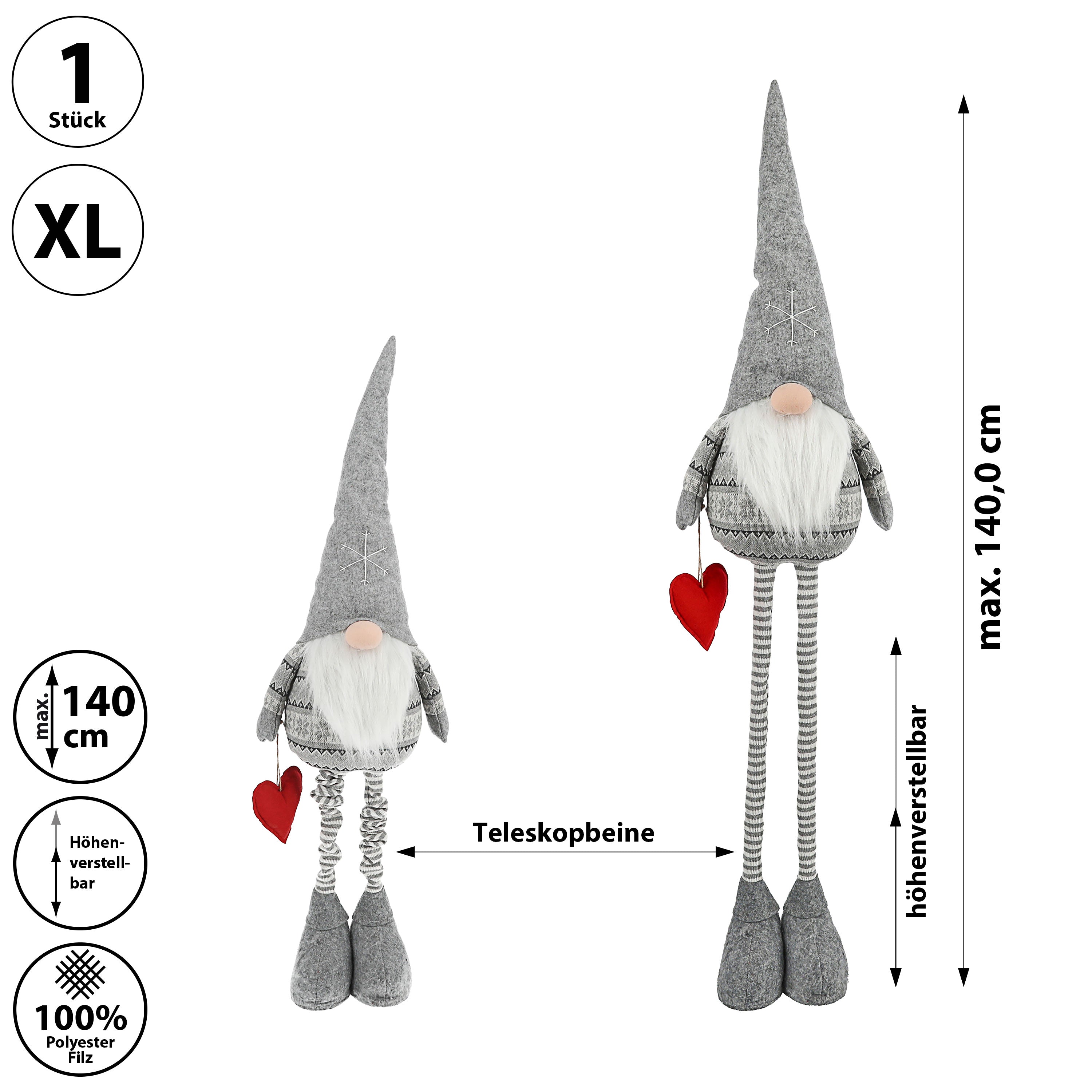 XL Wichtel 'Udo' mit Teleskopbeinen ca. 140cm Polyester Eisen 30x80cm grau Weihnachtswichtel Adventsdeko Weihnachtsdeko Plüschfigur Wichtelmann