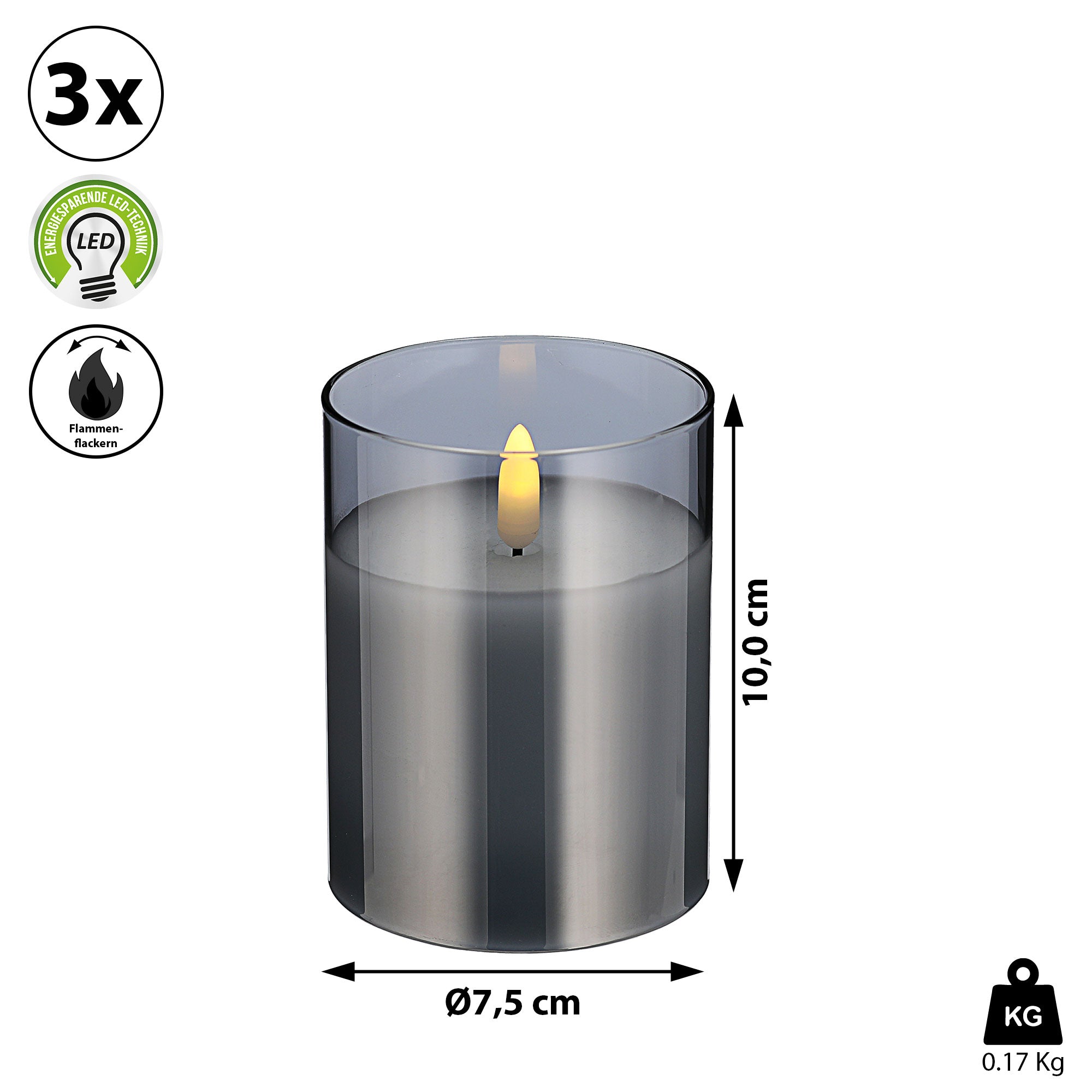 3x LED Echtwachs-Kerze im Glas Ø7,5 H:10/12/15cm Kerzenset Flackerfunktion Timerfunktion