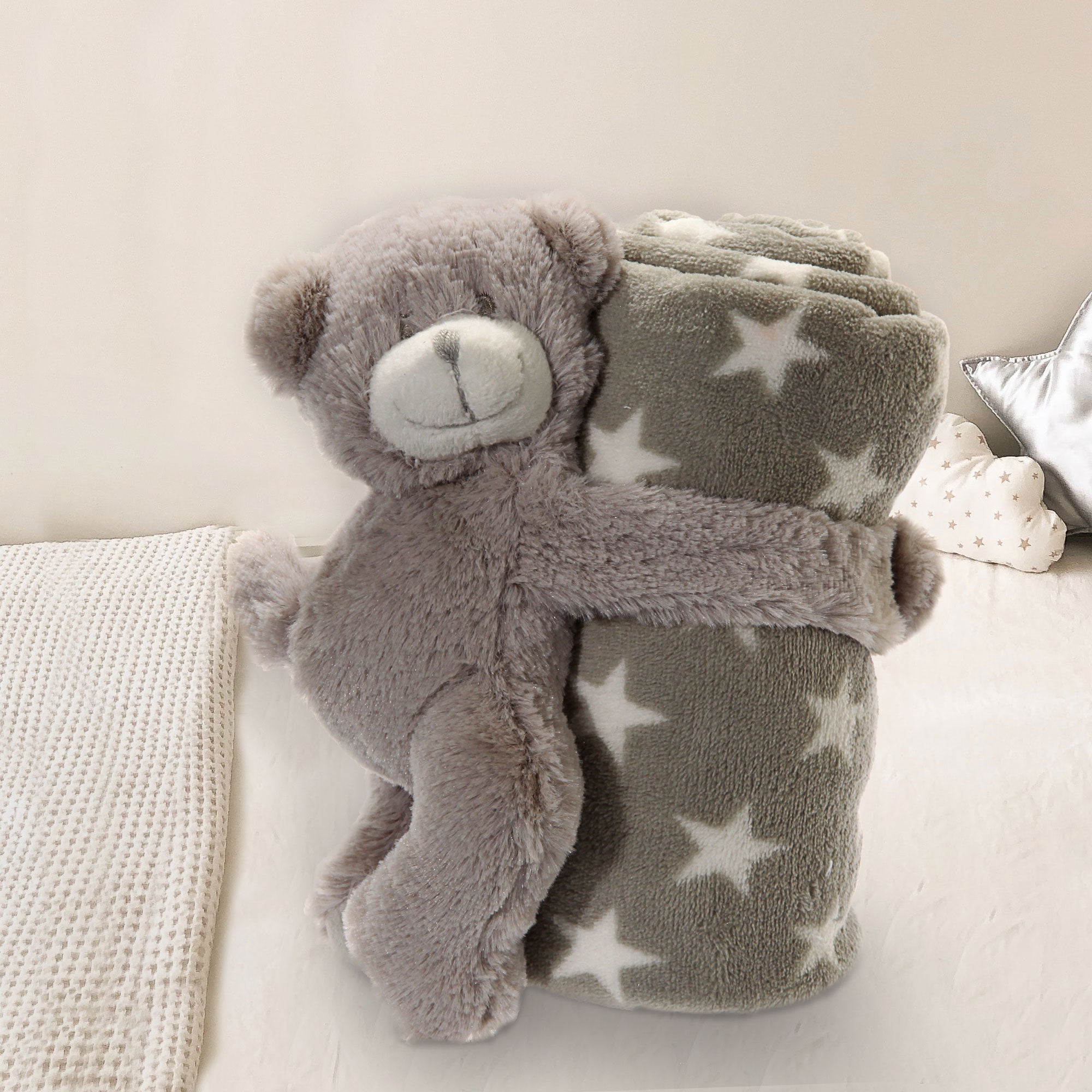 Plüschbär mit Babydecke 75x75cm grau Sternendecke Bär Kuschelbär Kuscheltier Stofftier Decke Plüschtier Plüschdecke Polyester