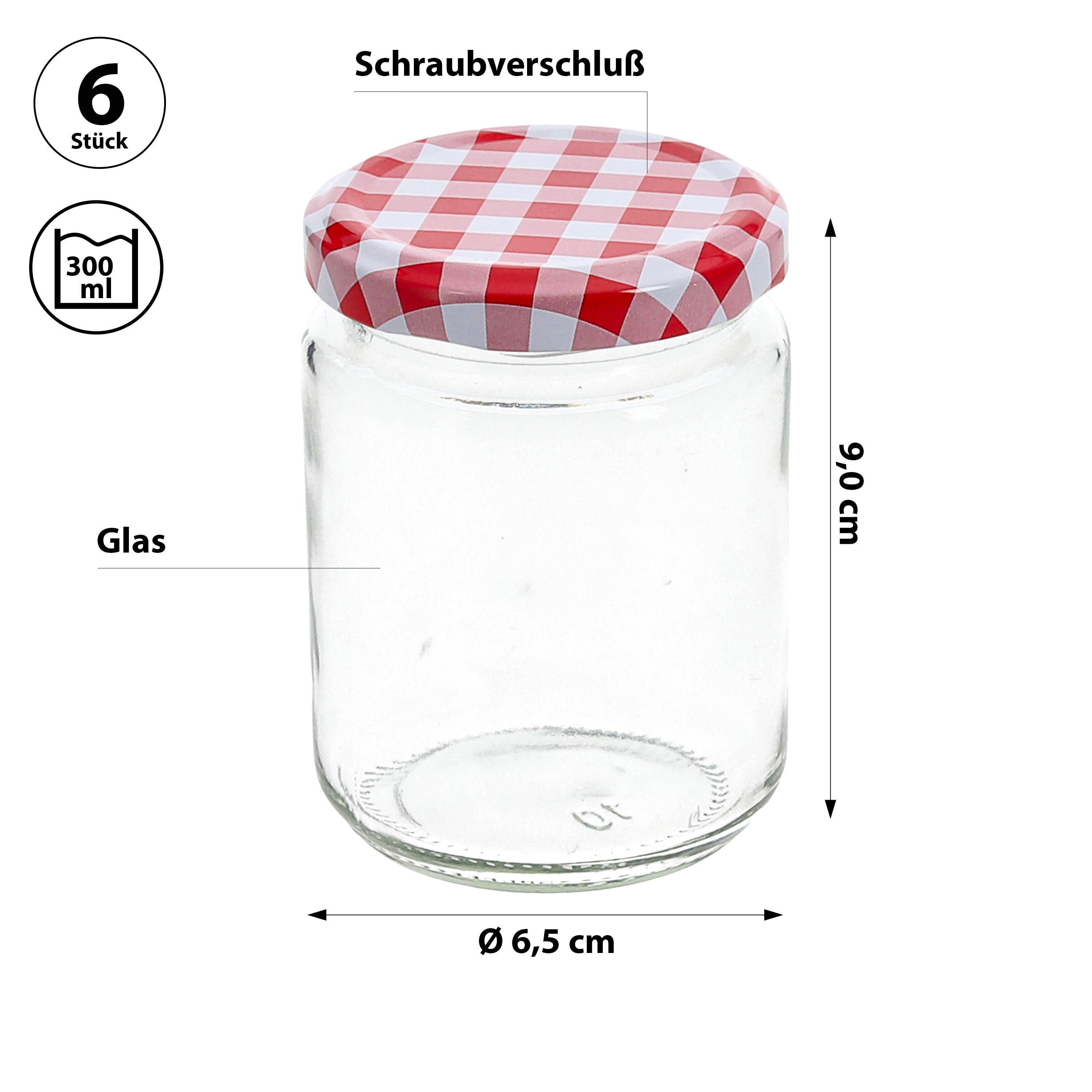 Einmachglas 6er Set 300ml 6,5x9cm Glas Metall Schraubdeckel rot-weiß kariert Konservenglas Twist-Off Rundglas Einmachen Aufbewahren