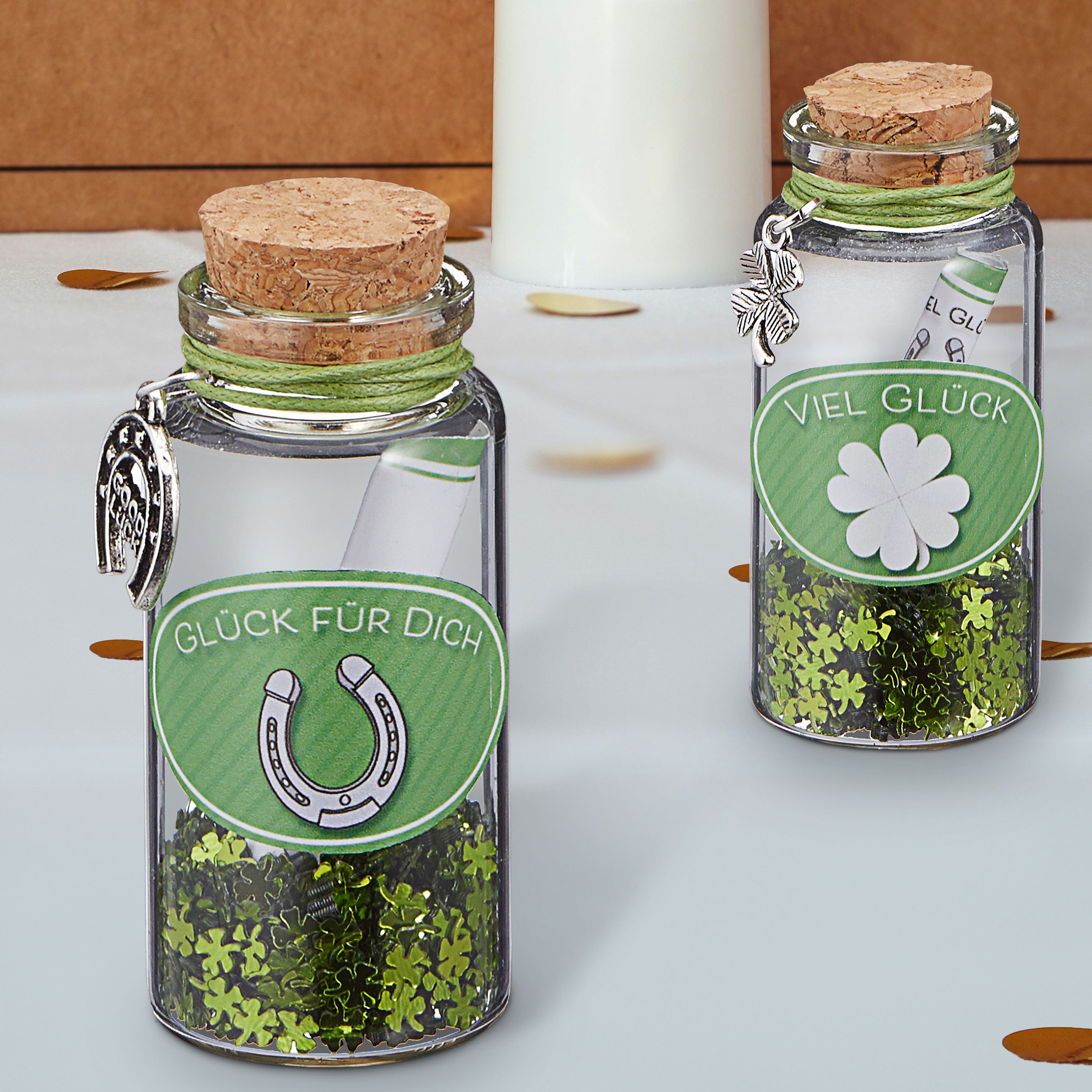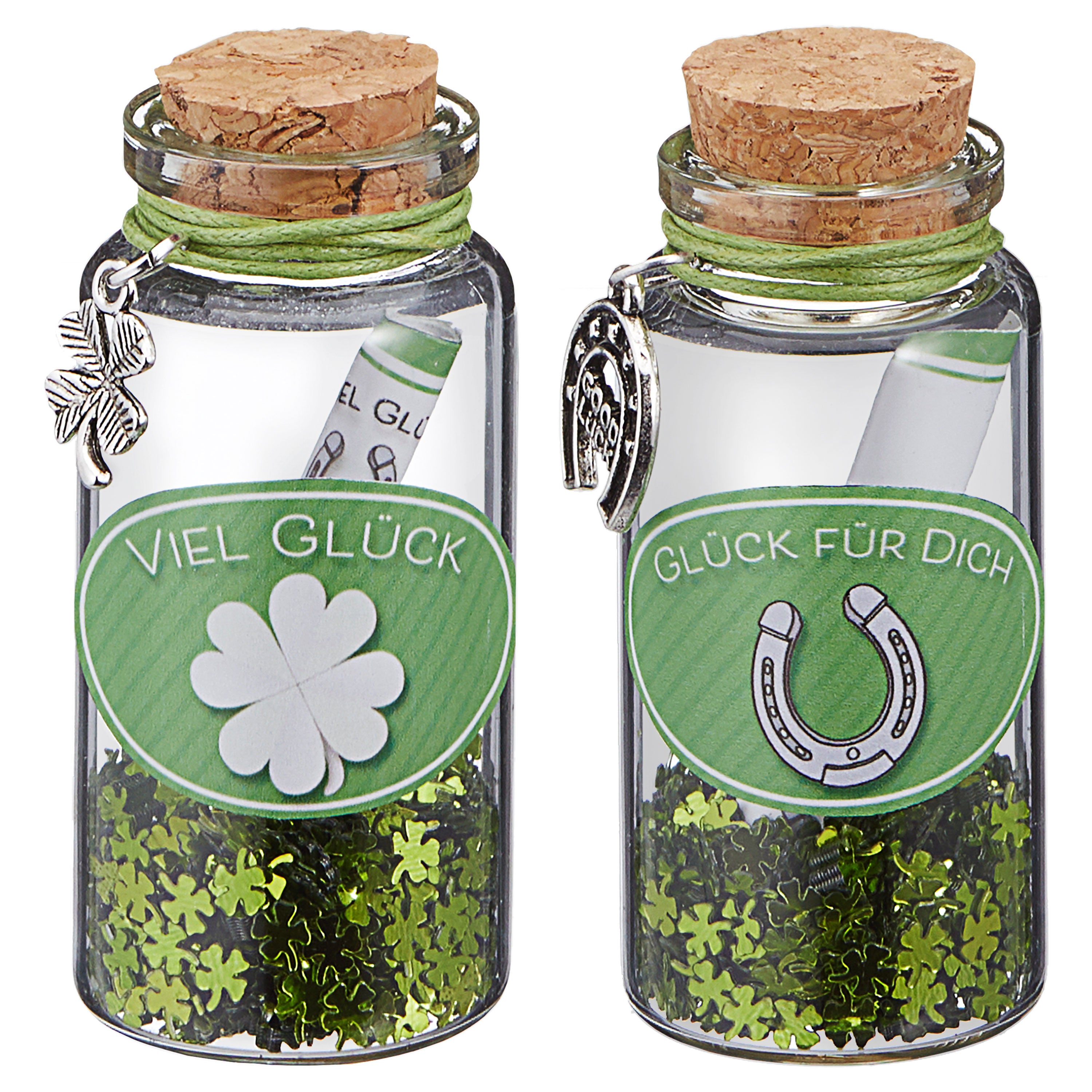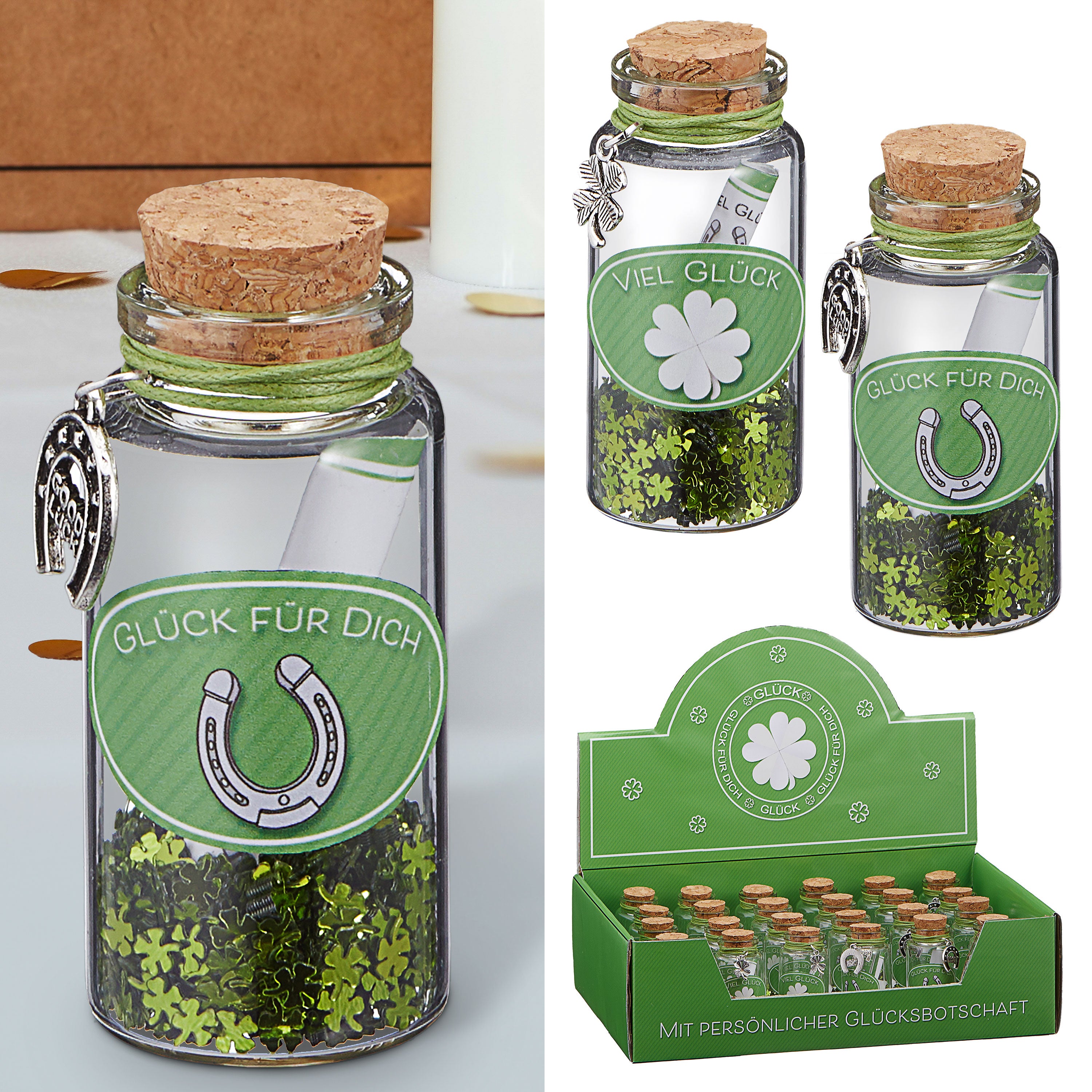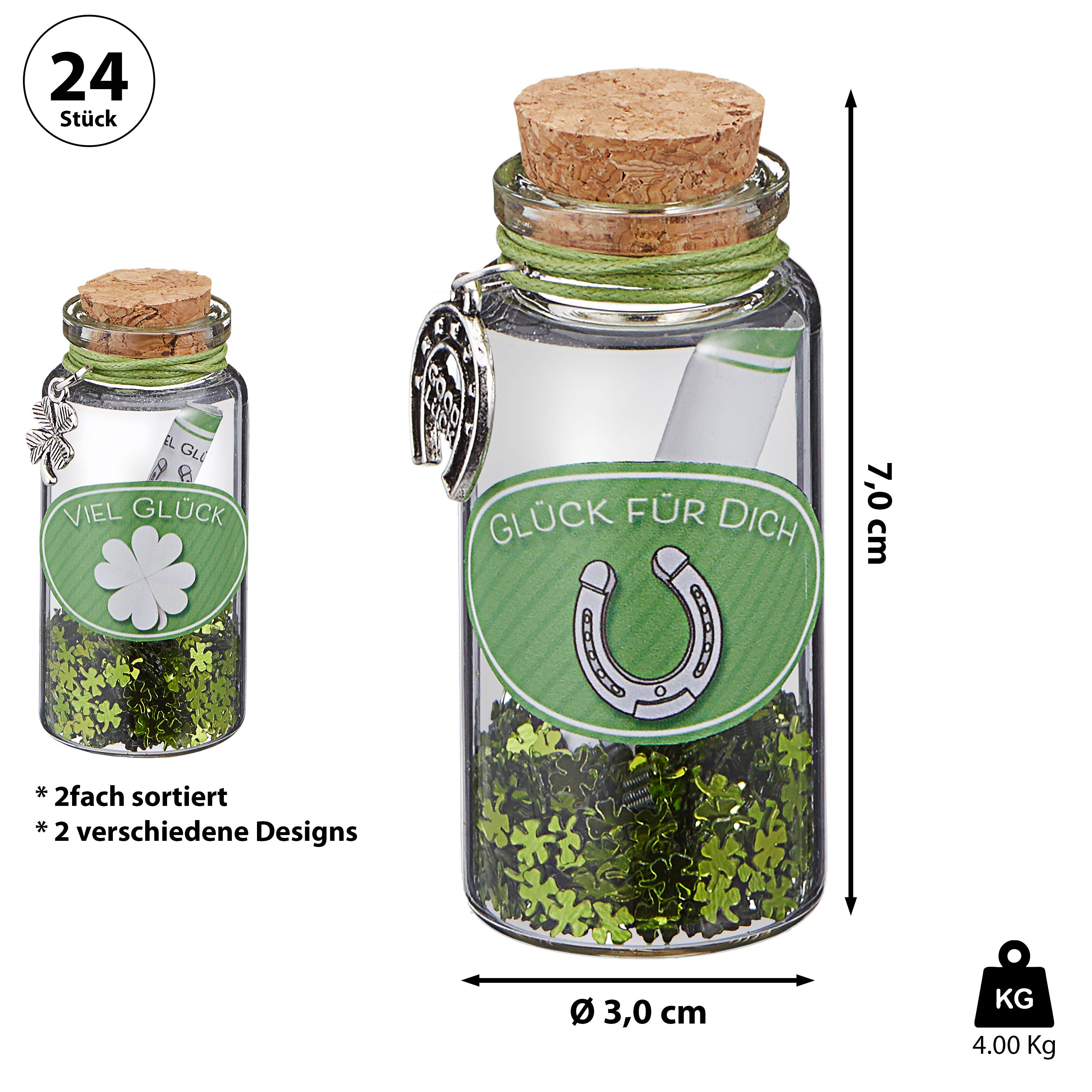 Glasröhrchen 'Hochzeit' 24 Stück Display 3x7cm Glas Kork Glücksbringer Reagenzglas mit Salz Papierrollen