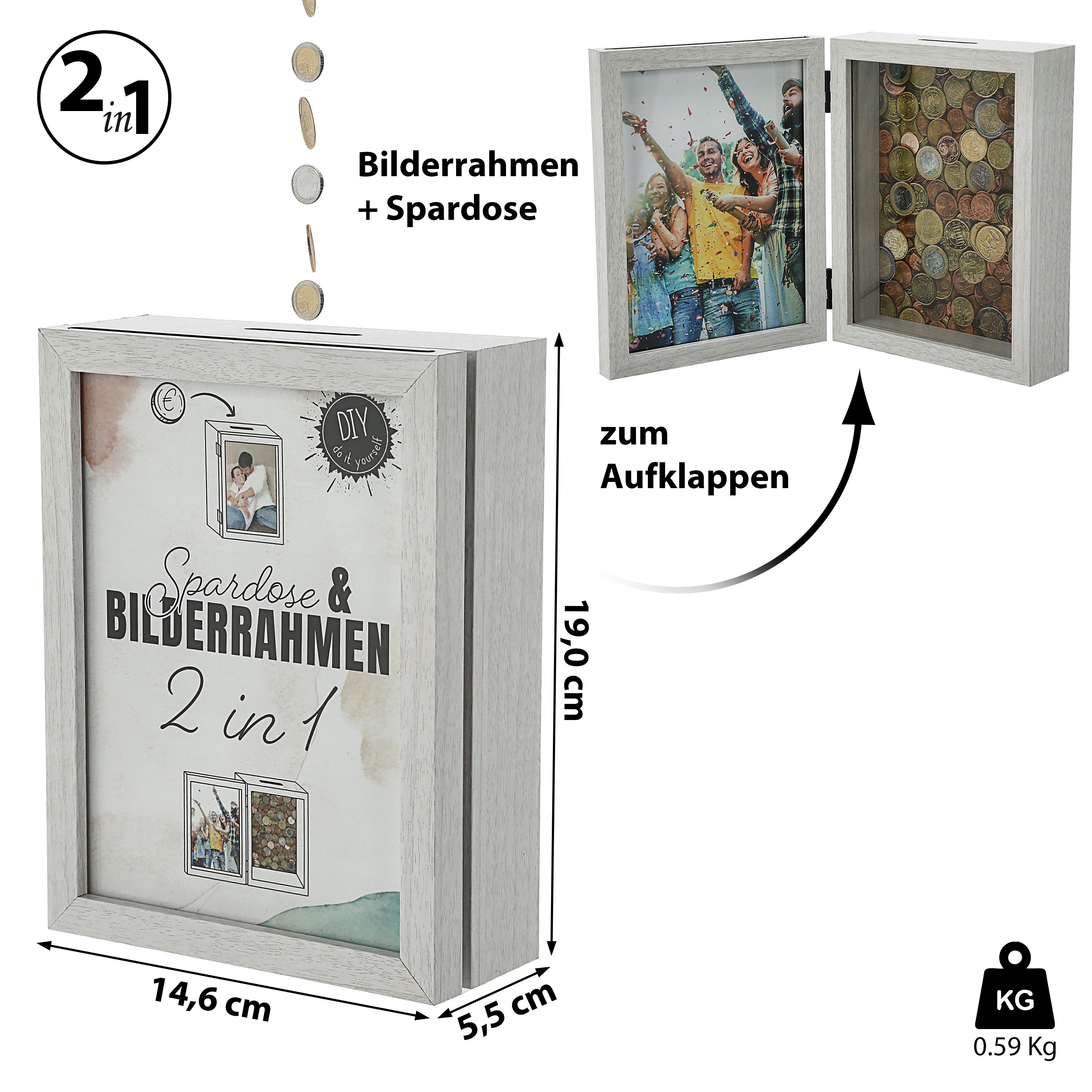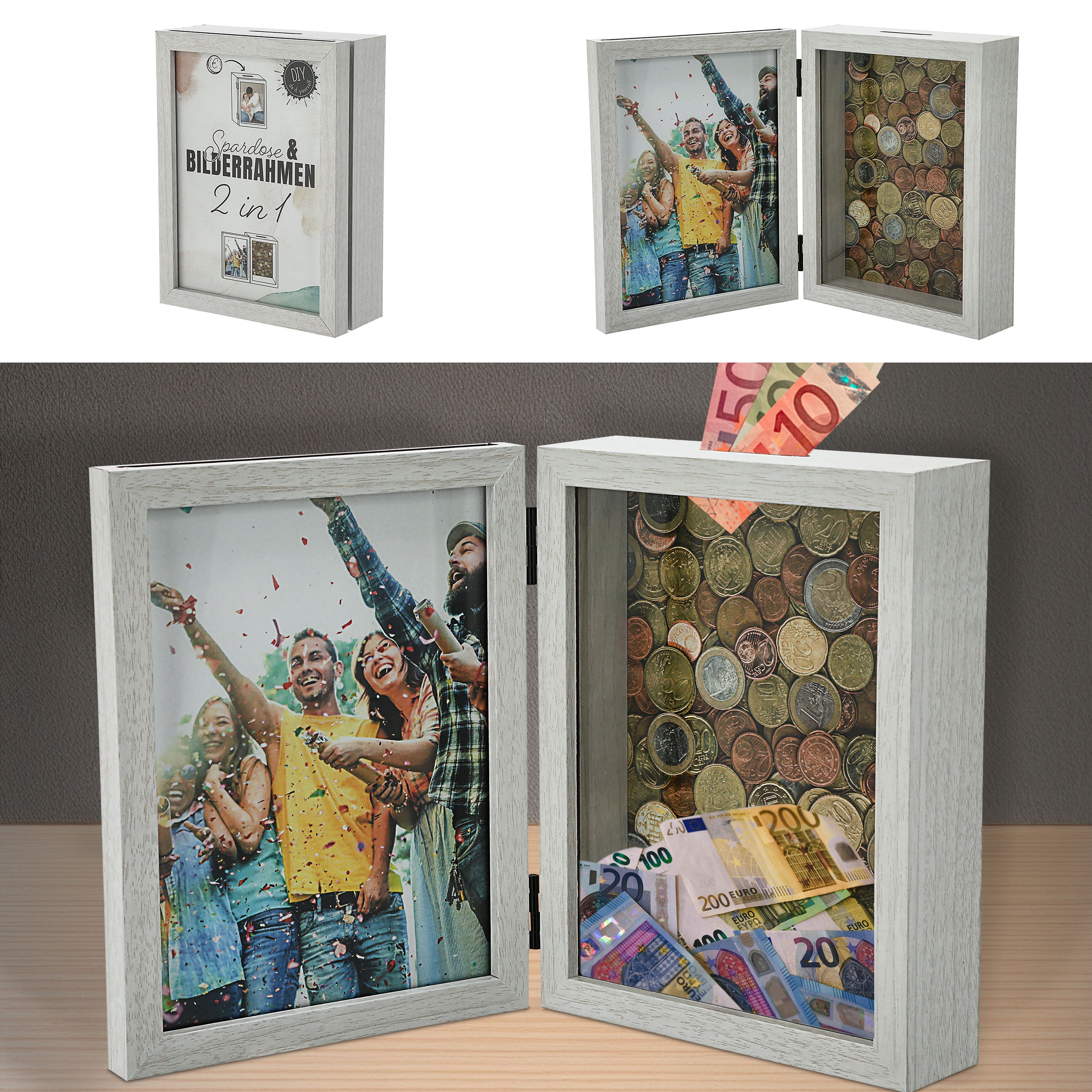 Spardose Bilderrahmen 2 in 1 weiß MDF 19x14,5x5,5cm zum Aufklappen Spardose Geldgeschenk Rahmen Geschenkverpackung