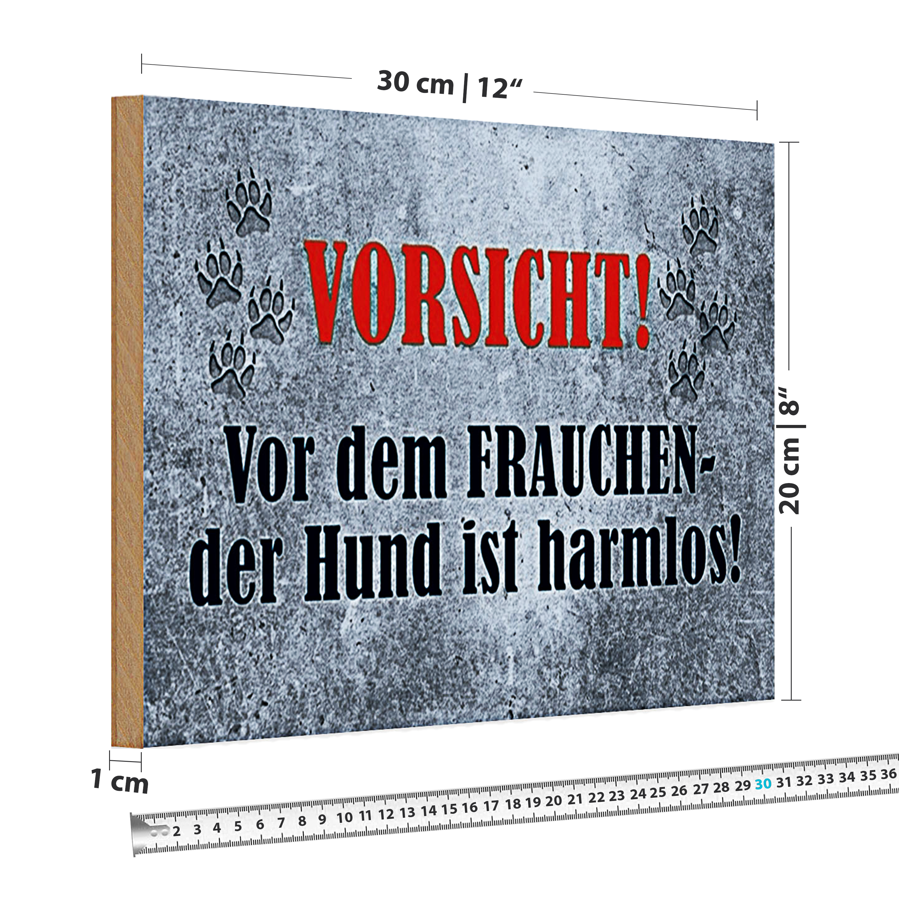 Holzschild Vorsicht 30x20cm vor dem Frauchen Hund harmlos