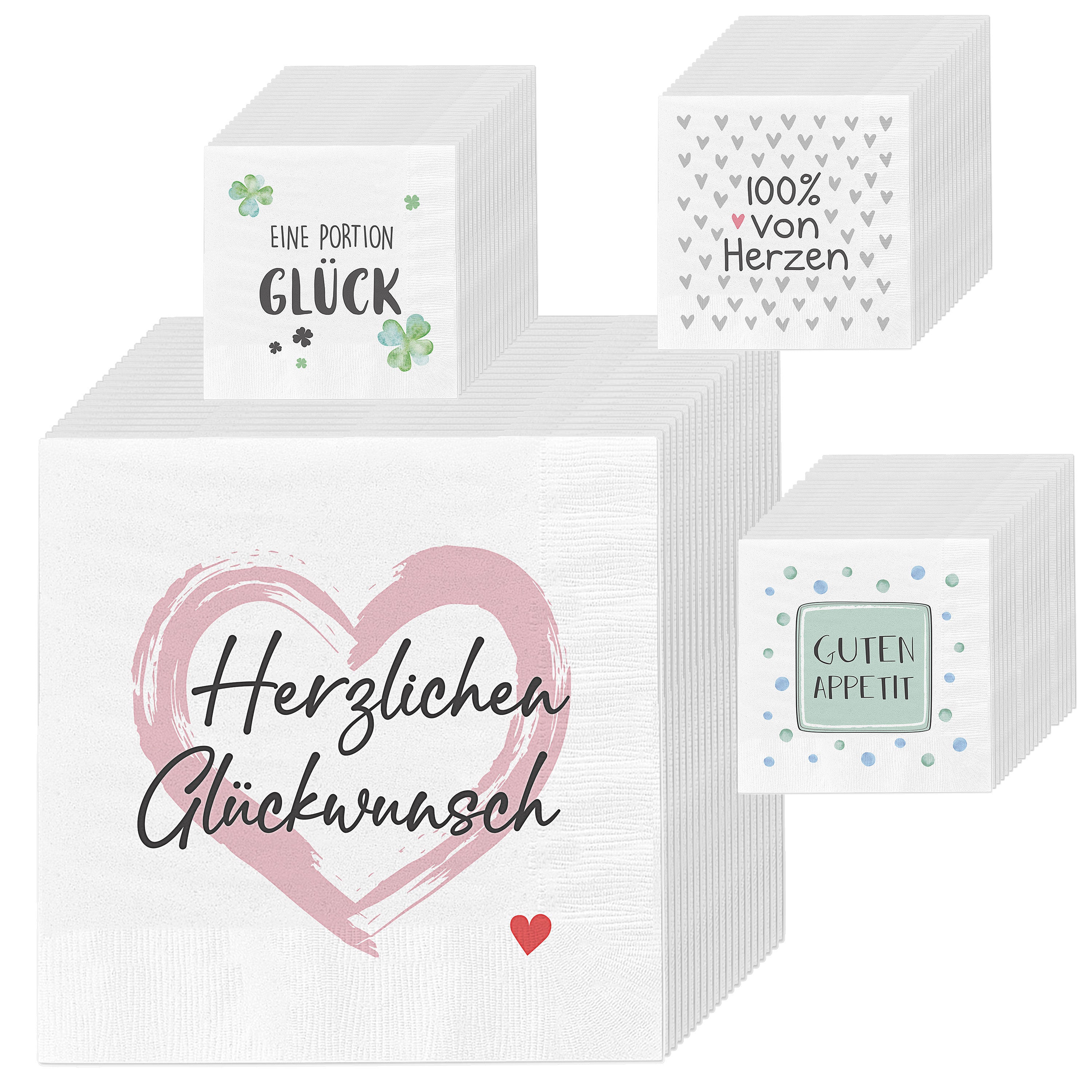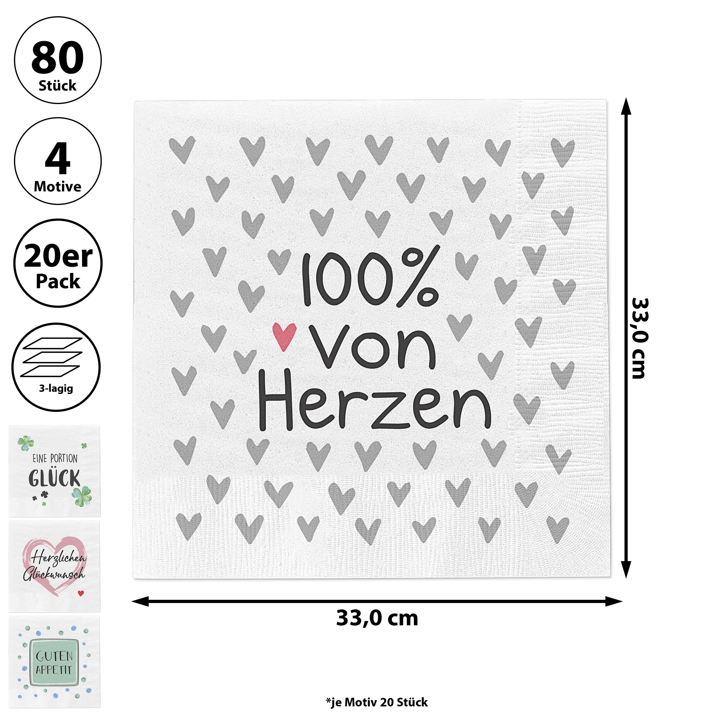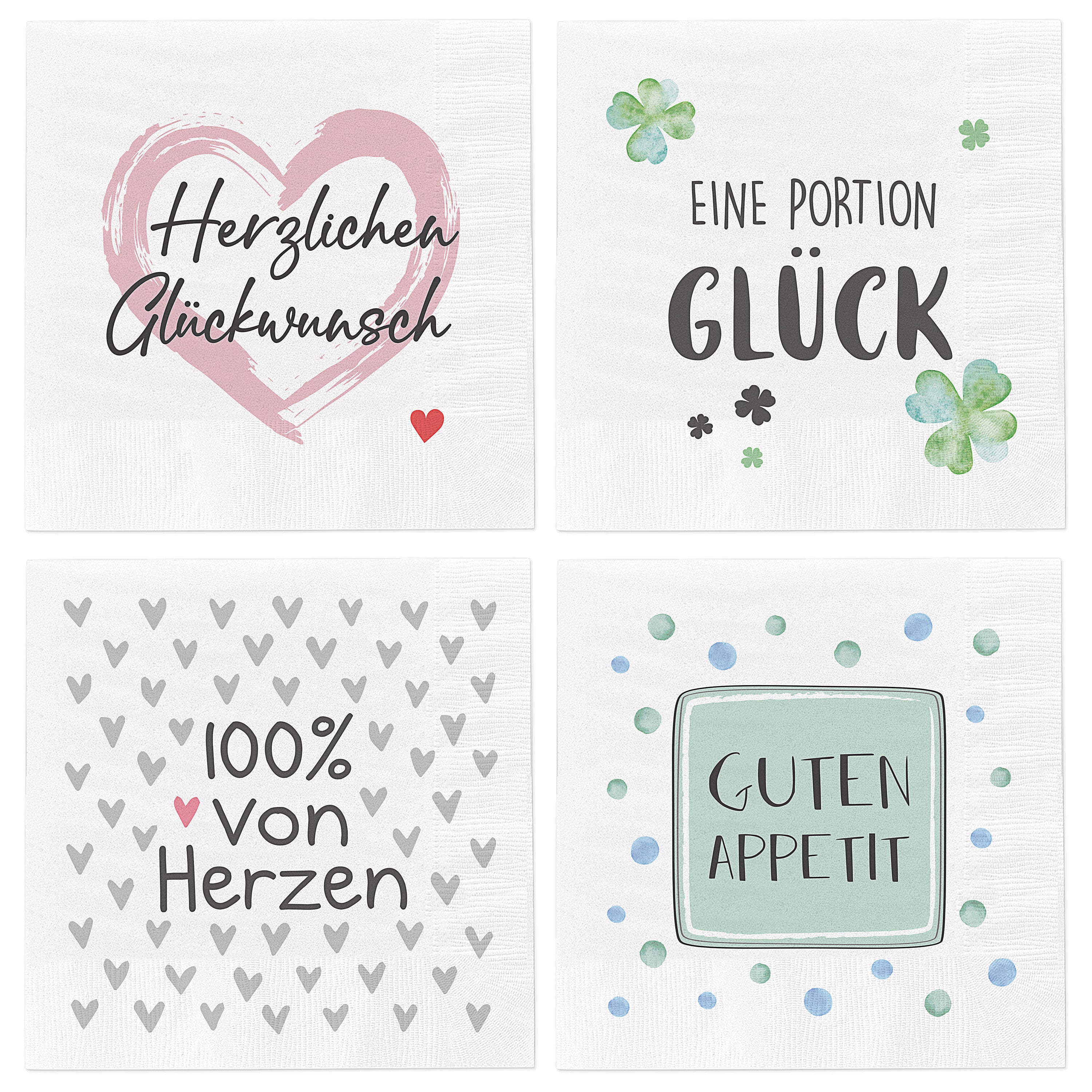 Servietten 'Sprüche' 4 Motive 80er Set 33x33cm 3-lagig Papierserviette stoffähnlich Tuch Herzenssprüche Tischdeko