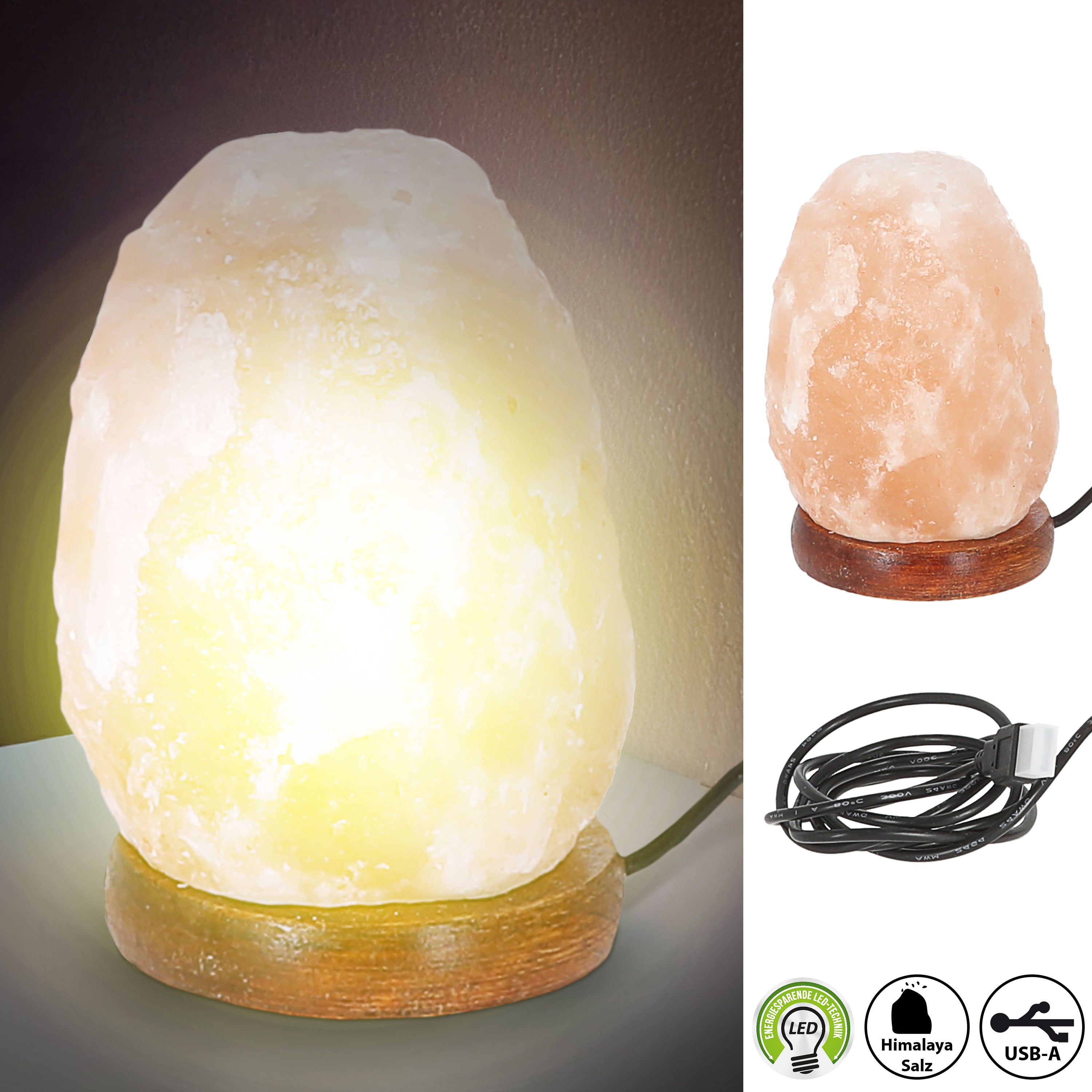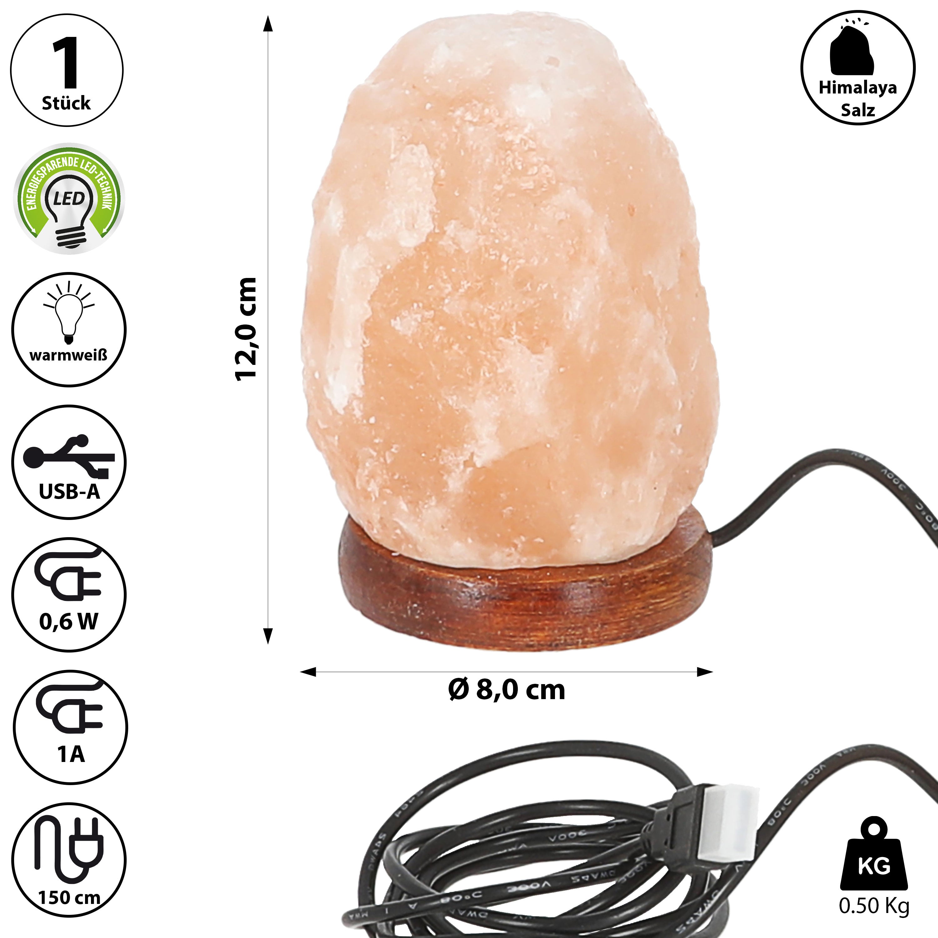 LED Salzkristallleuchte 8x12cm USB-A Kabel warmweiß MDF Salz 'Salt Range Pakistan' Salzstein Holzsockel