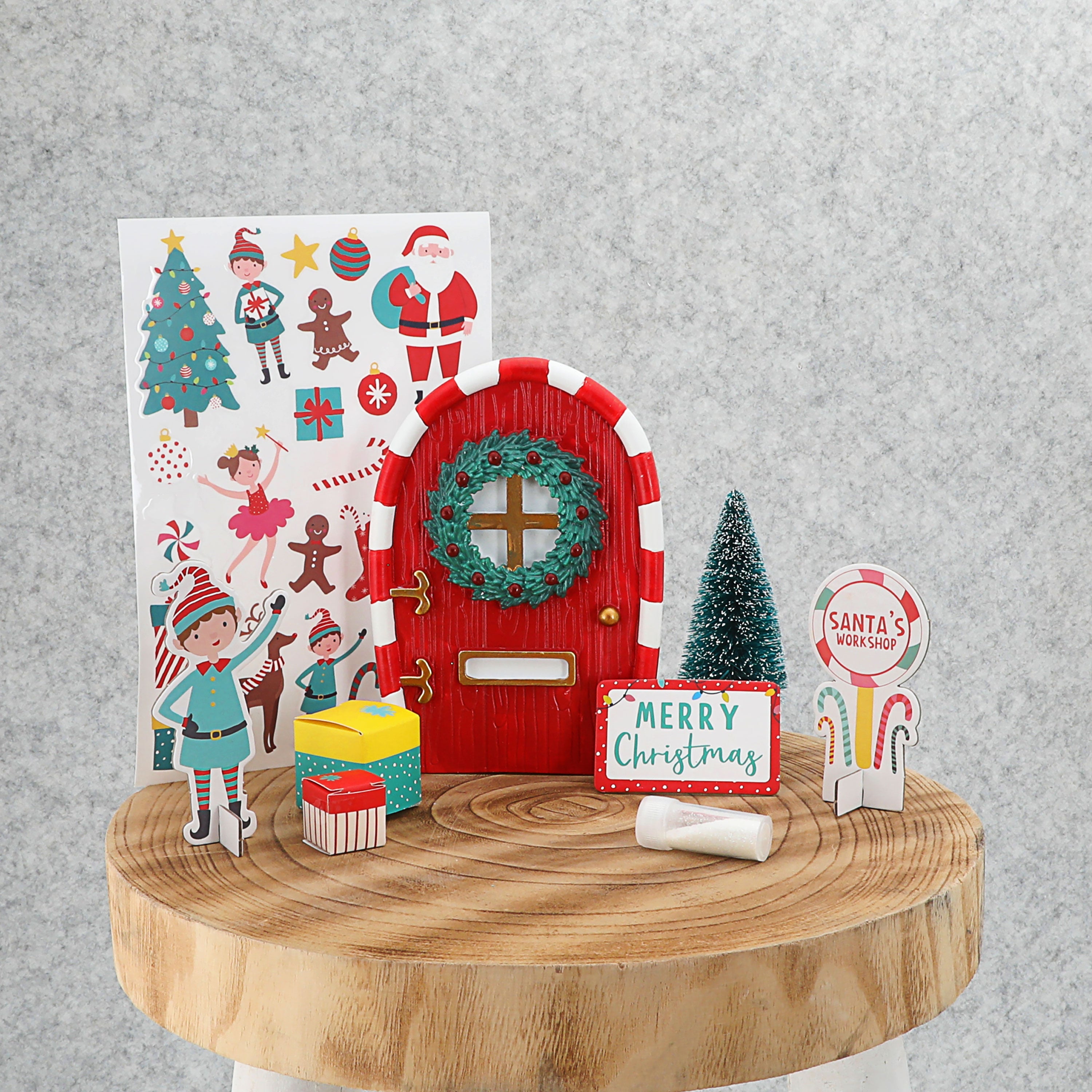 Wichteltür DIY Set 9tlg. Polyresin Pappe Tür Tanne Schnee Elf Türmatte Schild Geschenke Stickerbogen Bausatz