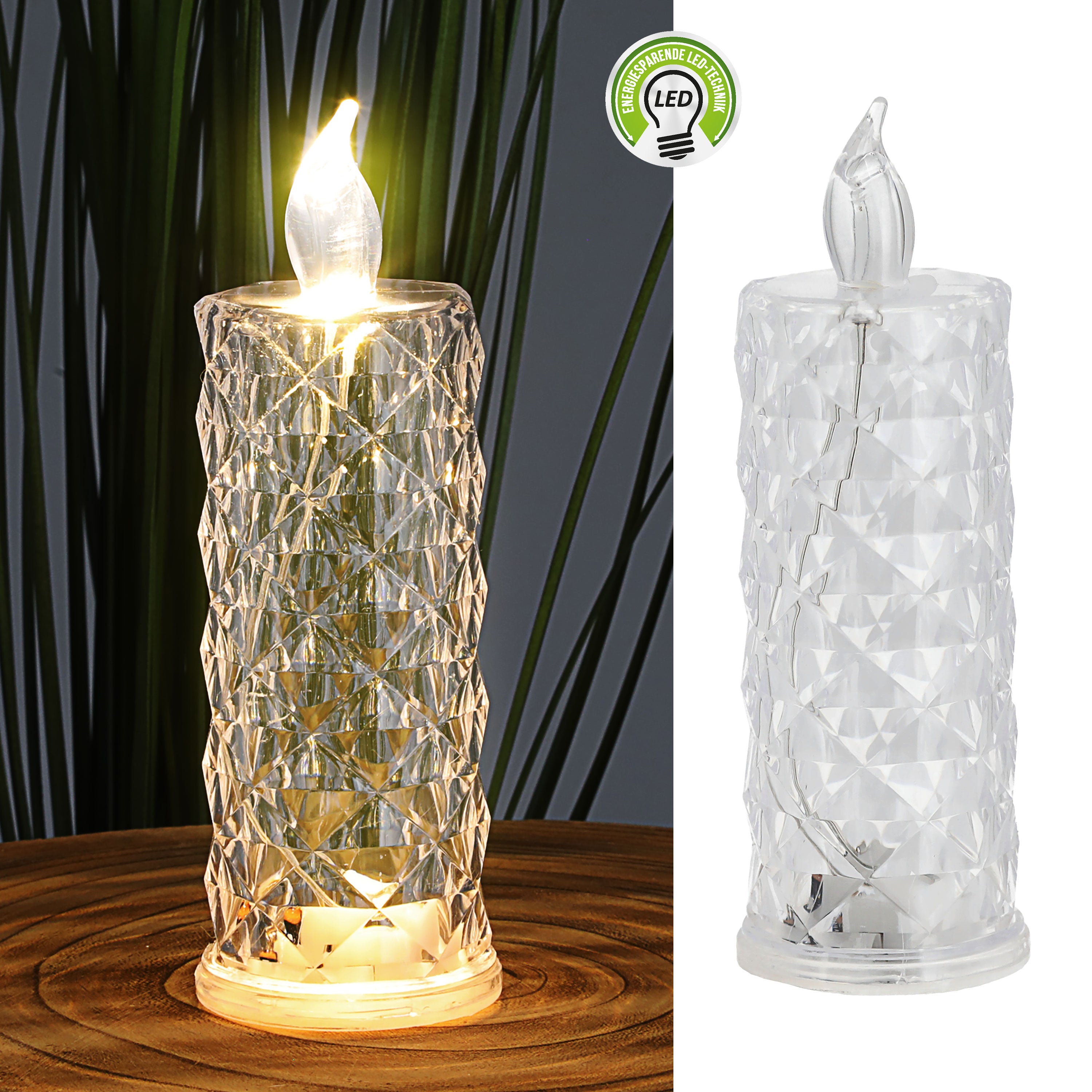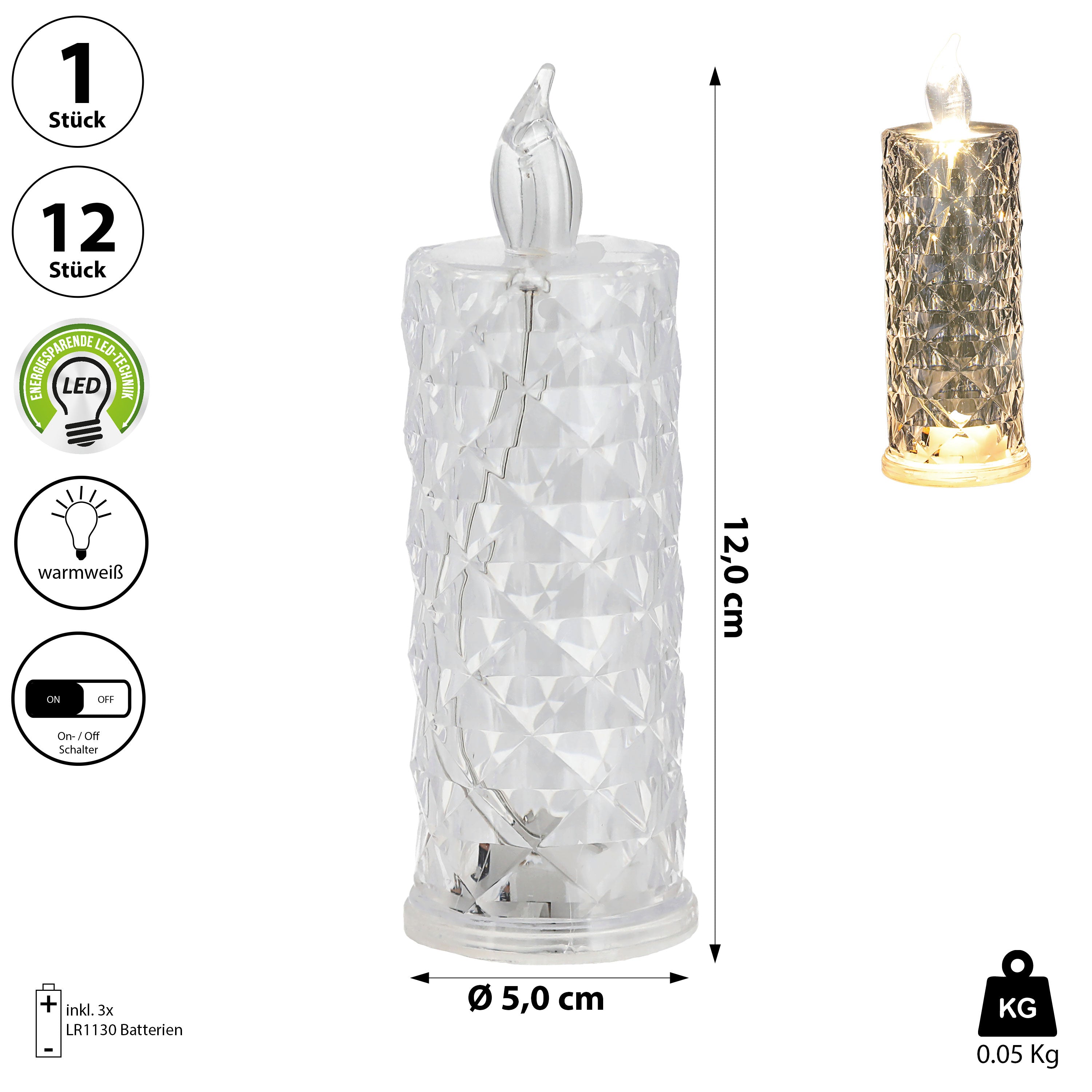 1/12x LED Kerze Kristall klar 5x12cm Kunststoff warmweiß Ein-/Ausschalter flammenlos Kristalloptik
