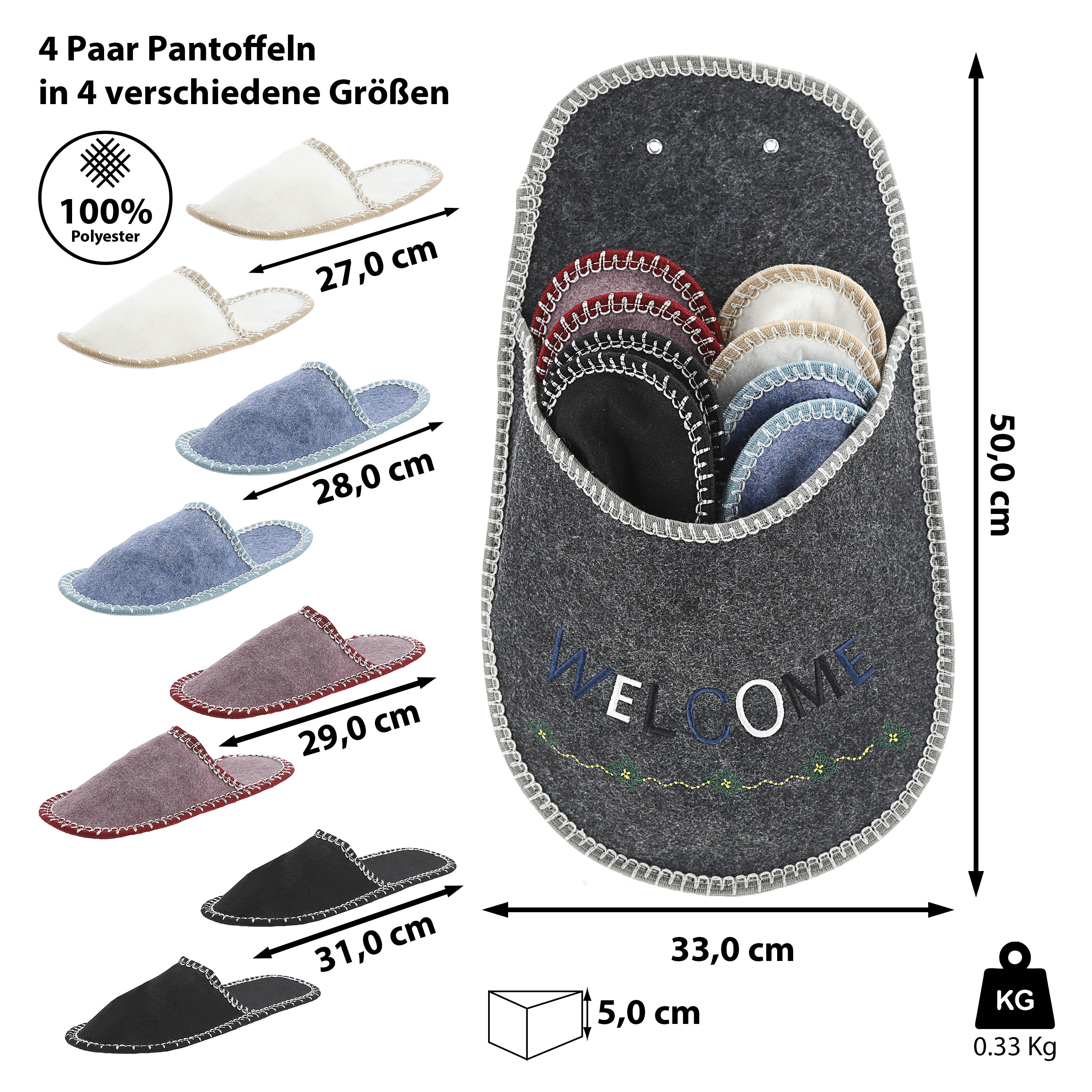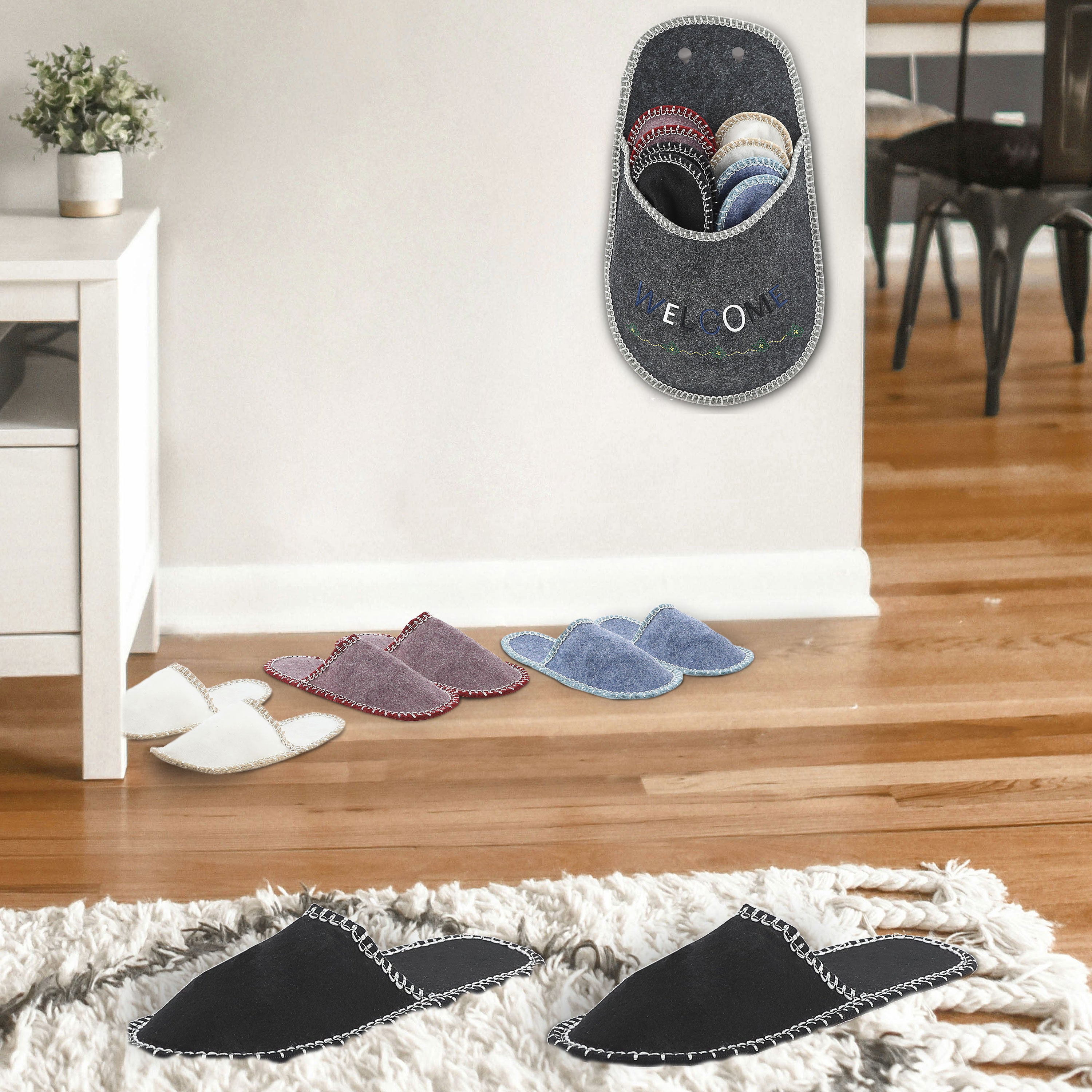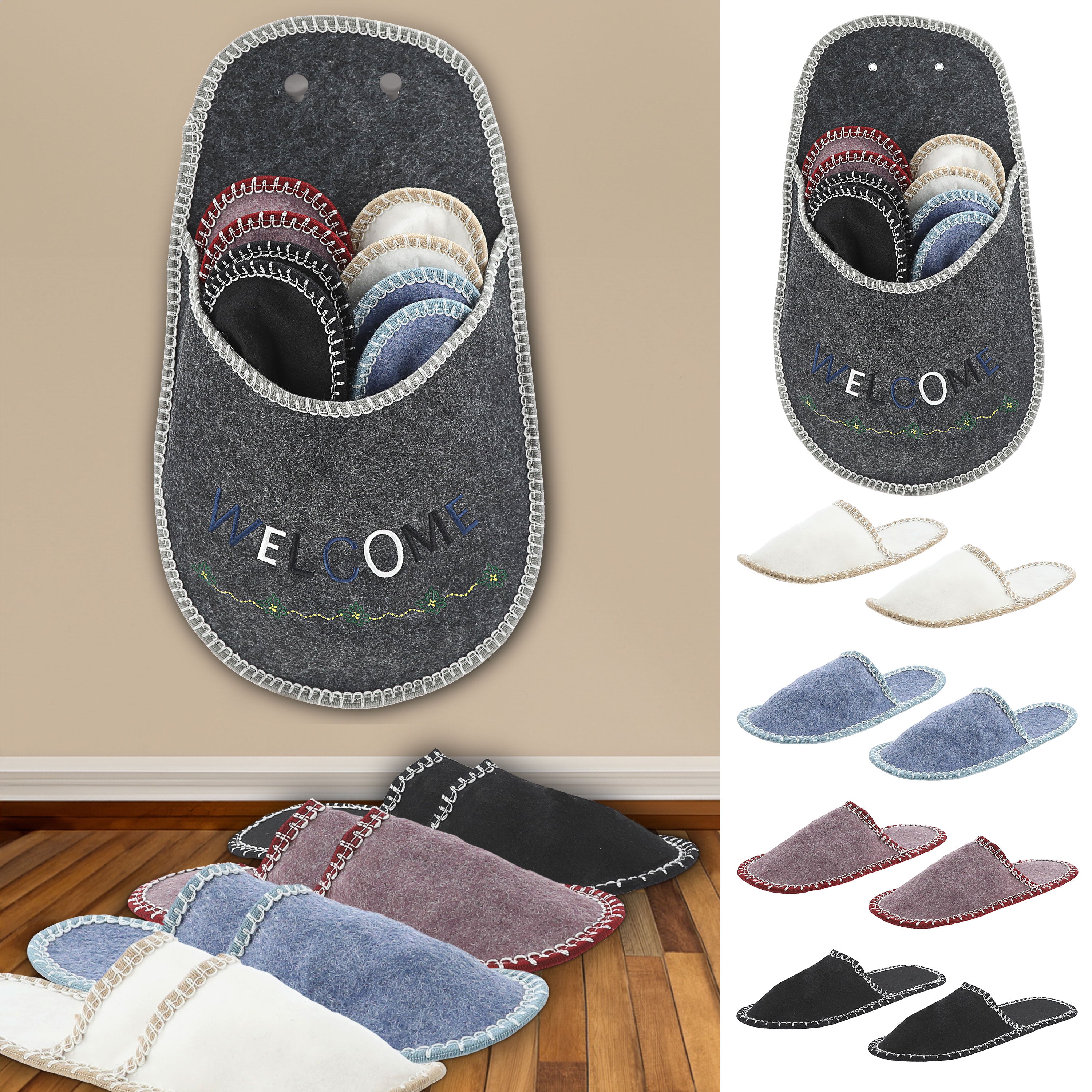 1x Gäste-Pantoffel-Set, "Welcome" 4 Paar in verschiedenen Größen Filz Hausschuhe Gästehaus