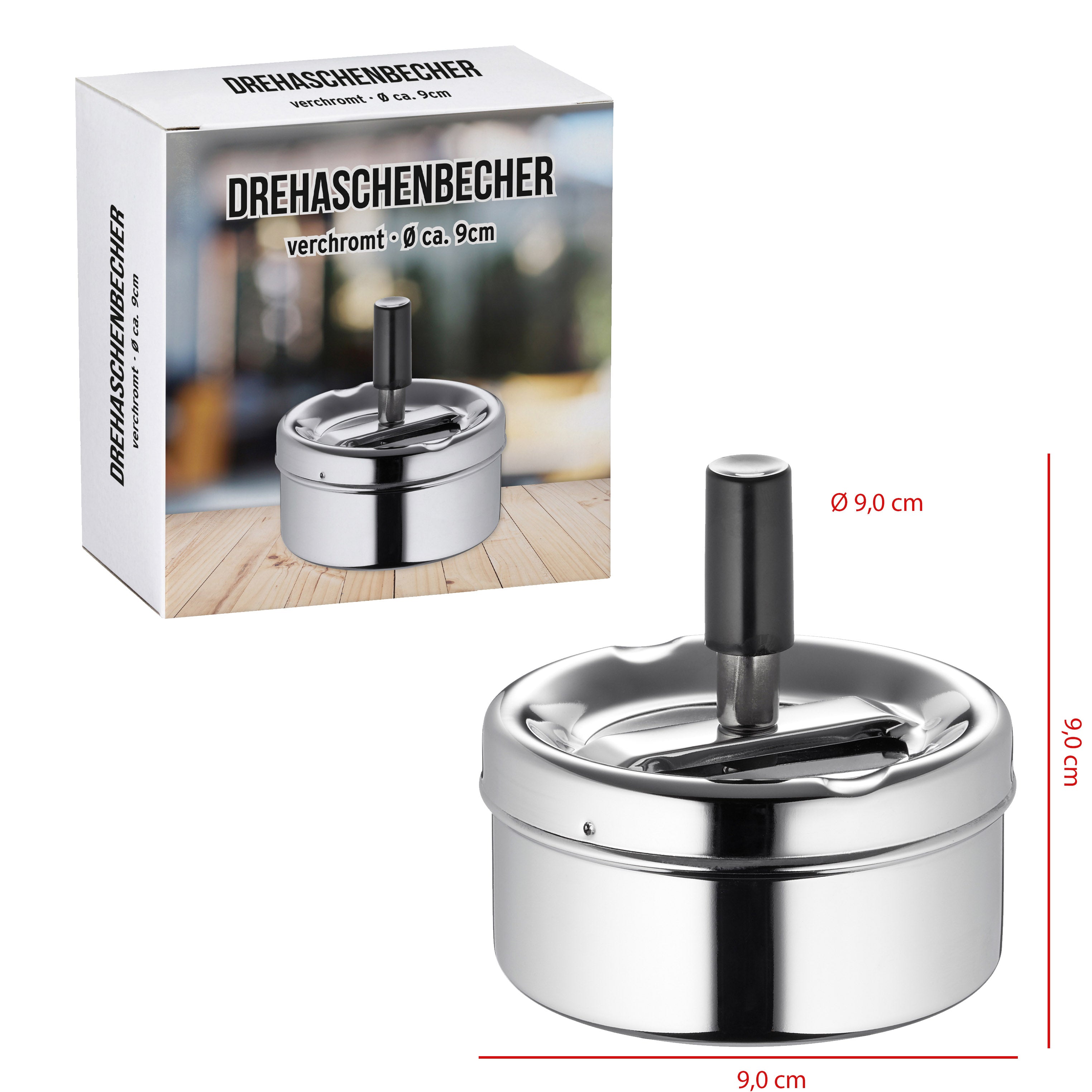 1x Verchromter Drehaschenbecher, 9cm Durchmesser, Metall, geruchsarm, Innen, Außen, Terrasse, Balkon, Wohnung