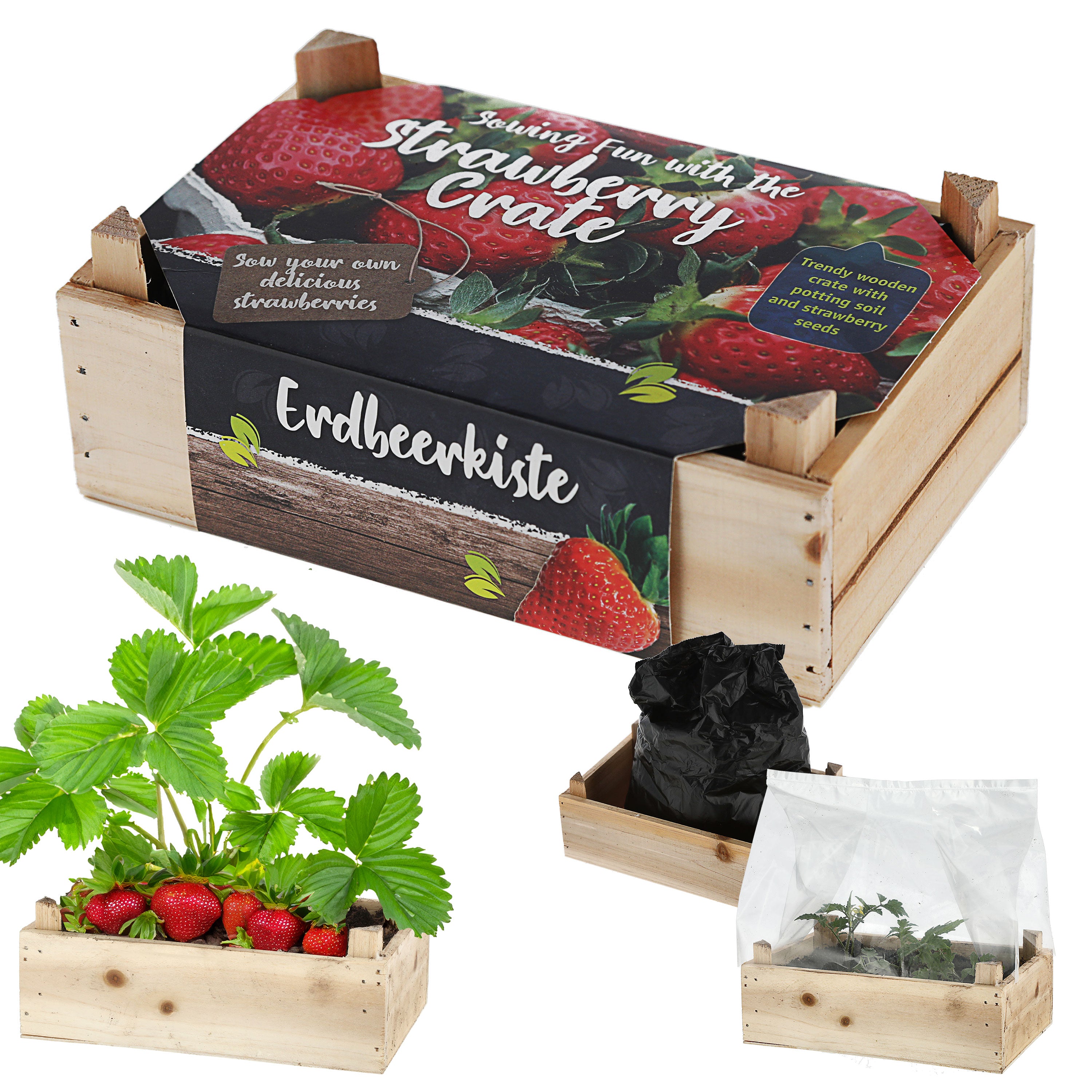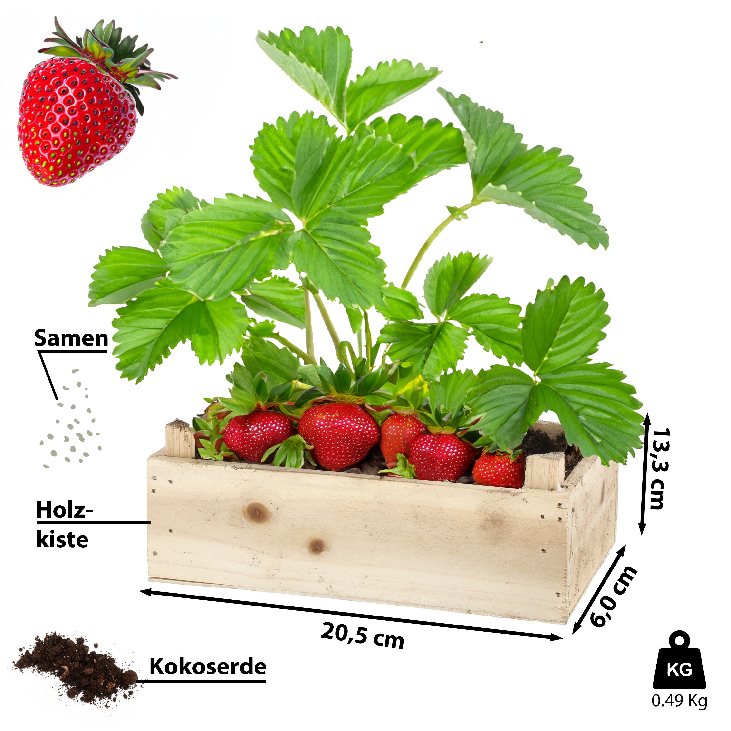 Anzuchtset 'Erdbeere' in Holzbox mit Inlay 20,5x13,3x6cm Samen Kokoserde Anzuchtkiste Erdbeerkiste