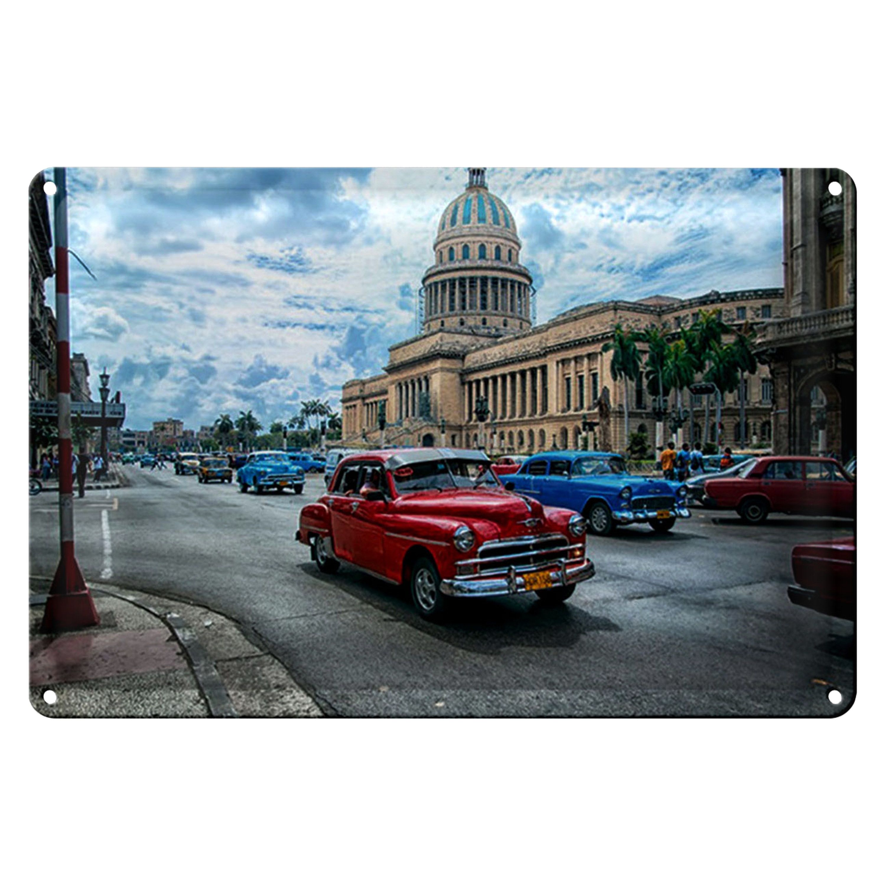 Blechschild 30x20cm Oldtimer in der Stadt Havanna Kuba rot blau