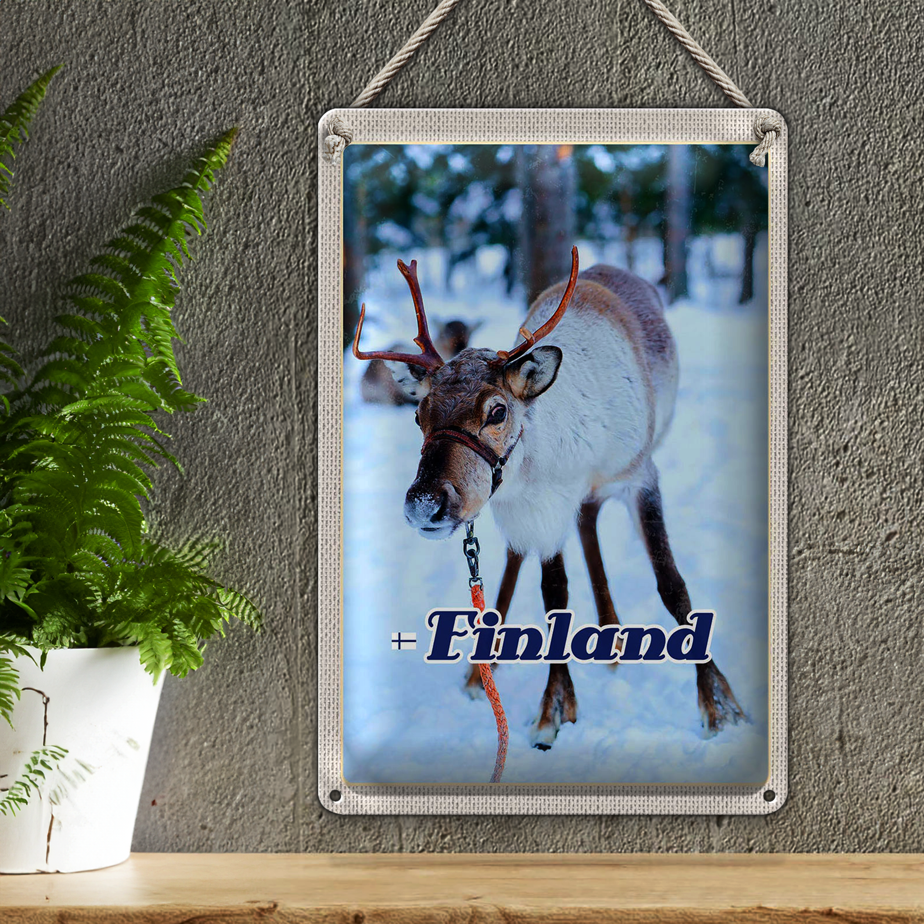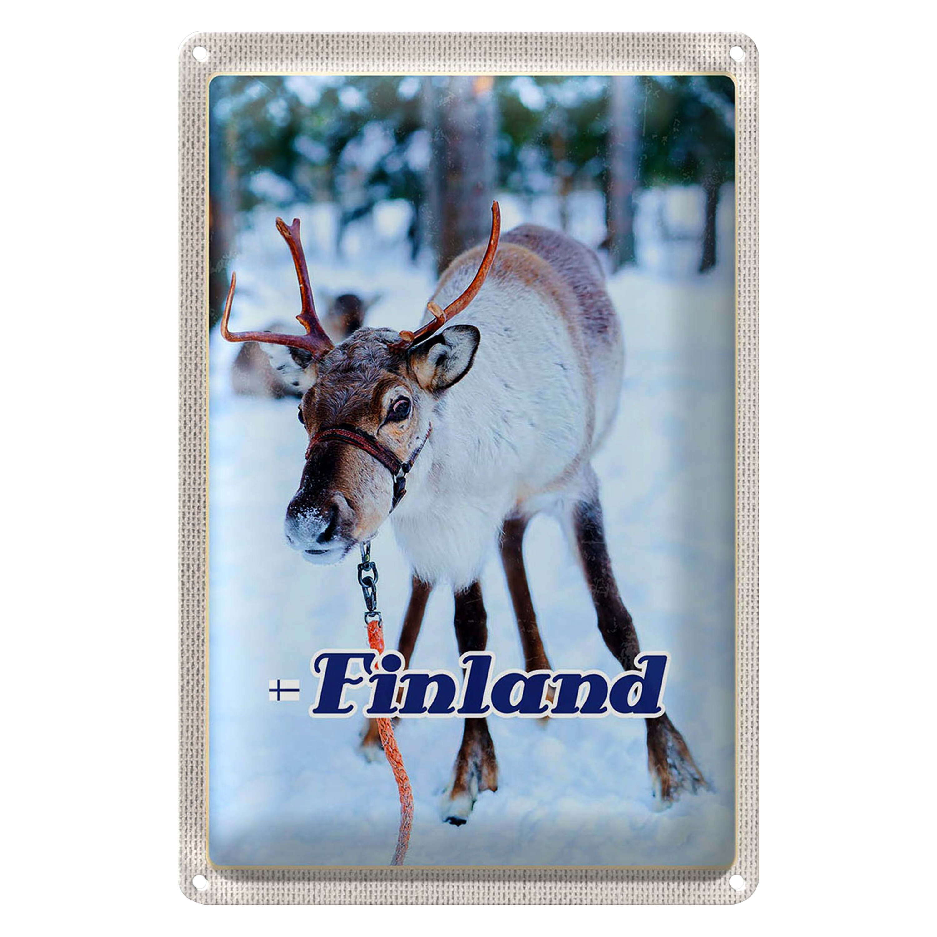 Blechschild Reise 20x30cm Finnland Hirsch Wald kalt Schnee