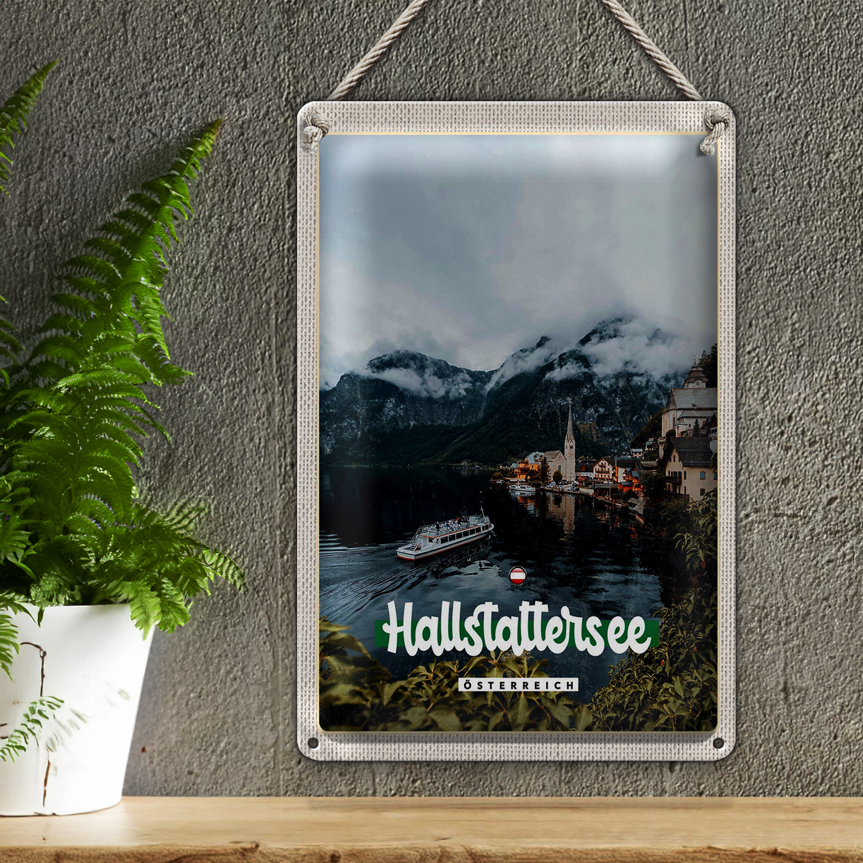 Blechschild Reise 20x30cm Hallstattersee Berge Schiff Boot Berg