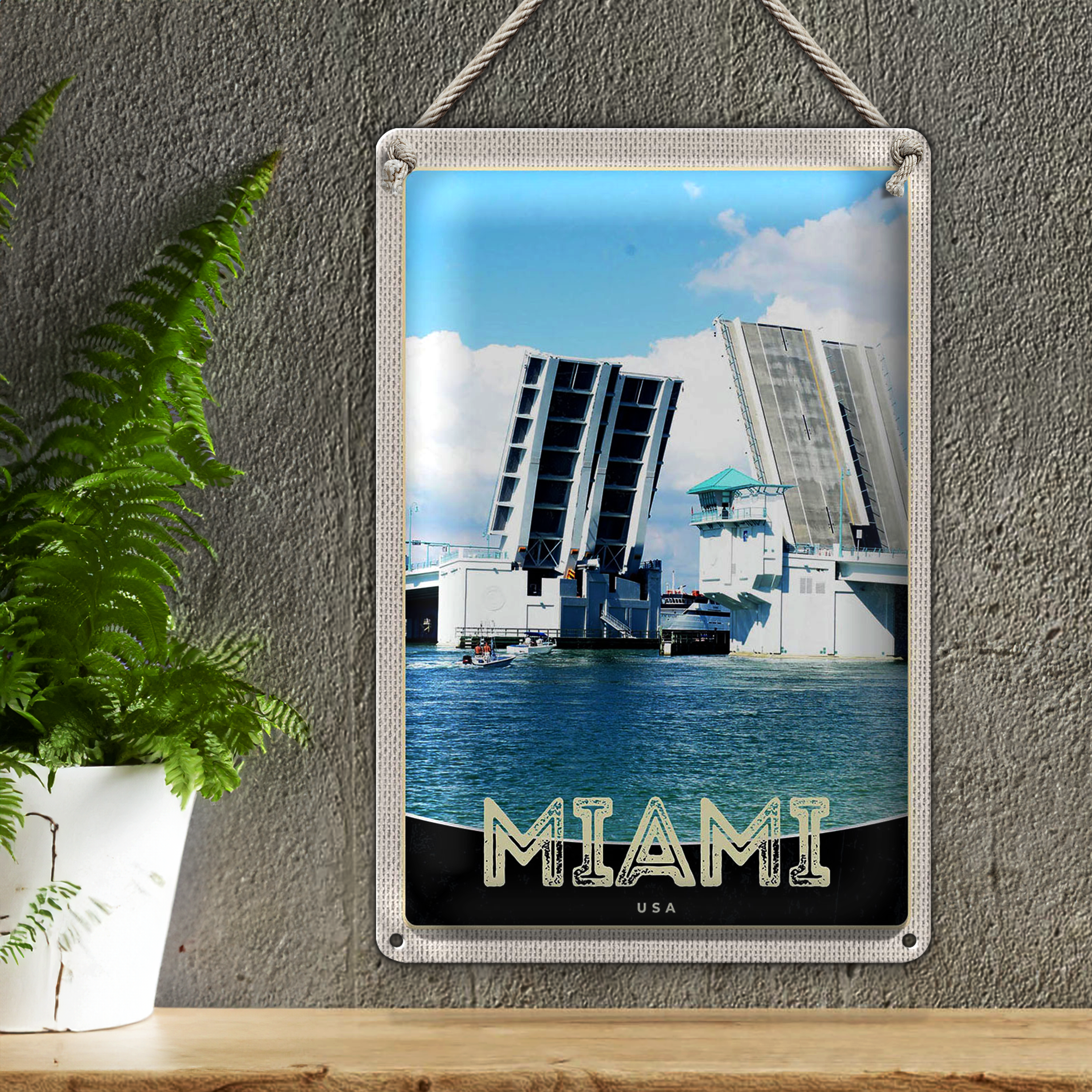 Blechschild Reise 20x30cm Miami Amerika USA Brücke Schiffe Meer