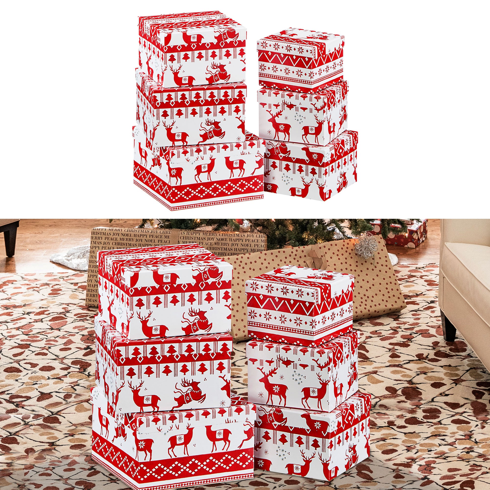 Boxenset 6tlg "Reindeer" weiß/rot Weihnachtsgeschenke Geschenkboxen Tannenbaum Rentier Schachteln Boxen Verpackung