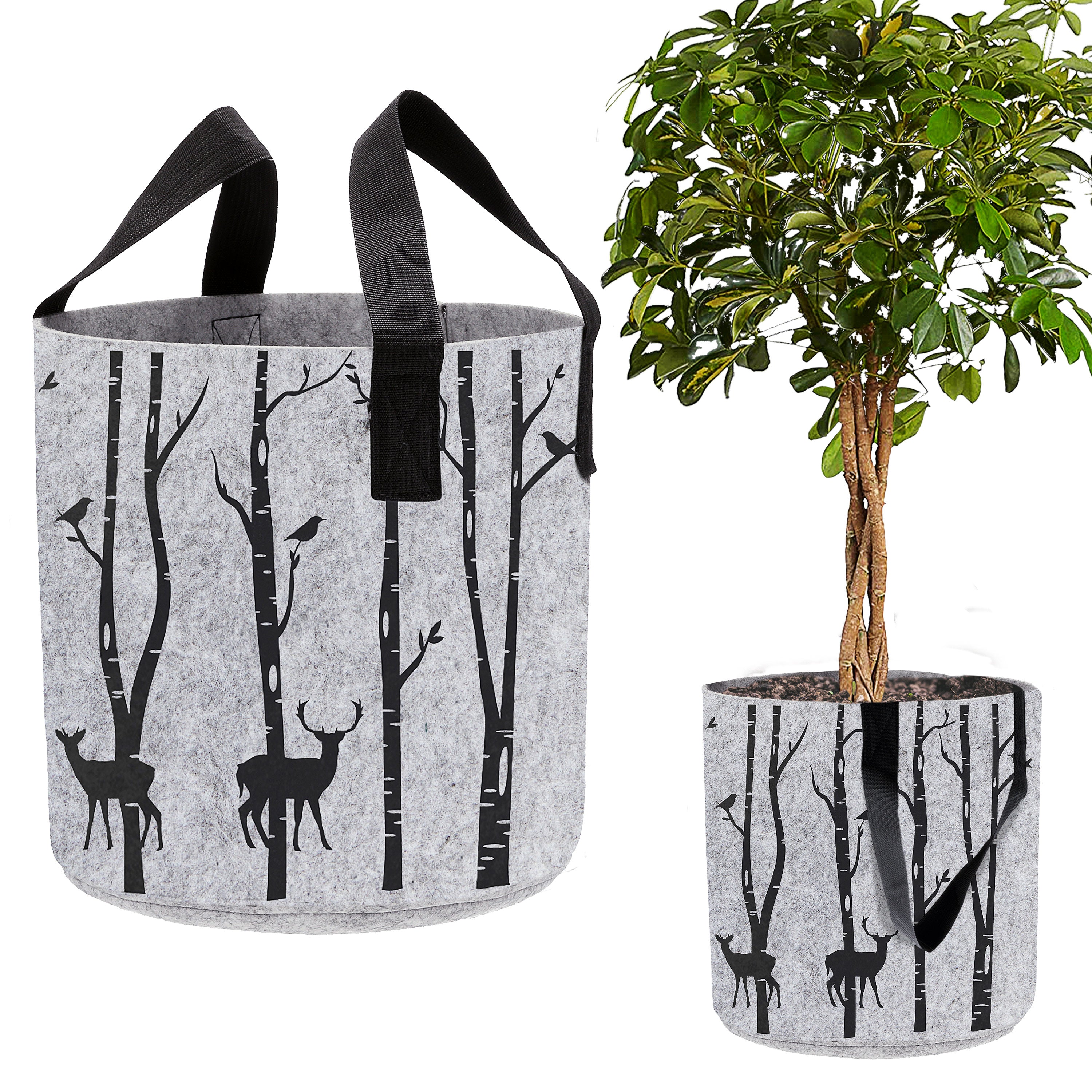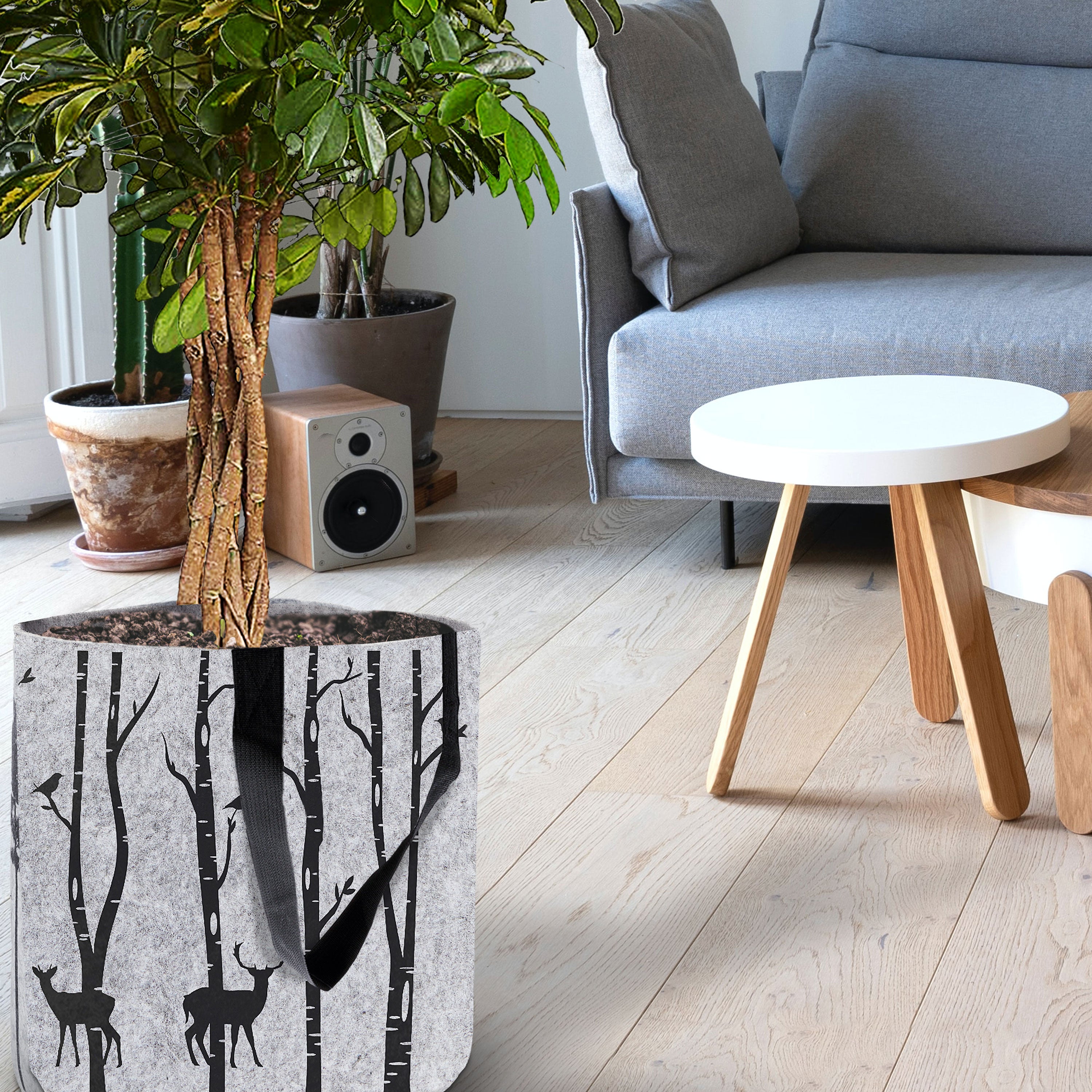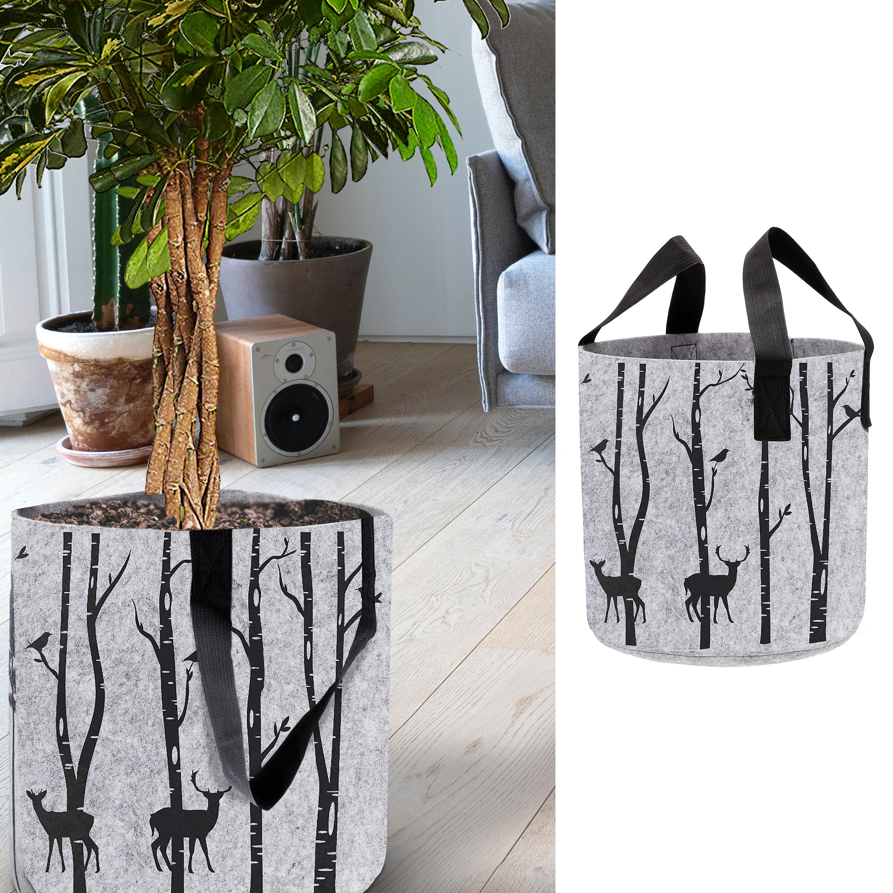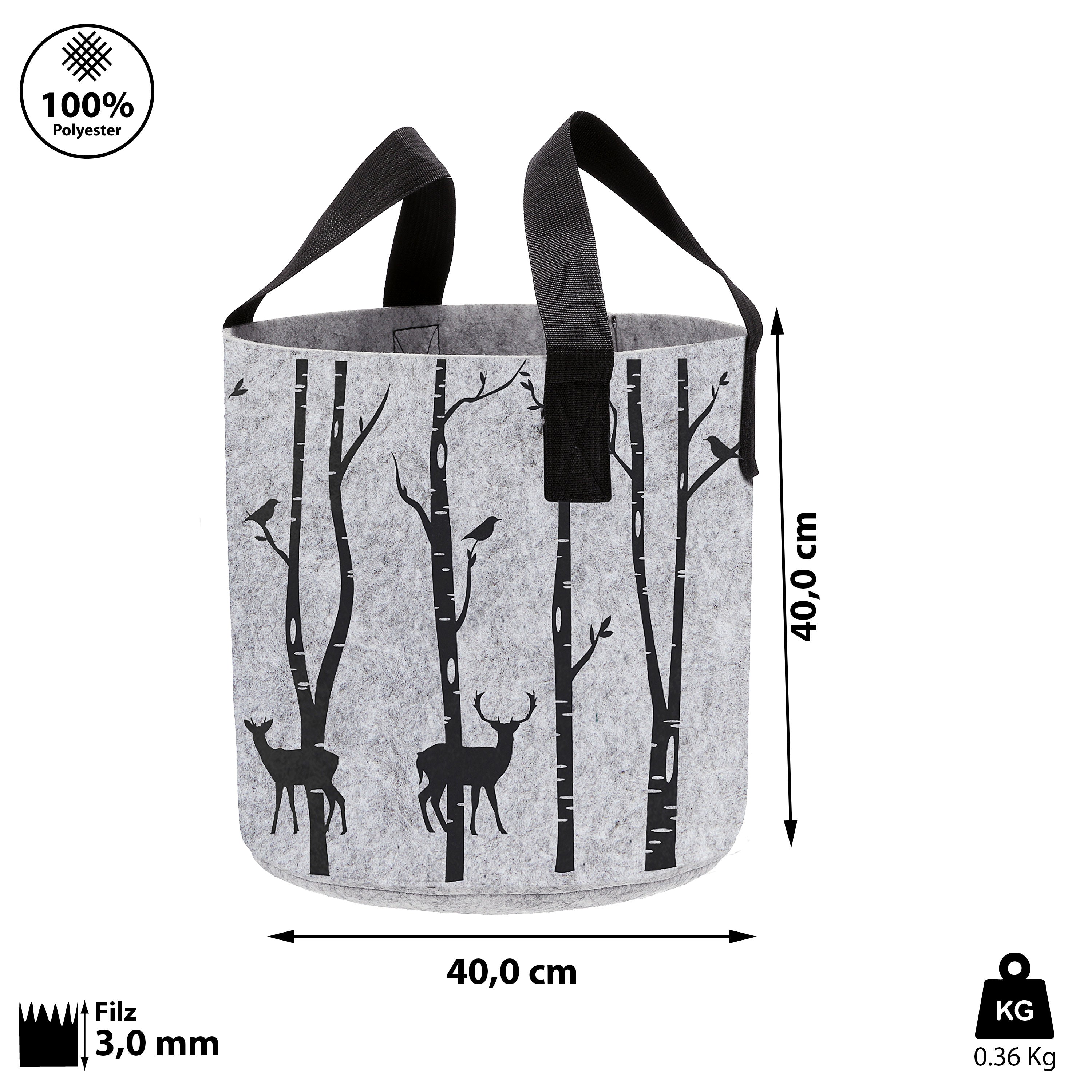 Filzkorb mit Henkel rund hellgrau 40x40cm bedruckt mit Waldmotiven Bäumen Hirsche Filzkorb Henkelkorb Korb
