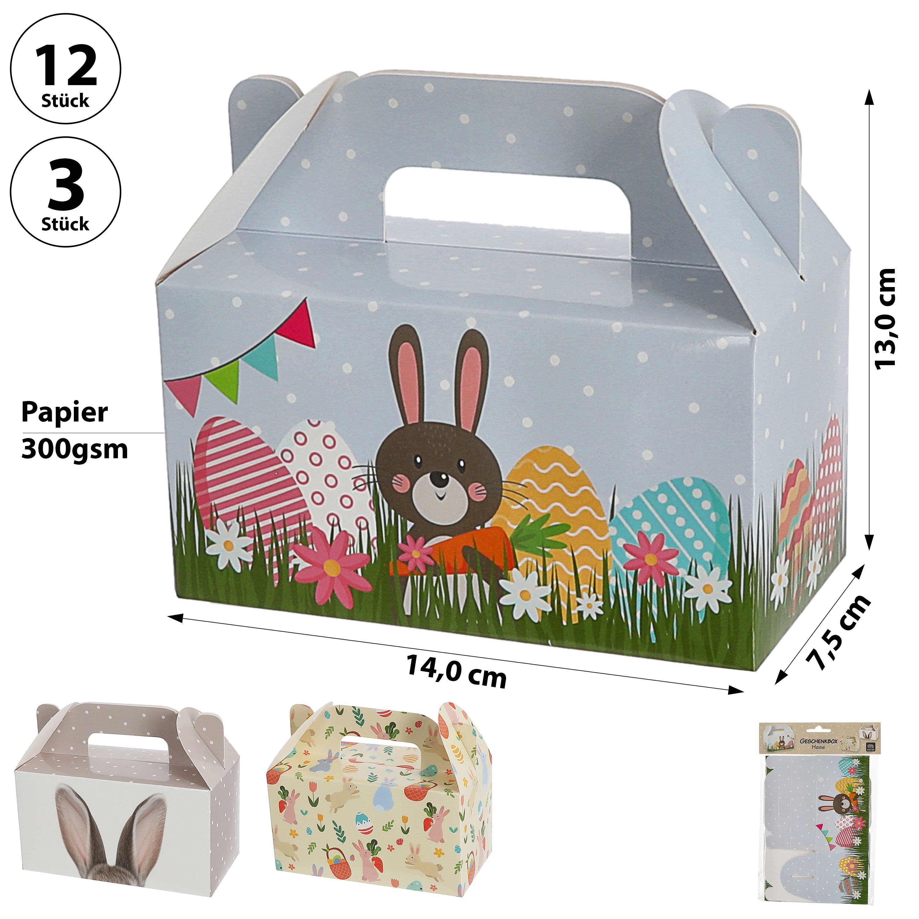 Osterbox mit Henkel 12er Set 14x13x7,5cm Papier 300gsm bunt Schachtel 3 Motive Osterdeko Geschenkbox