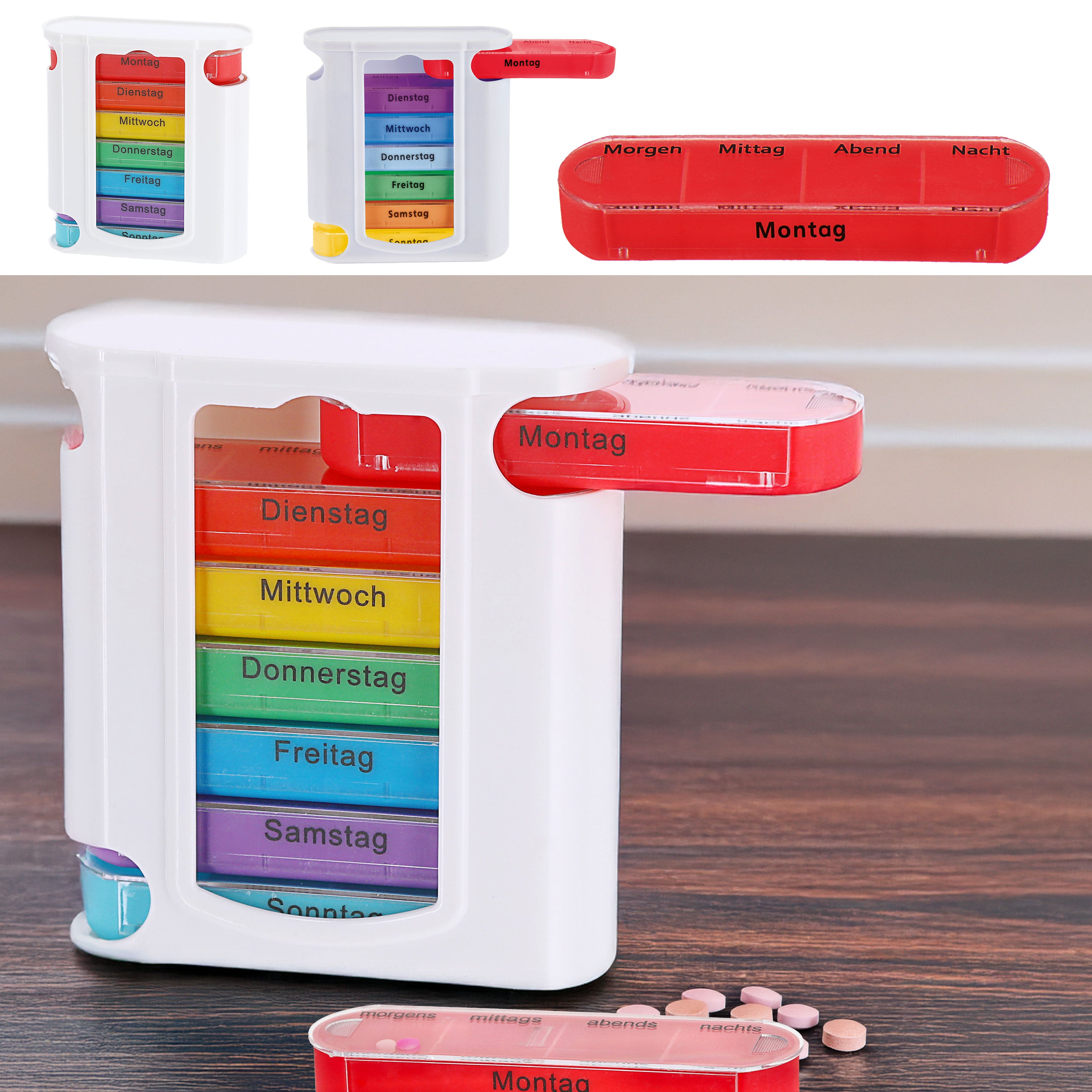 Pillenbox 'Deluxe' 7 Tage Regenbogenfarben weiß Kunststoff 11,5x13x4,3cm Beschriftung Wochentage Tageszeit Tablettenbox einzeln herausziehbar Pillendose Tablettendose