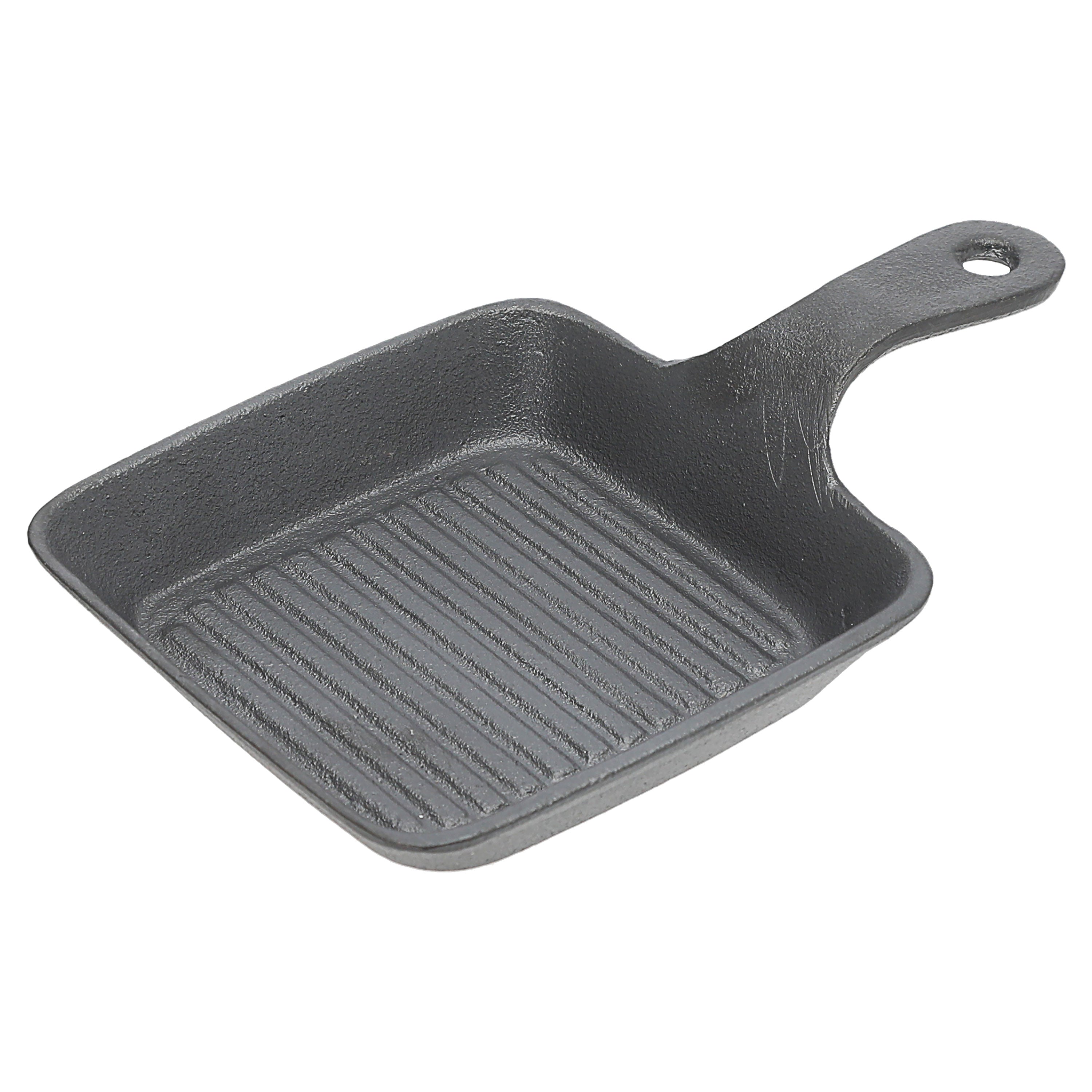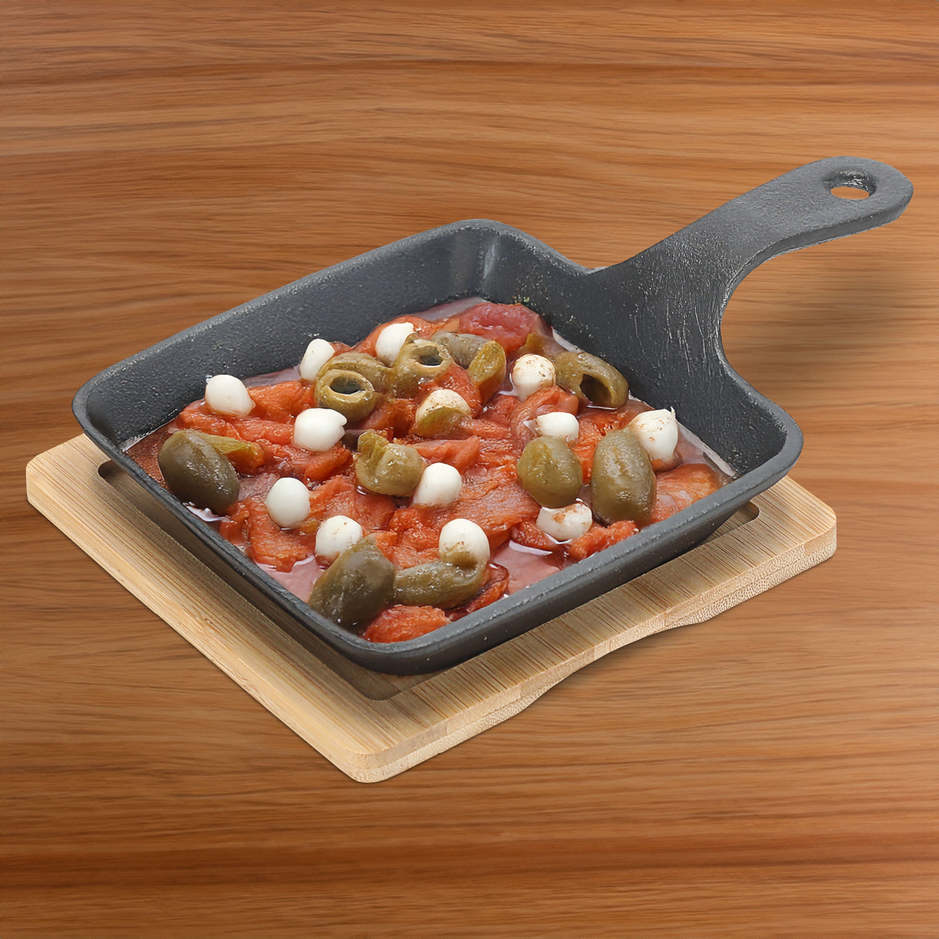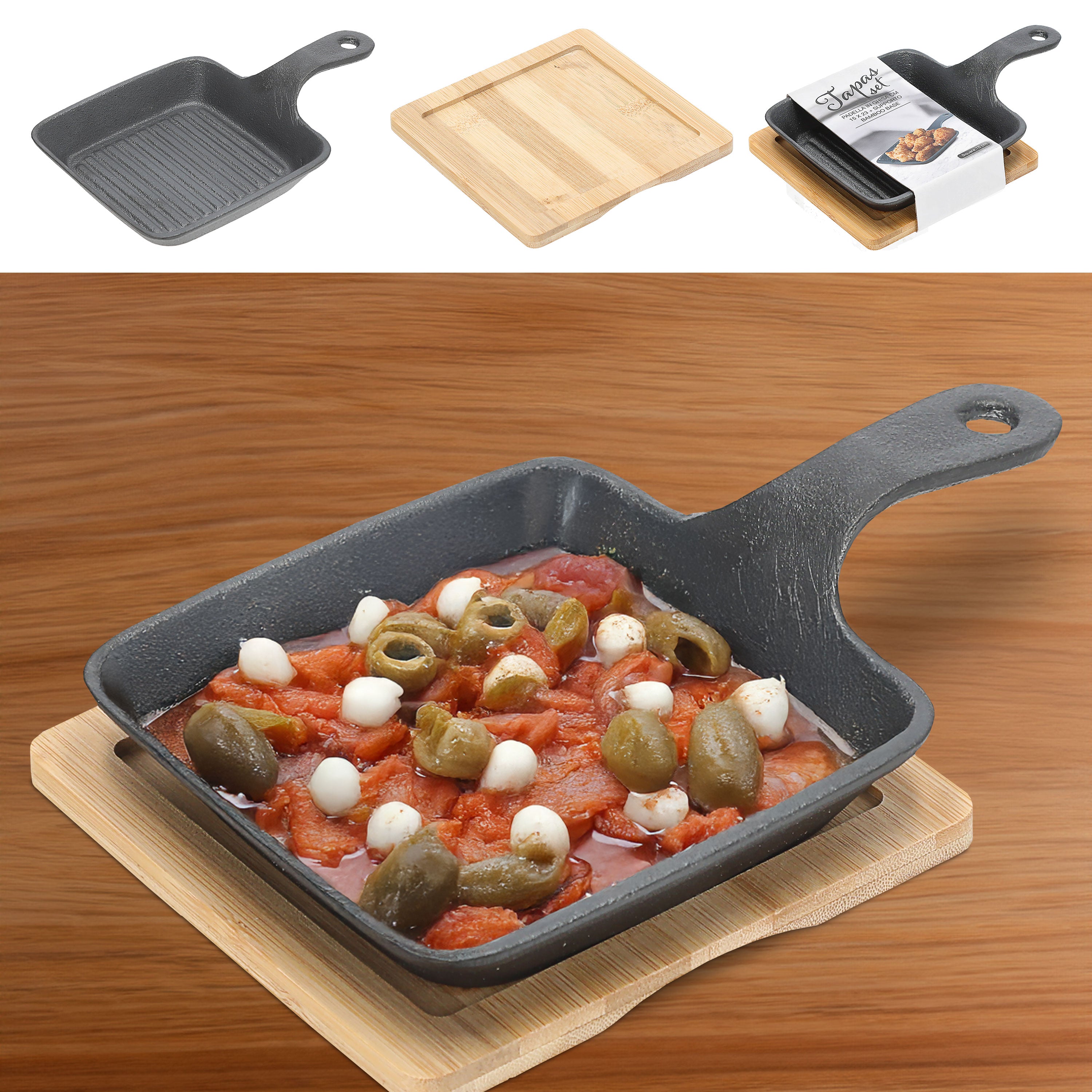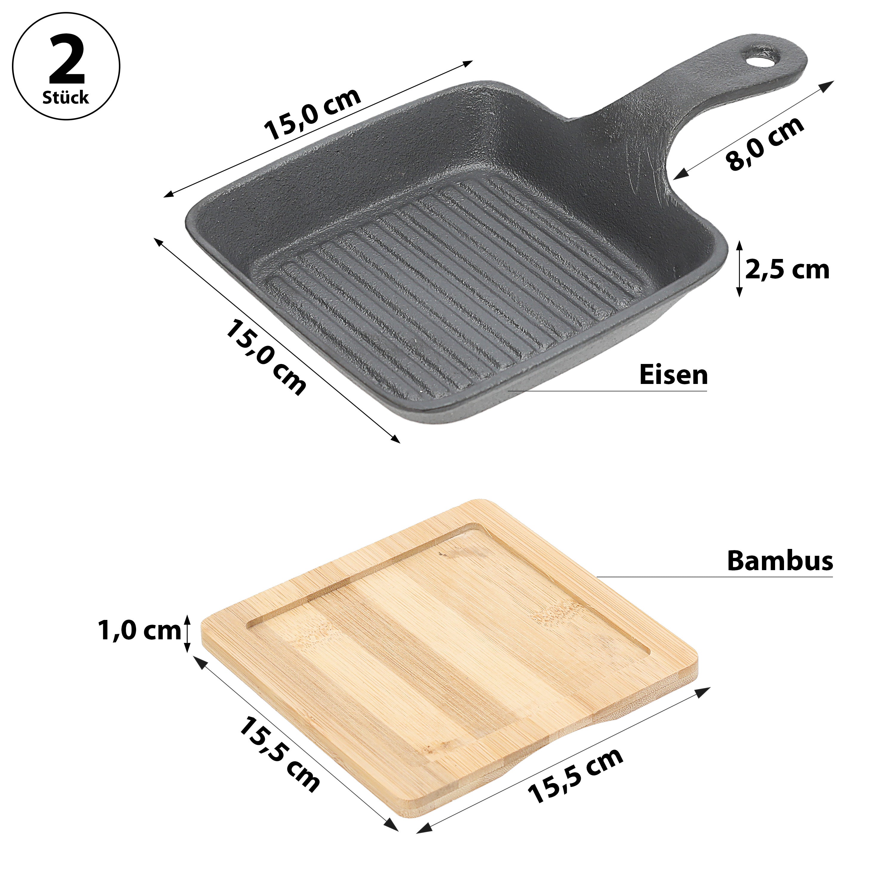 Servierpfanne 2er Set quadratisch mit Stiel 15x15x2,4cm Eisen Bambus Pfanne Bambusbrett Tischgeschirr Servierpfännchen