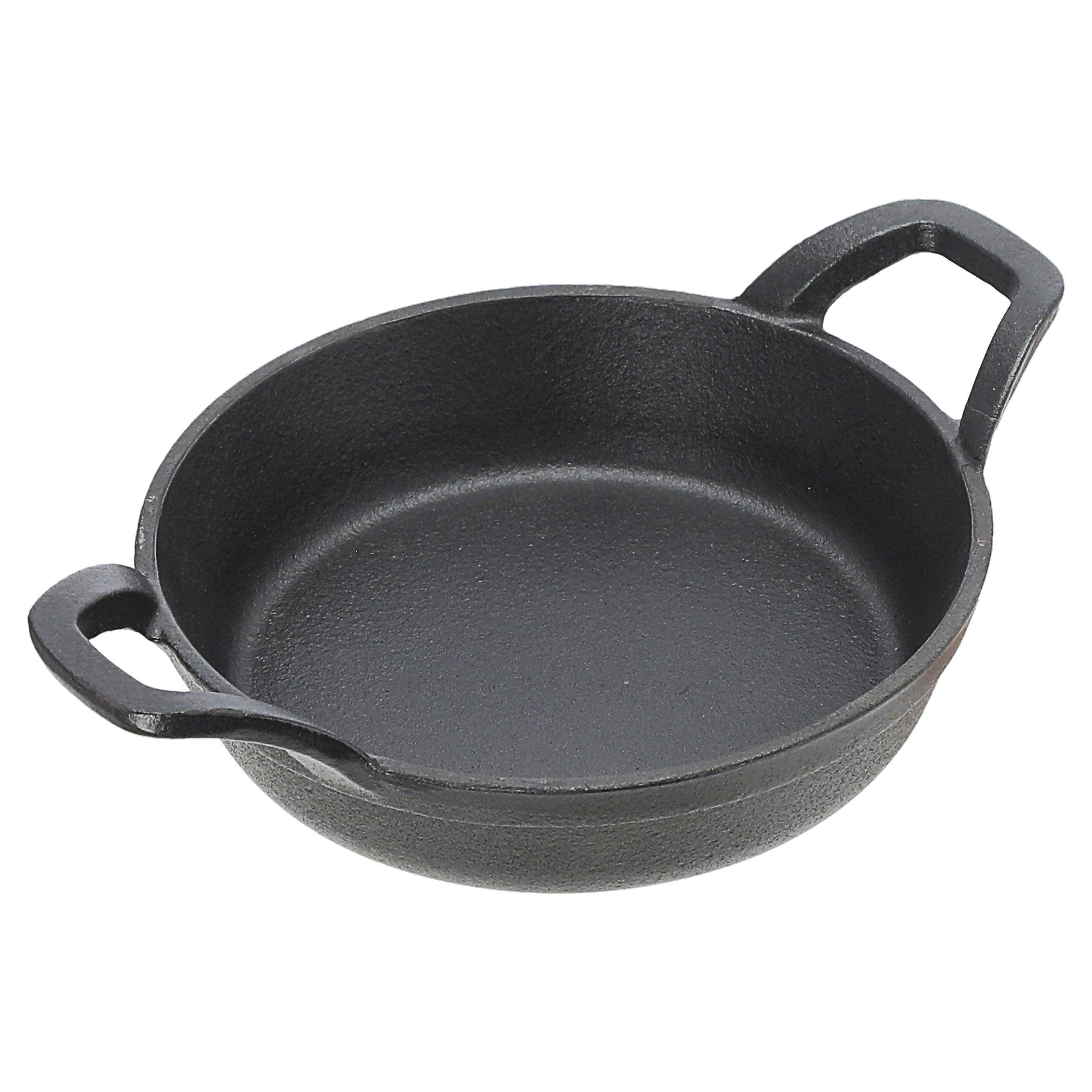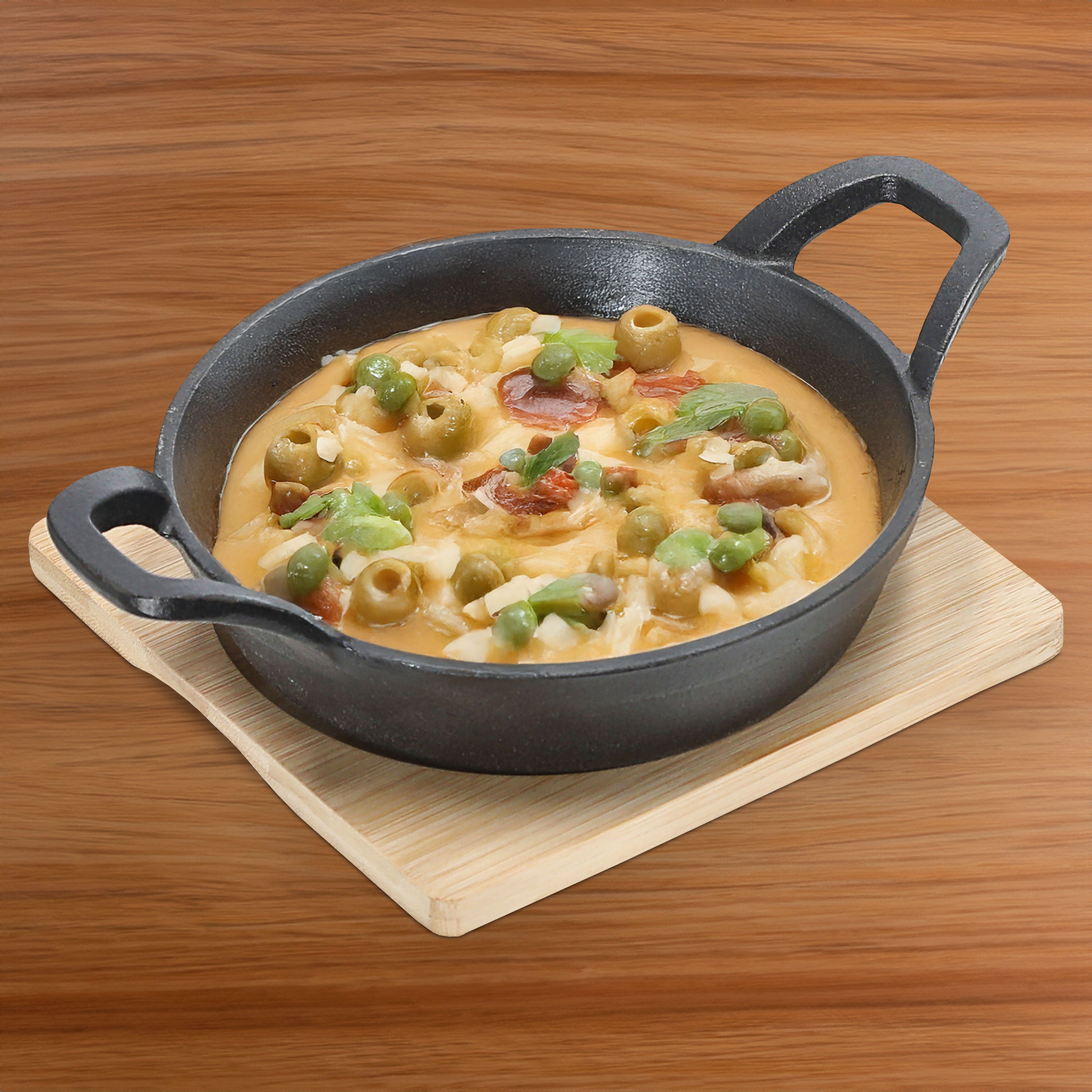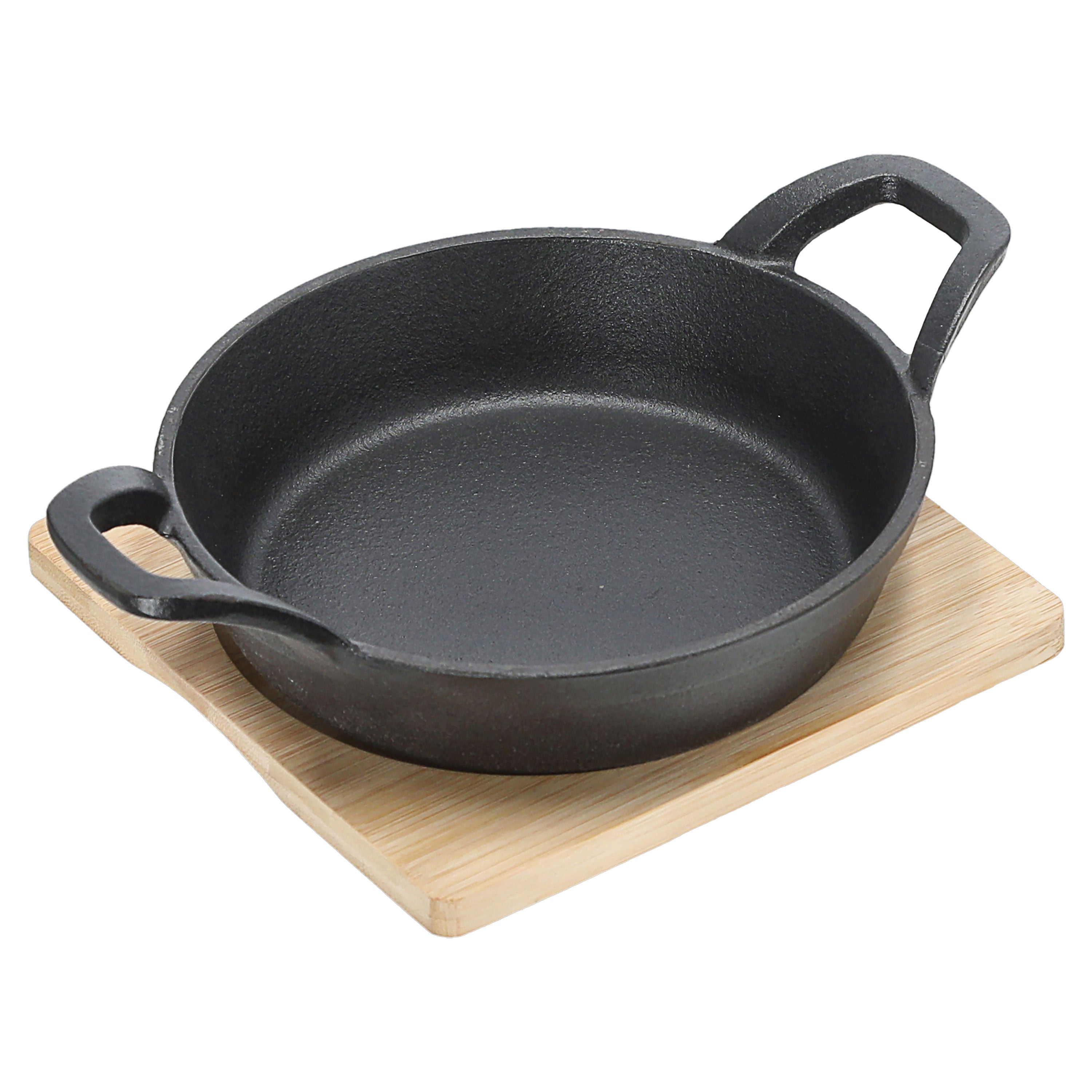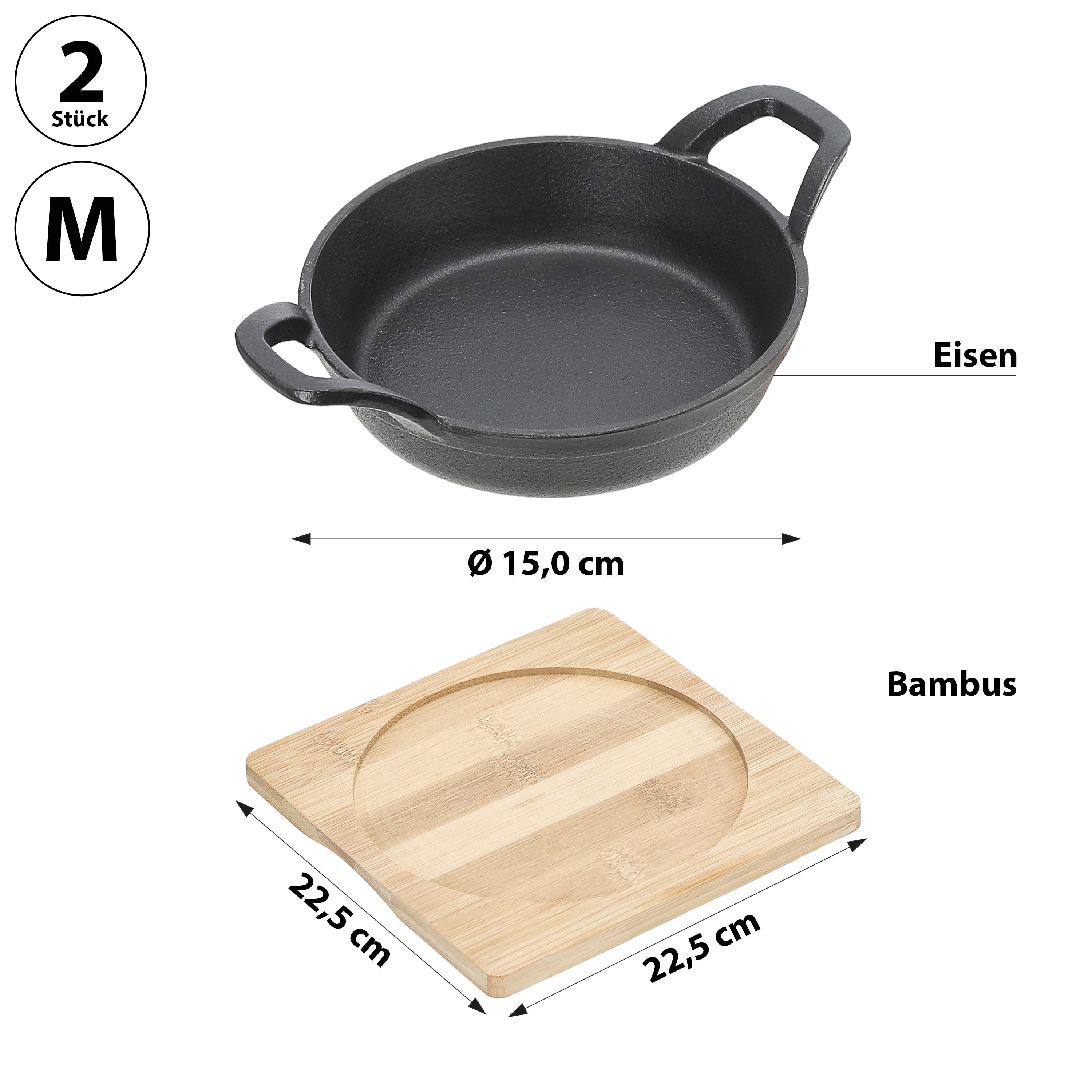 Servierpfanne 2er Set rund 15x6x22,5cm Eisen Bambus Pfanne Bambusbrett Tischgeschirr Servierpfännchen zwei Griffe