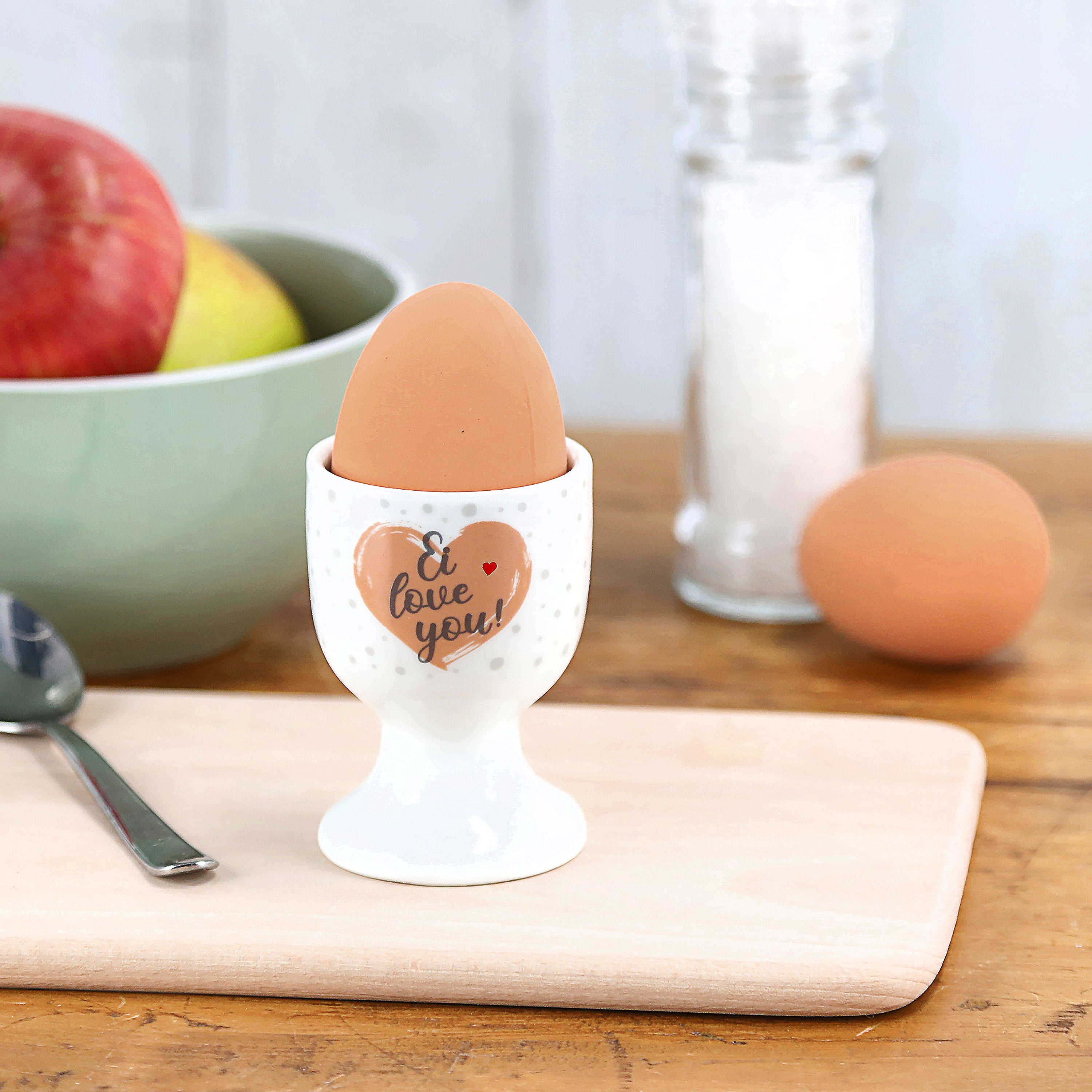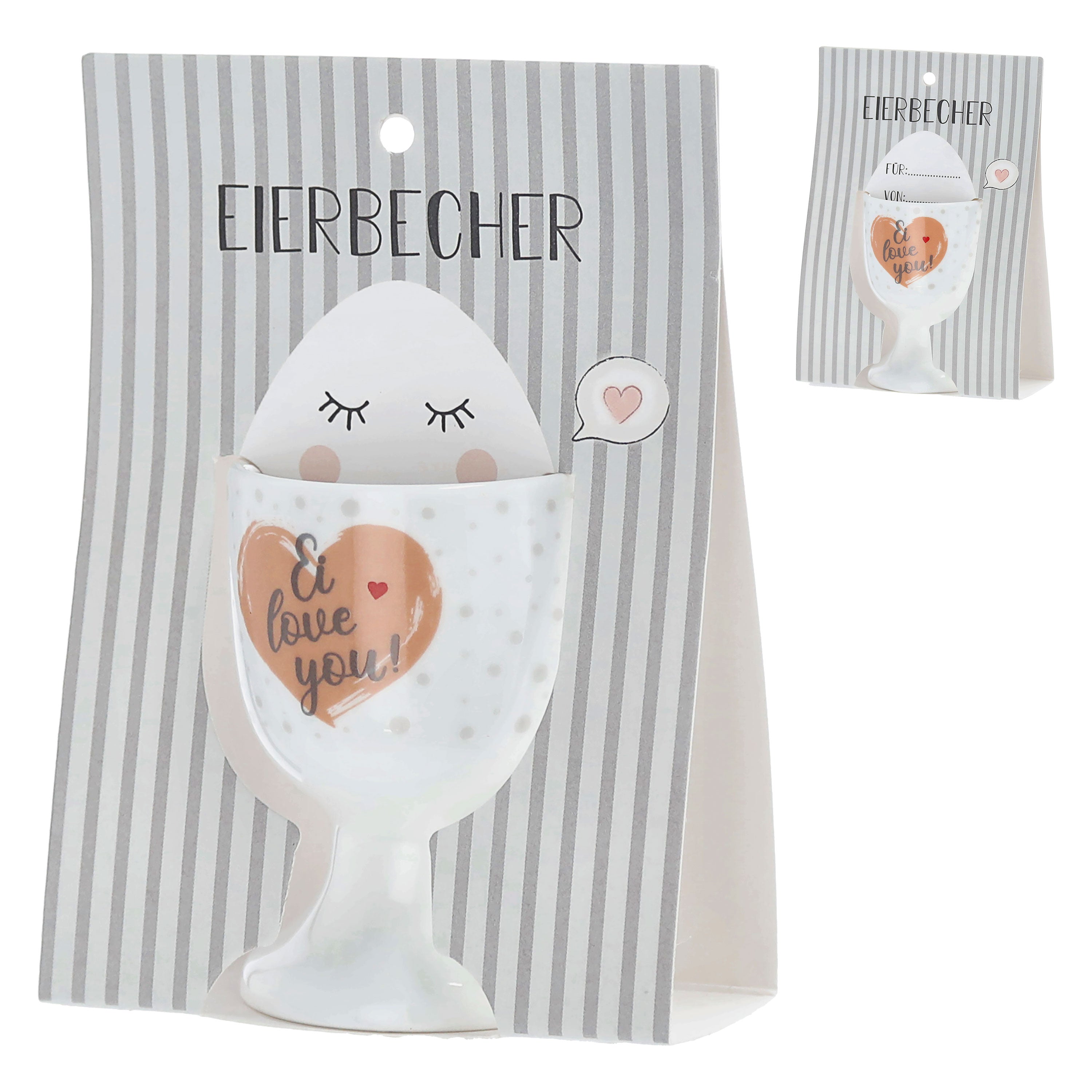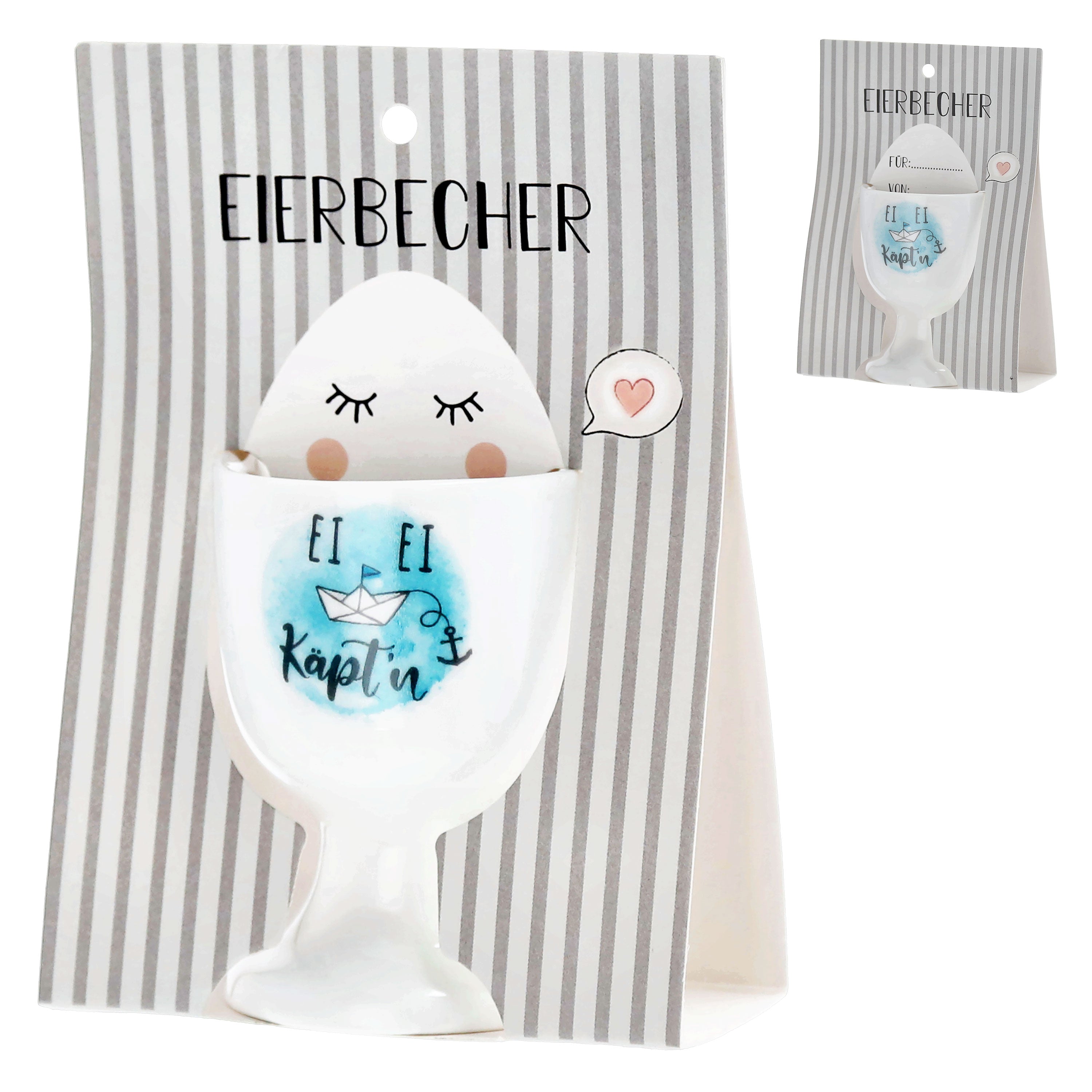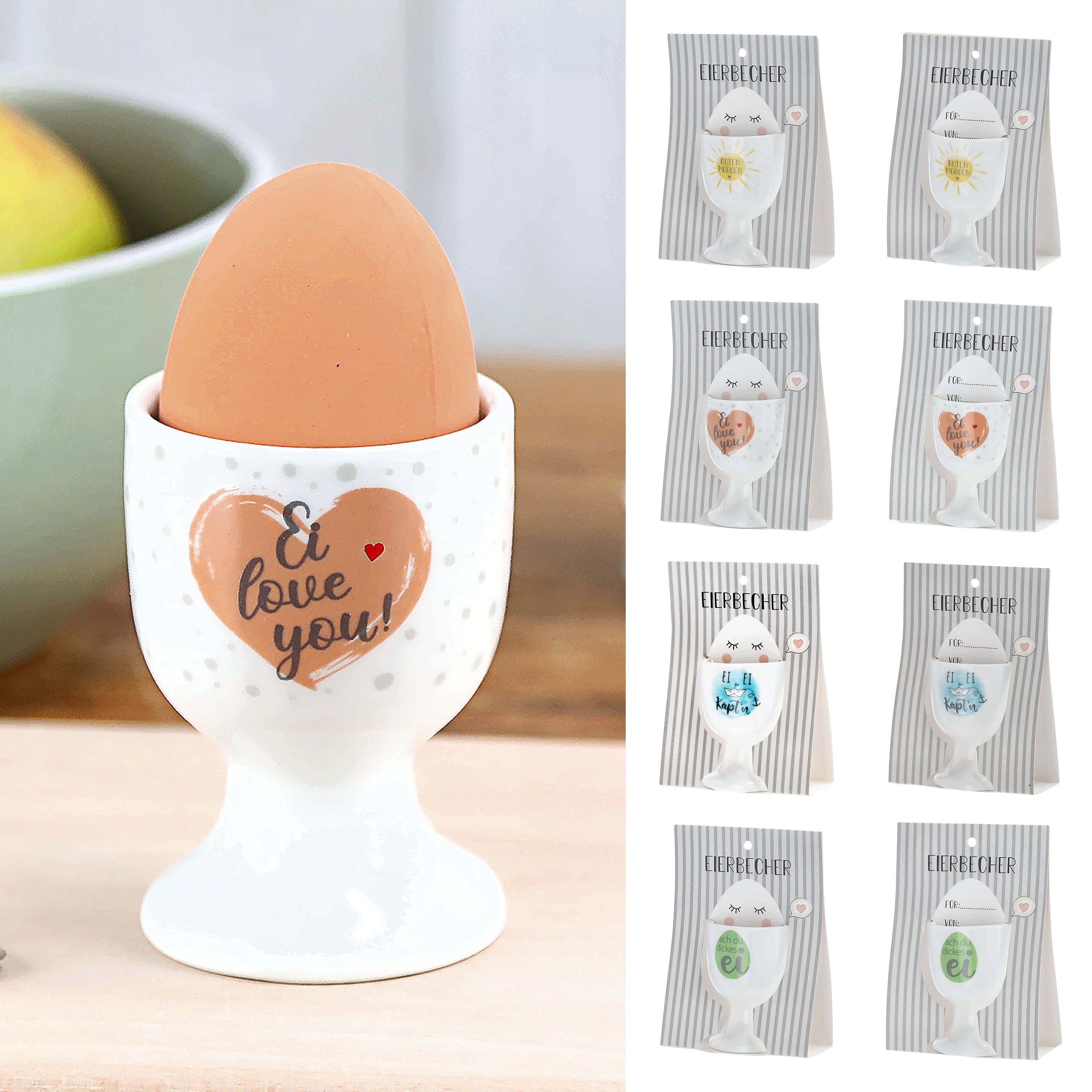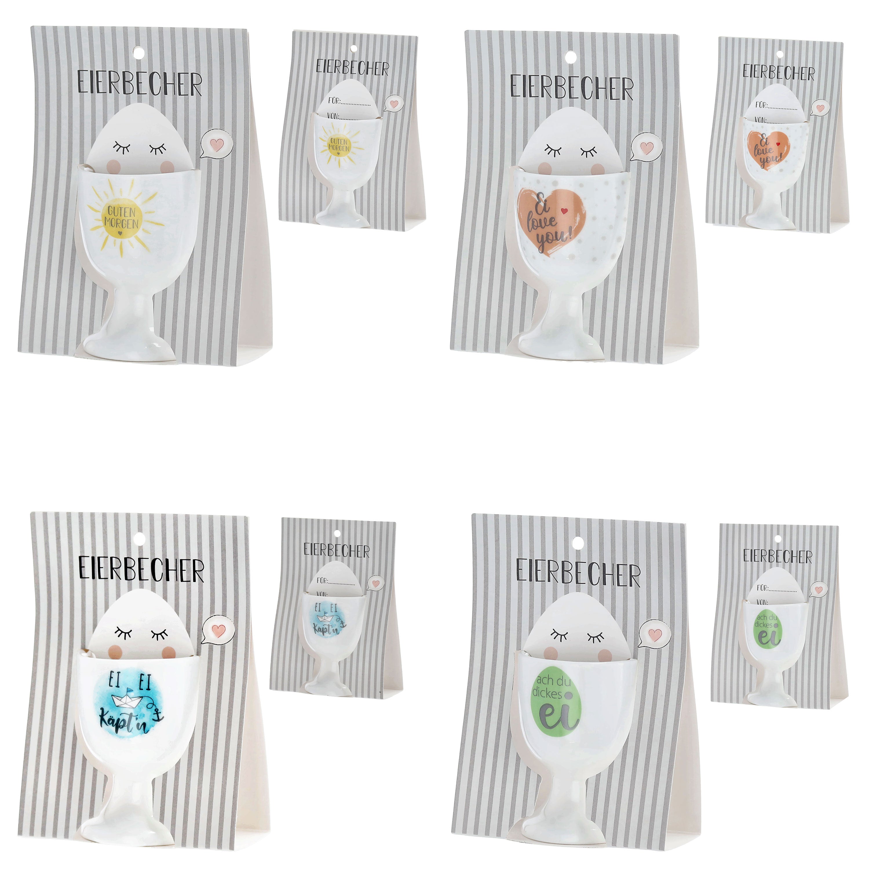 Eierbecher 4er Set 4 Motive Porzellan weiß 5x7cm weiß Halter für Eier Gute Laune Sprüche Eierhalter