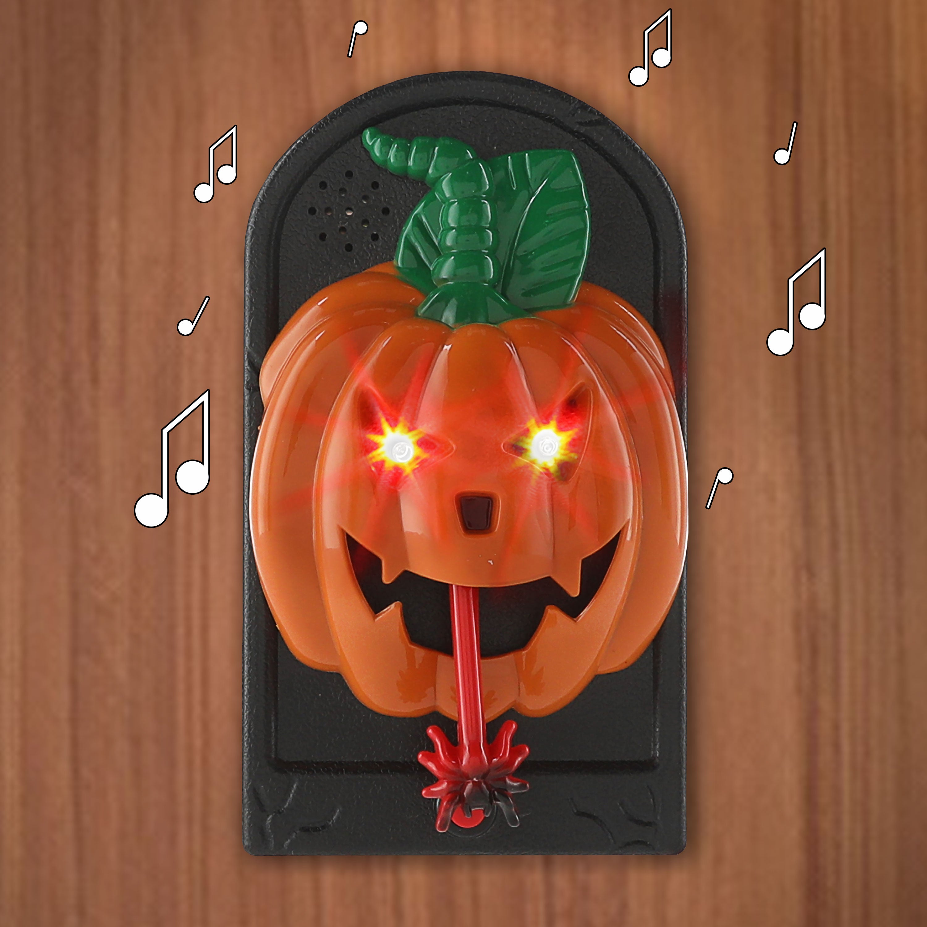 Halloween Türklingel Kürbis animiert 11x20x5cm Kunststoff Sound leuchtende Augen Spinnenzunge Klingel zum Aufhängen