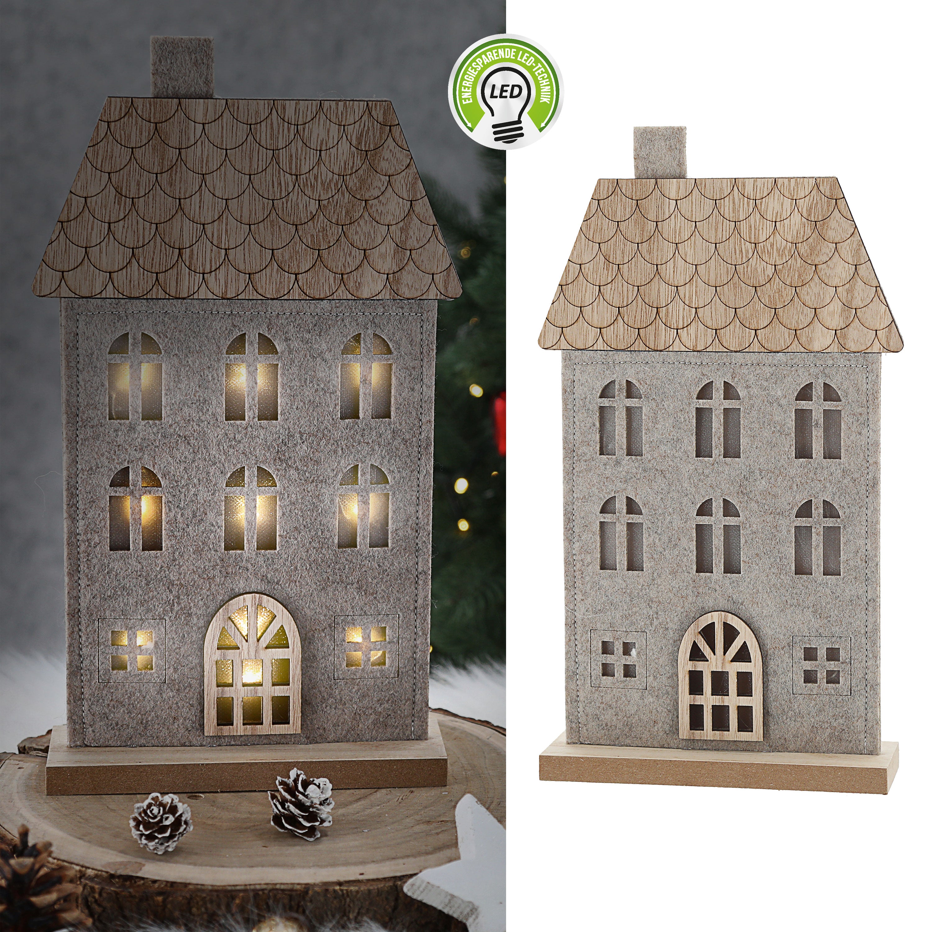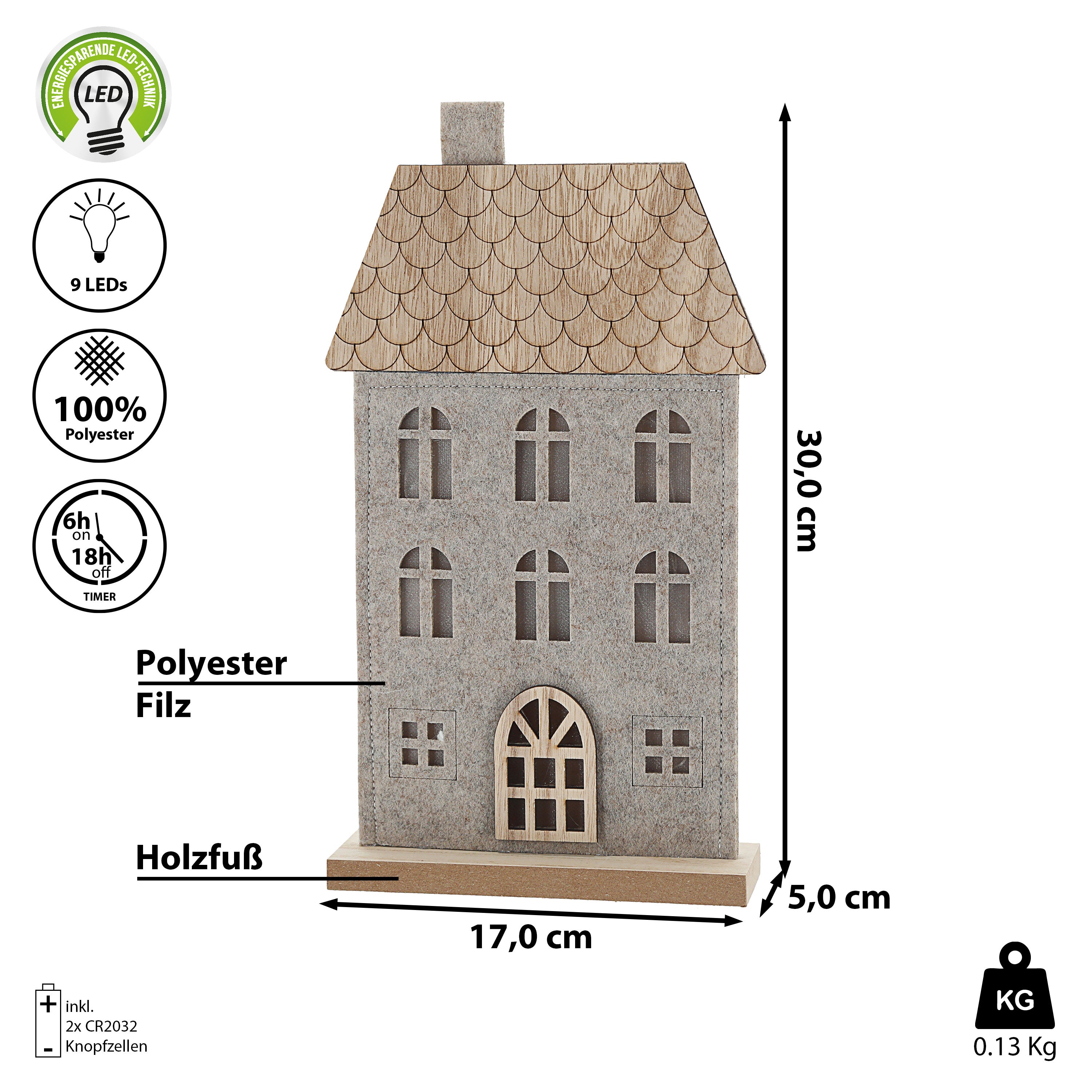 LED Haus auf Holzfuss Polyesterfilz 17x30x5cm 9 LEDs batteriebetrieben Timerfunktion Leuchthaus Dekohaus