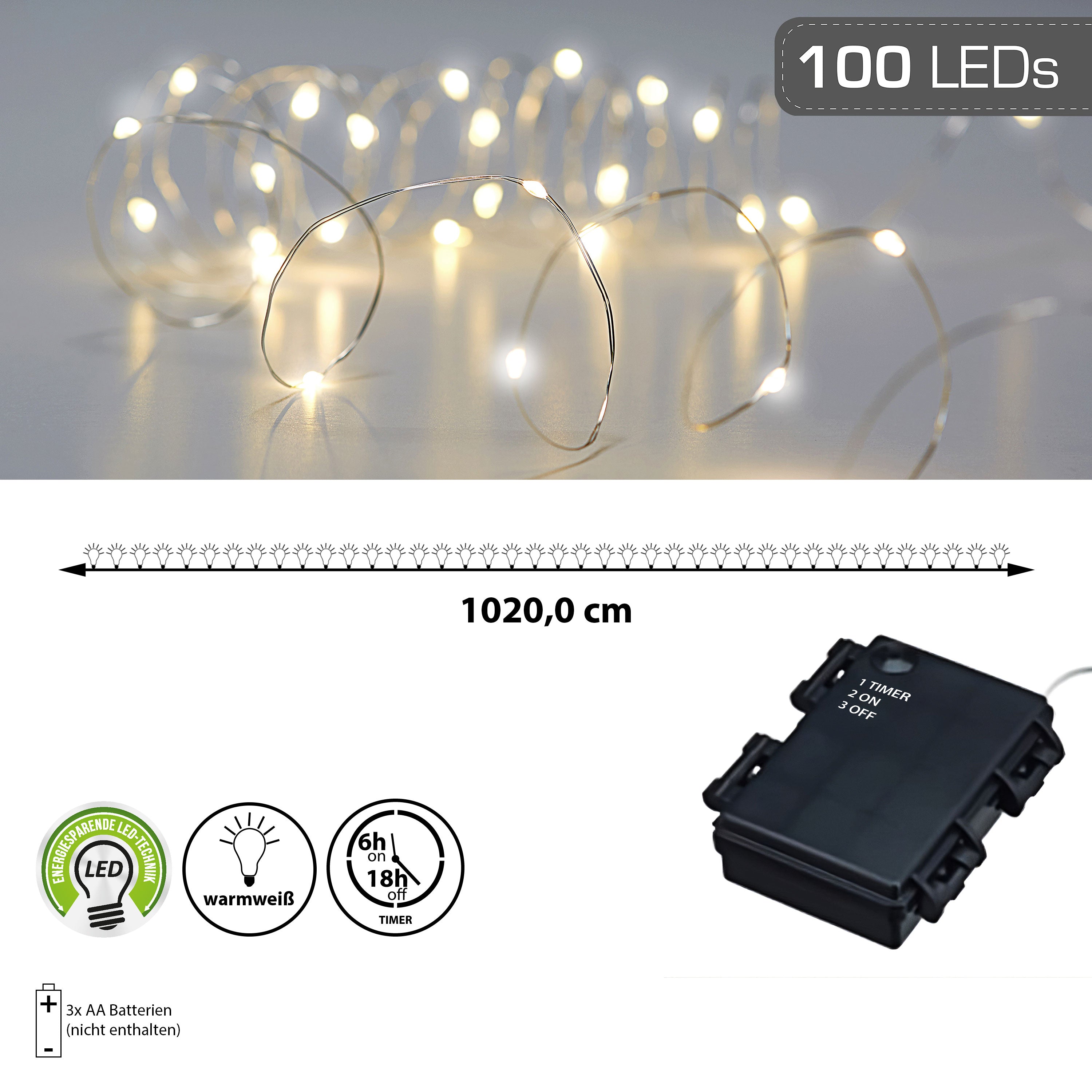 Lichterkette Outdoor 1020cm 100 LEDs warmweiß Silberdraht Timerfunktion batteriebetrieben Weihnachtsbeleuchtung Leuchtdraht